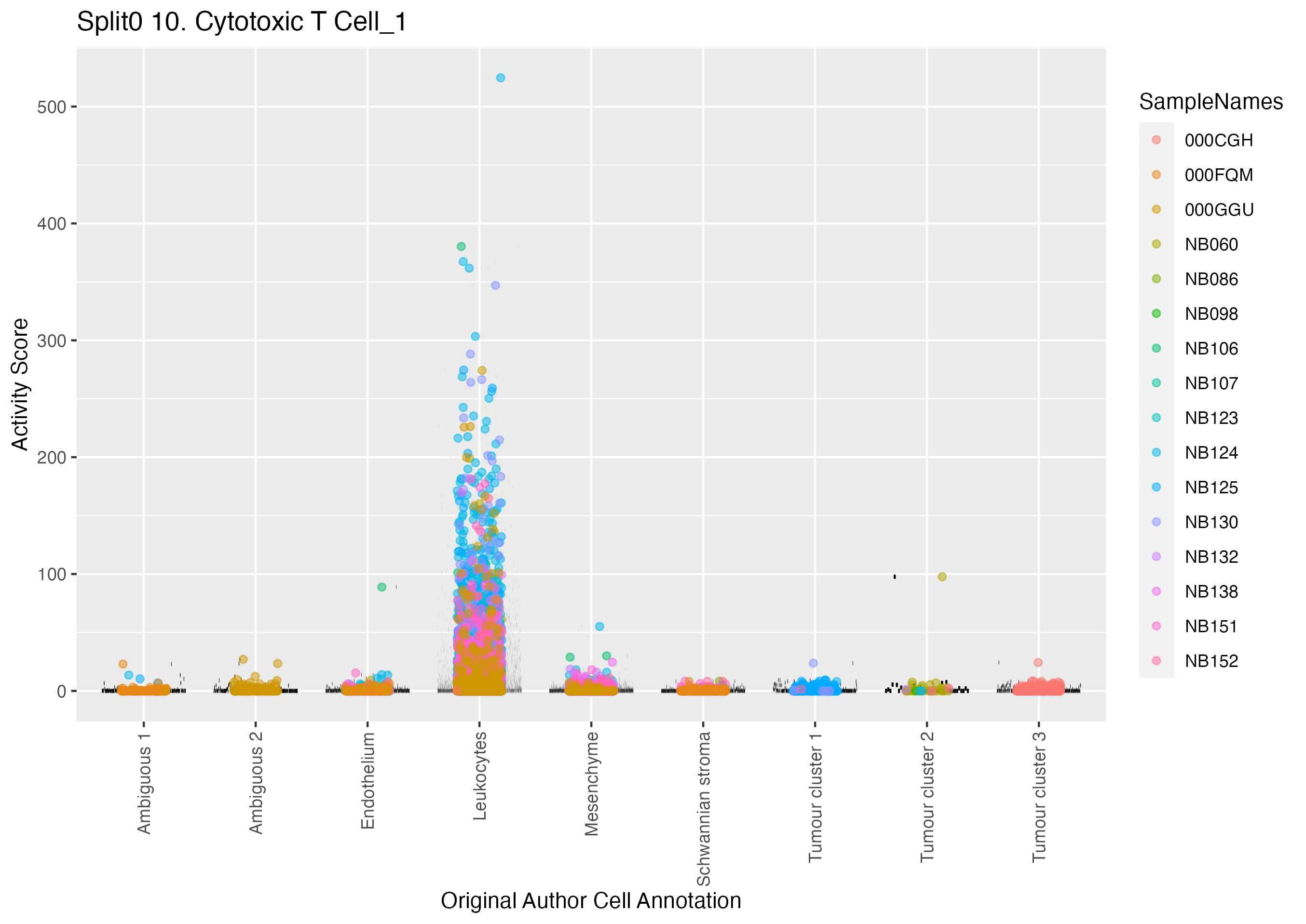 UMAP plots showing activity of gene expression program identified in community:10. Cytotoxic T Cell