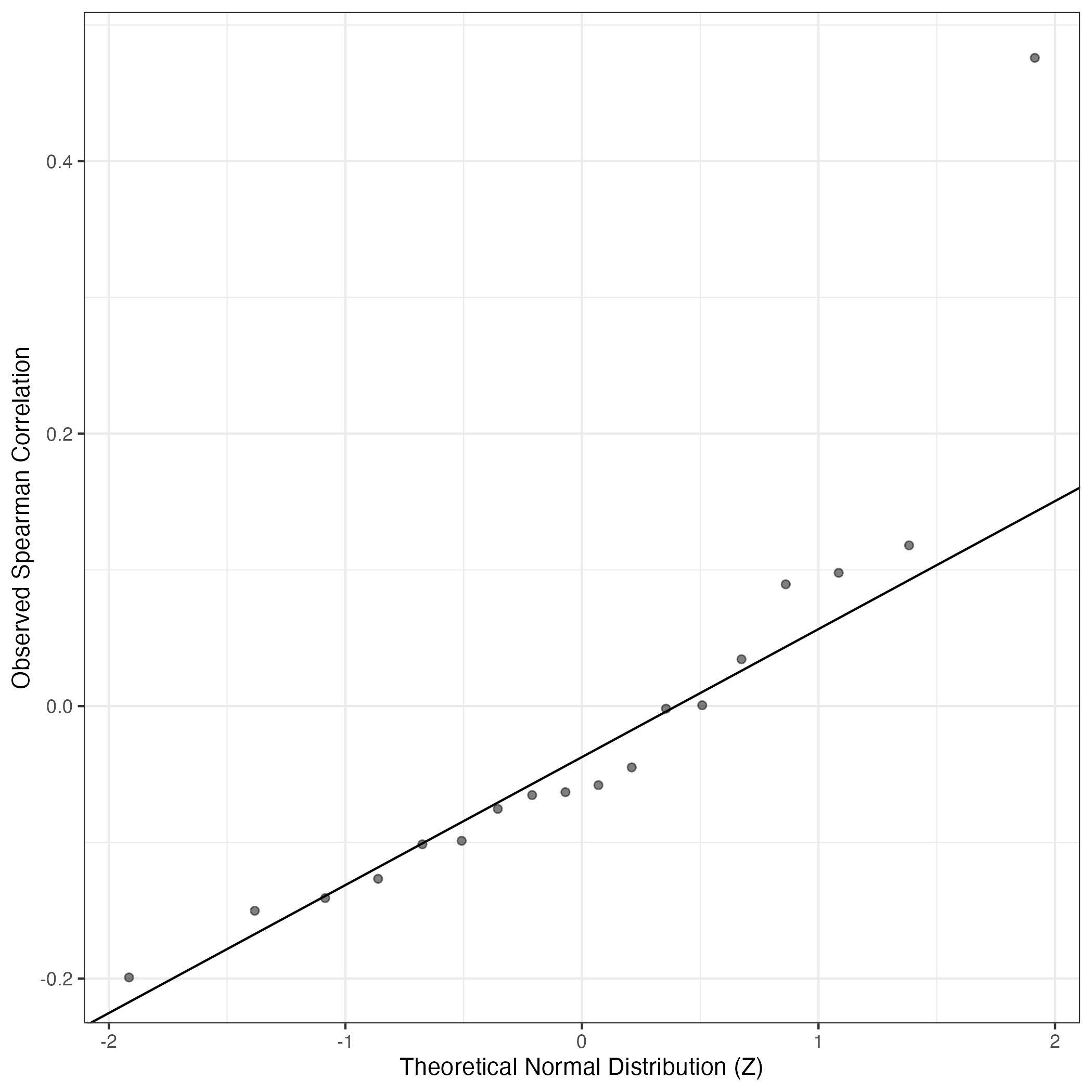 QQ-plot of gene loadings, averaged over both independent splits of the data