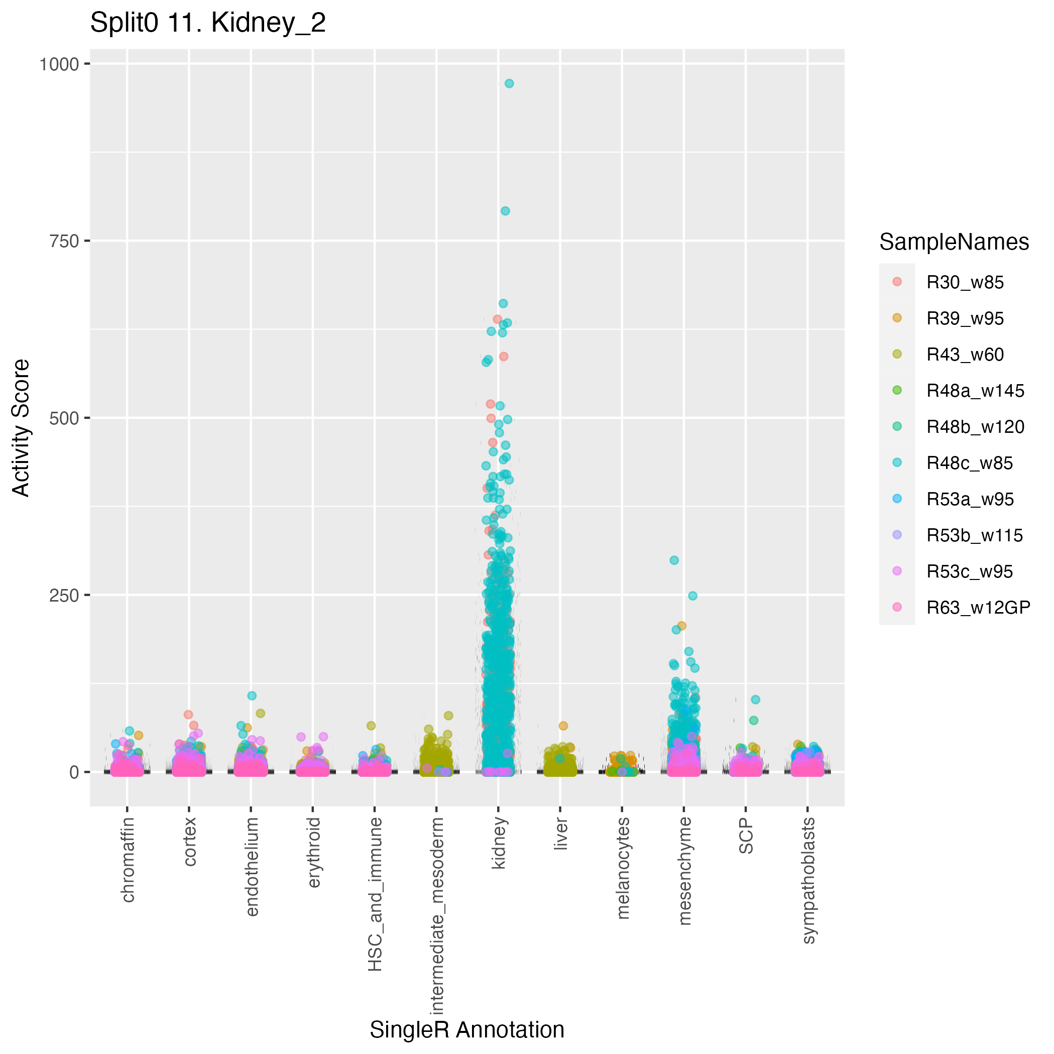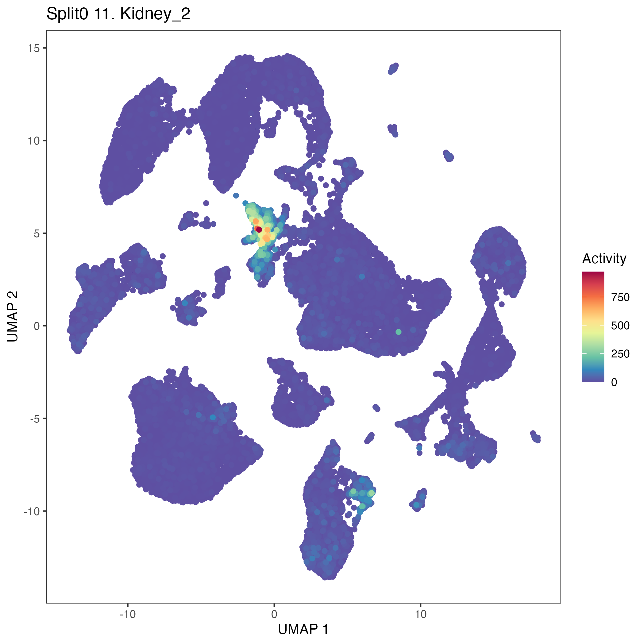 UMAP plots showing activity of gene expression program identified in GEP 11. Kidney: