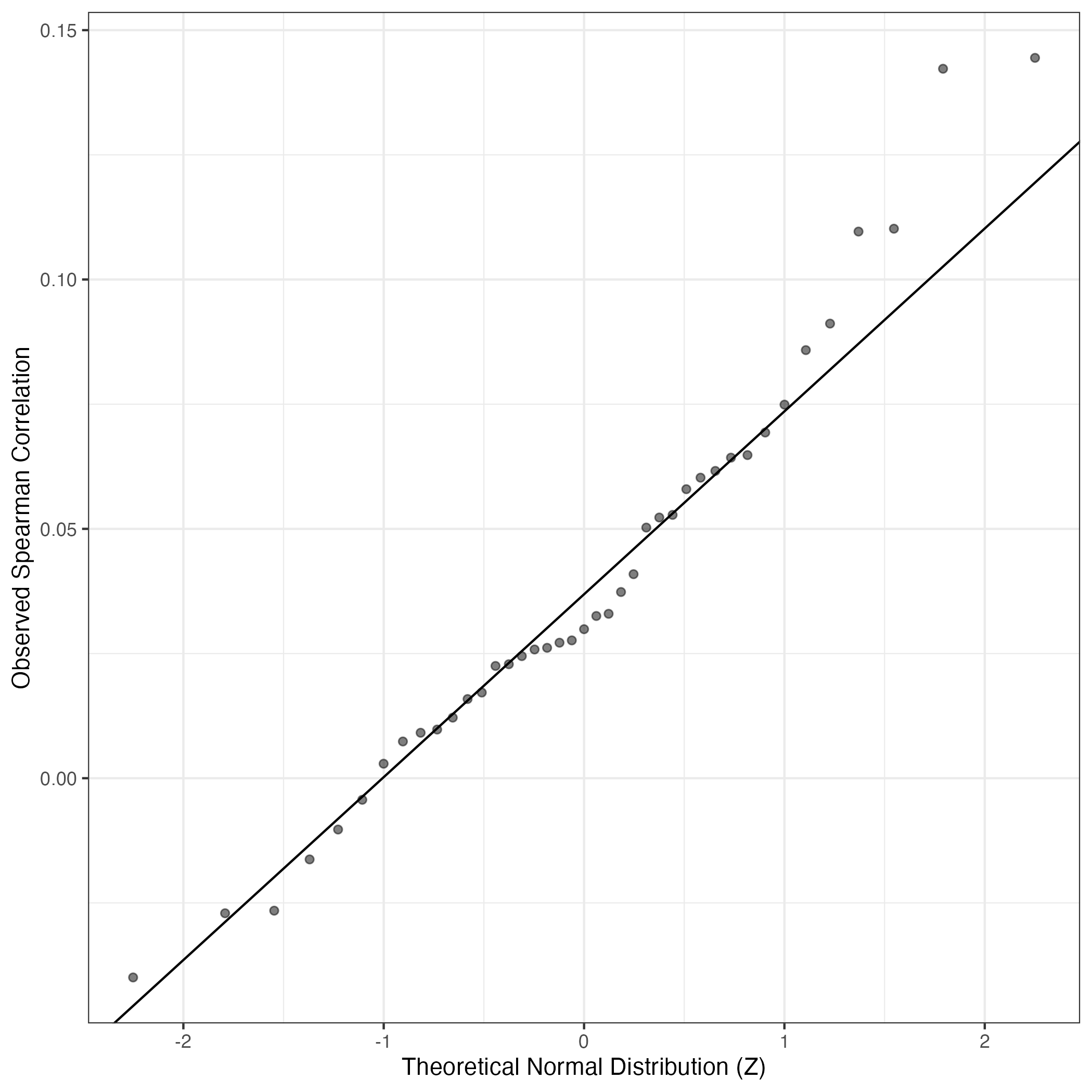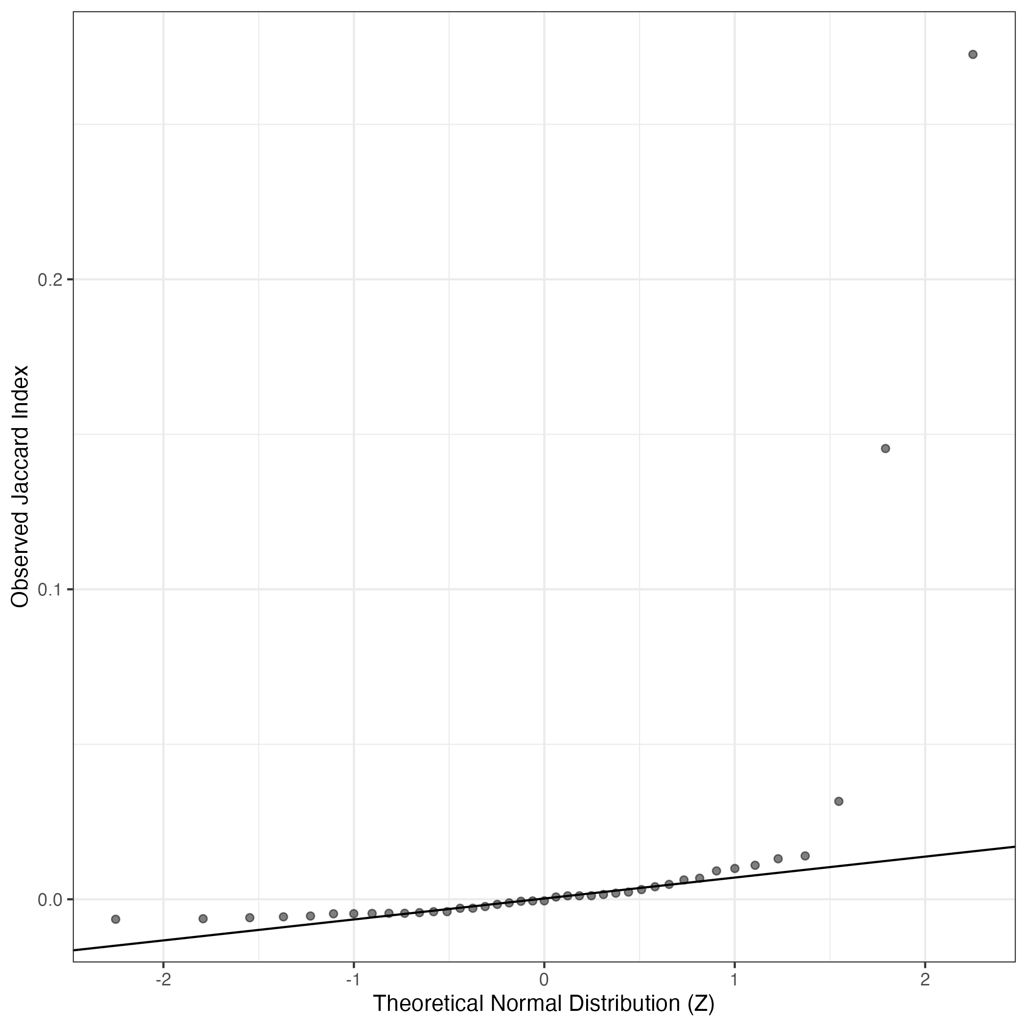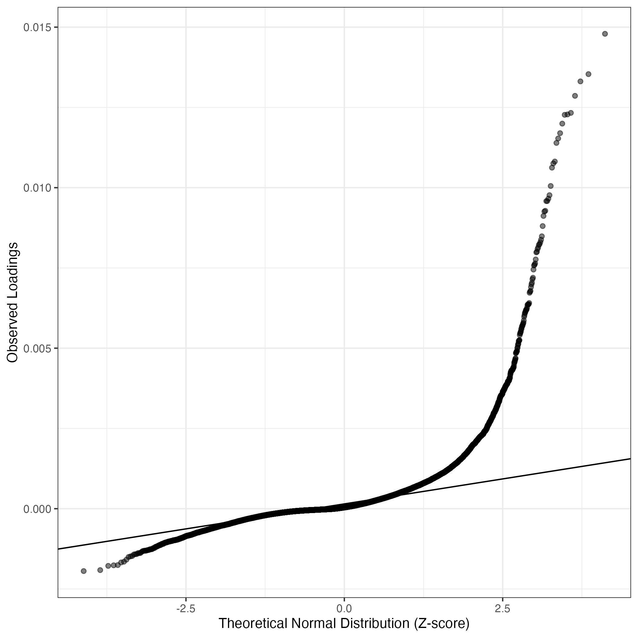 QQ-plot of gene loadings, averaged over both independent splits of the data