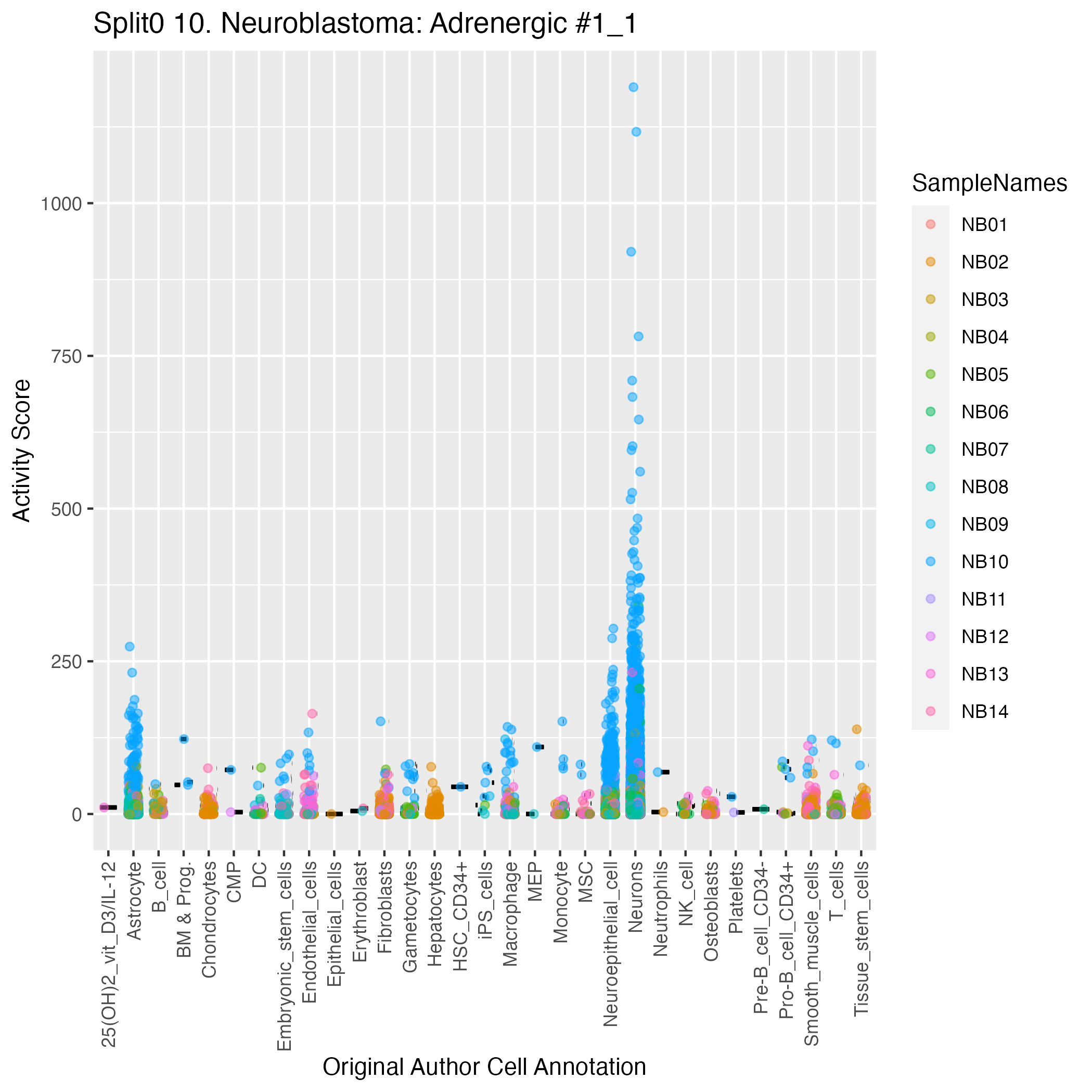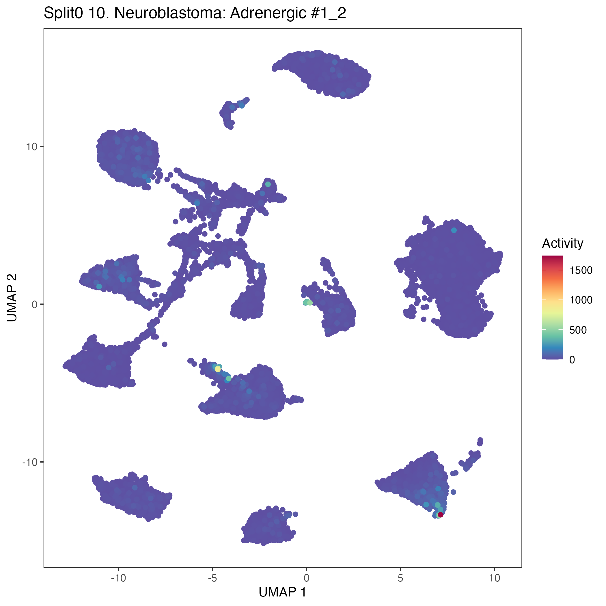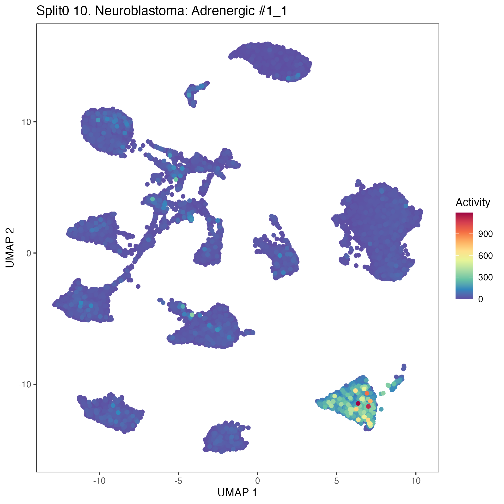 UMAP plots showing activity of gene expression program identified in community:10. Neuroblastoma: Adrenergic #1