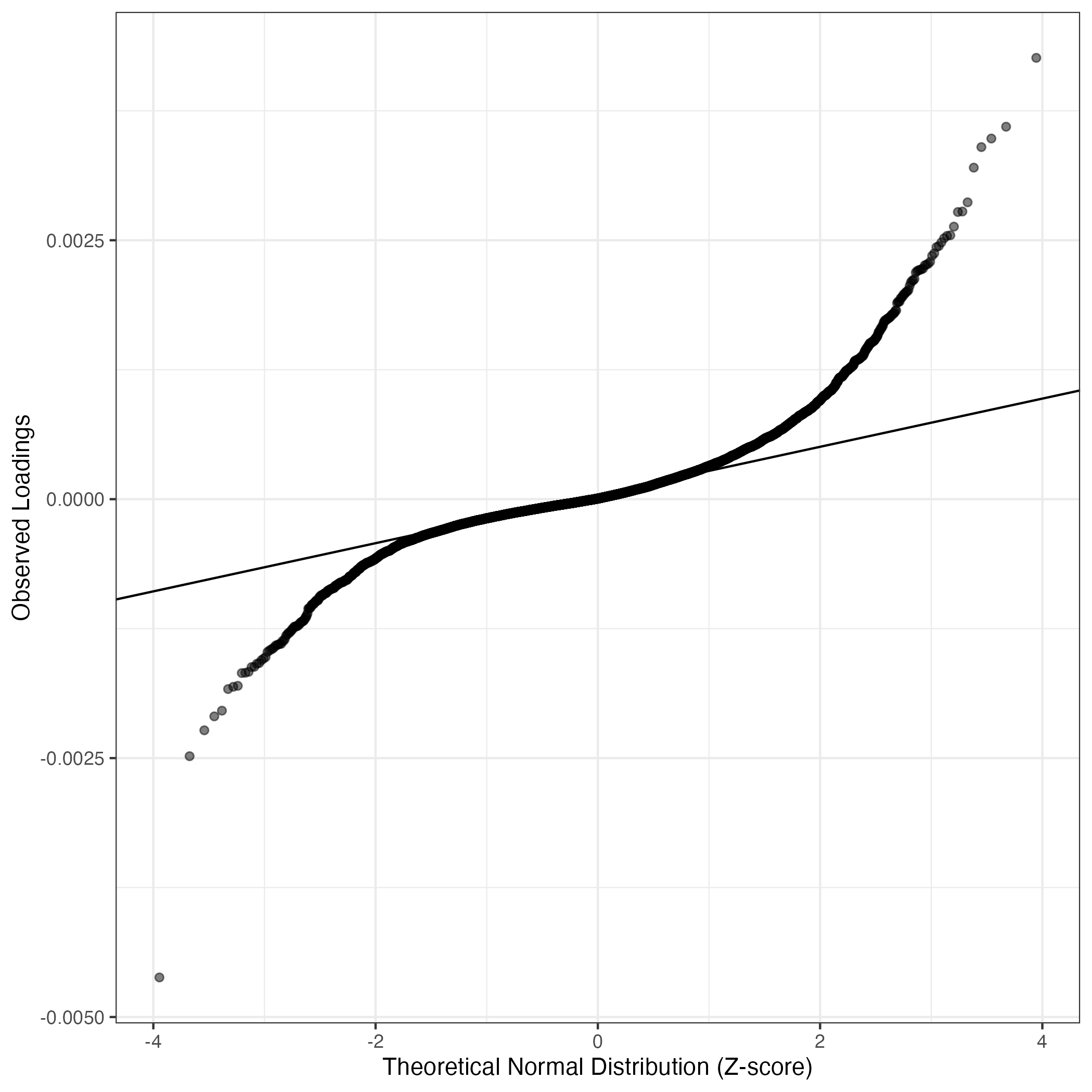QQ-plot of gene loadings, averaged over both independent splits of the data