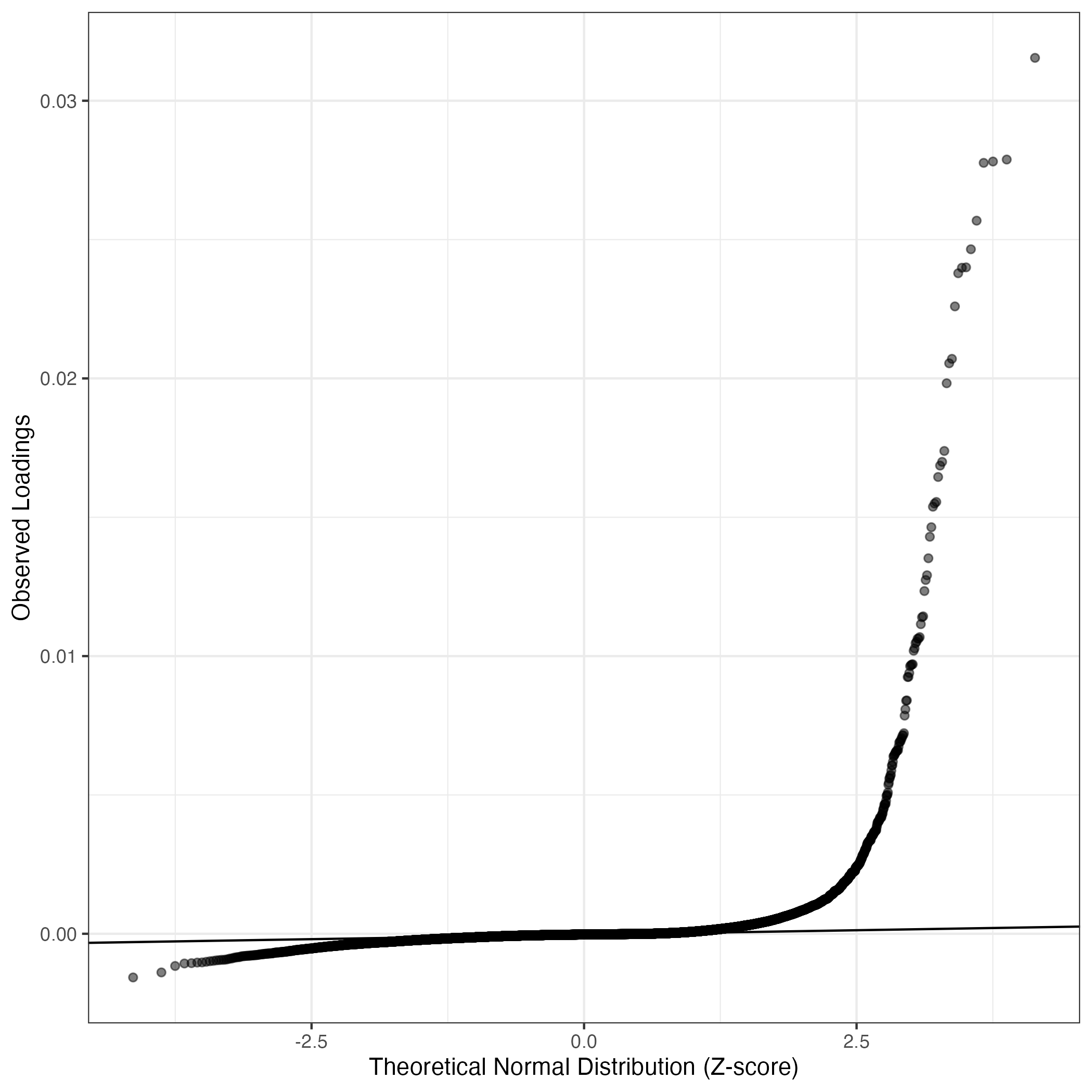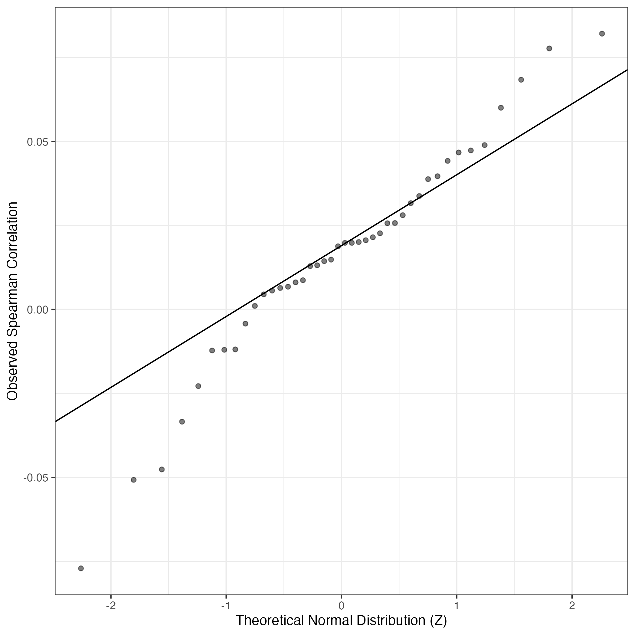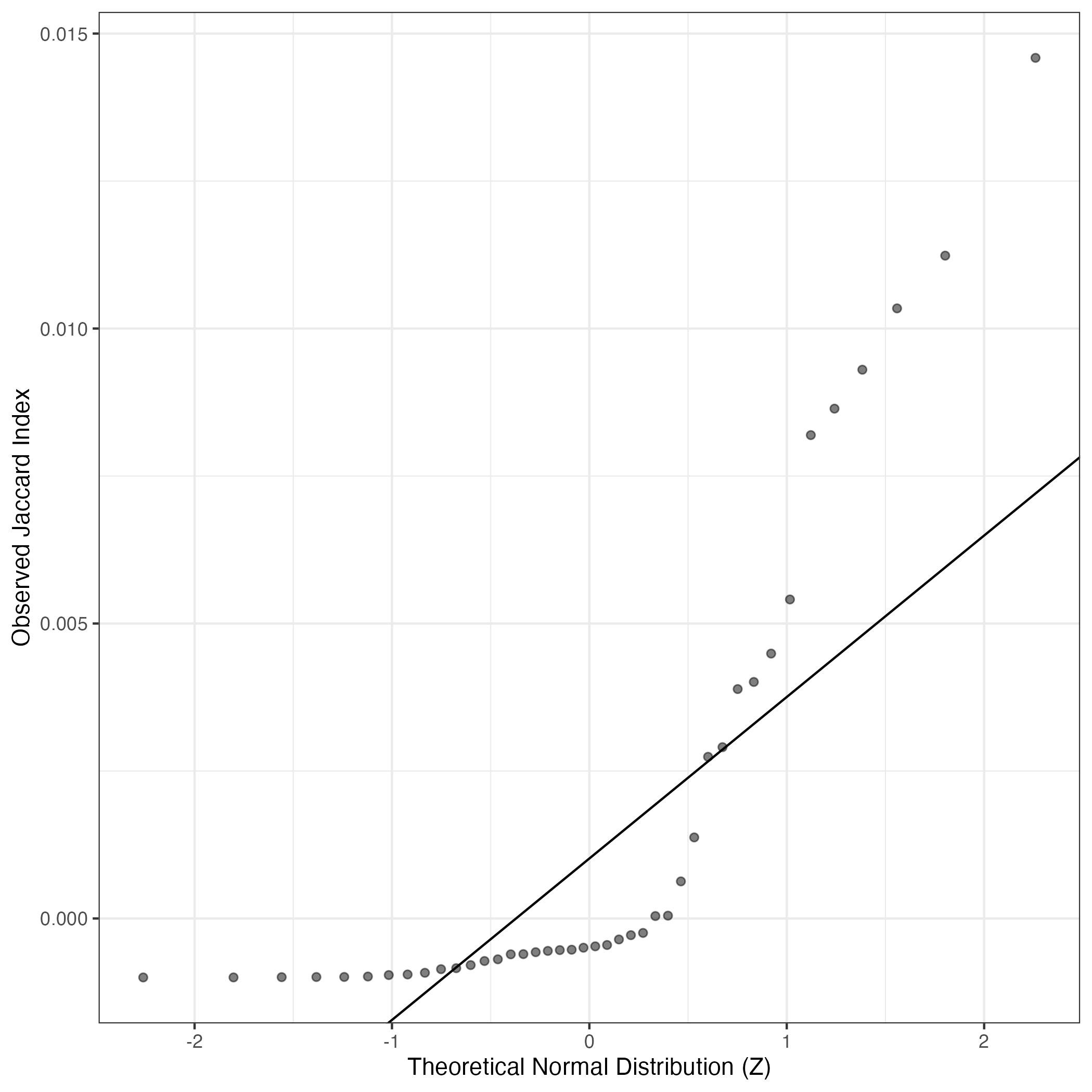 A similar QQ-plot as above, but only for instances where the H value is e.g. > 25, i.e. we are confident that the expression program is active above noise. Agreemenet between these binary vectors is tested using the Jaccard Index, with the P-values calculated by an exact test: