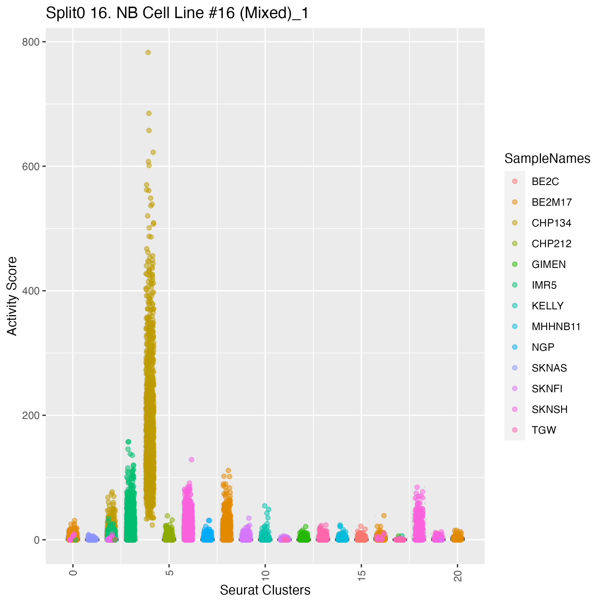 UMAP plots showing activity of gene expression program identified in community:16. NB Cell Line #16 (Mixed)