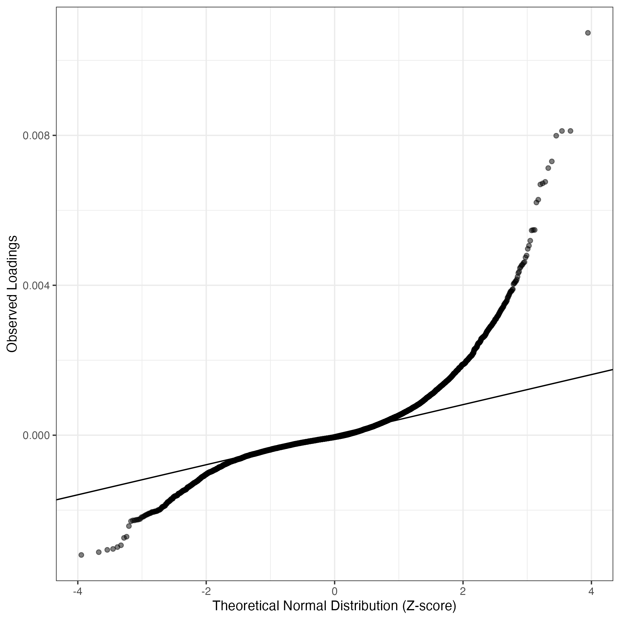 QQ-plot of gene loadings, averaged over both independent splits of the data