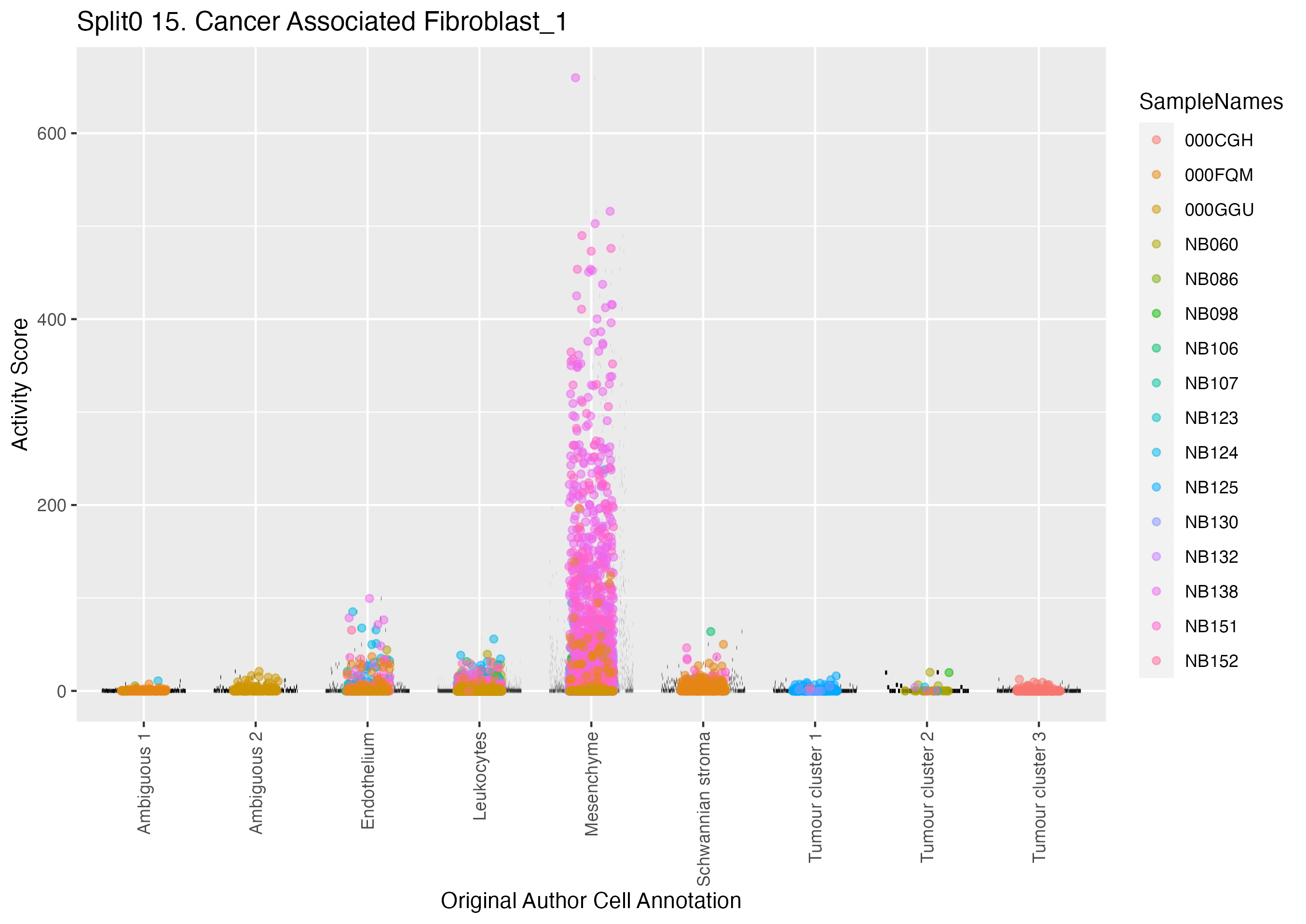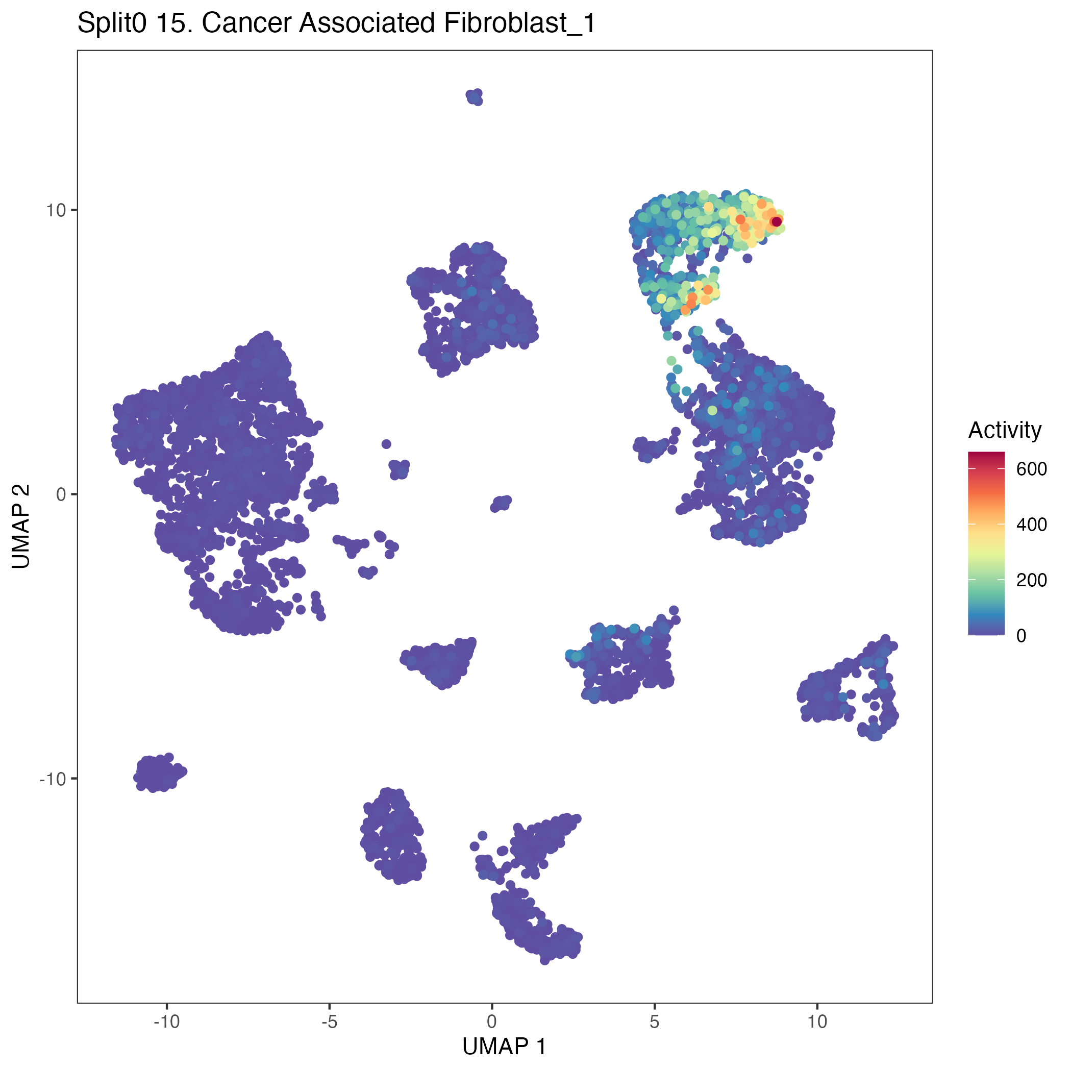 UMAP plots showing activity of gene expression program identified in community:15. Cancer Associated Fibroblast