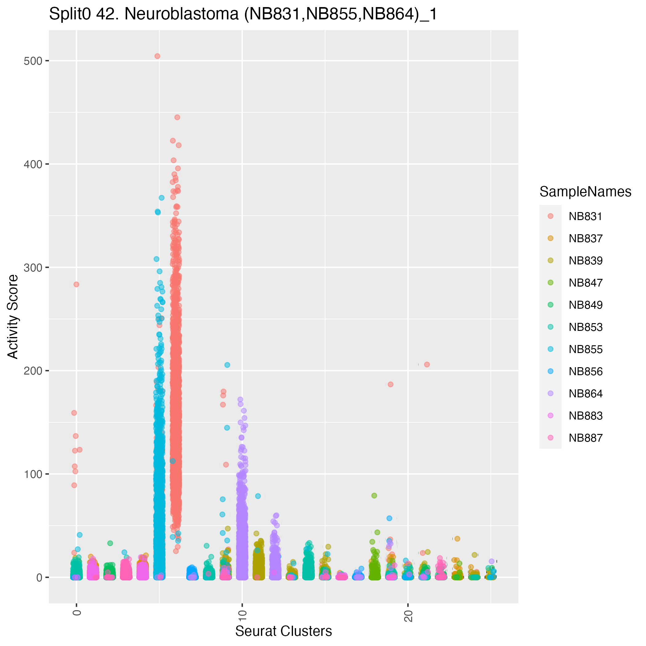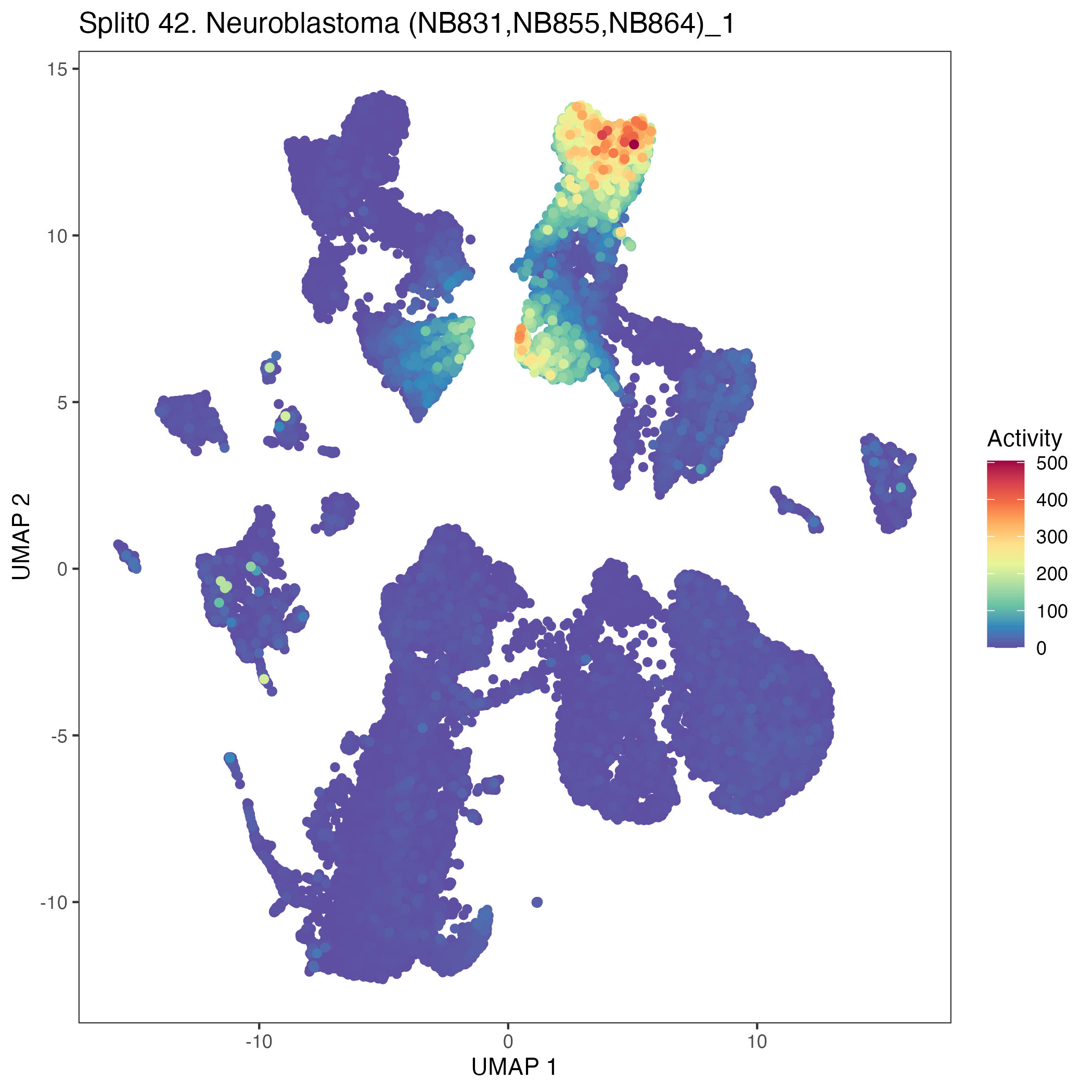 UMAP plots showing activity of gene expression program identified in community:42. Neuroblastoma (NB831,NB855,NB864)