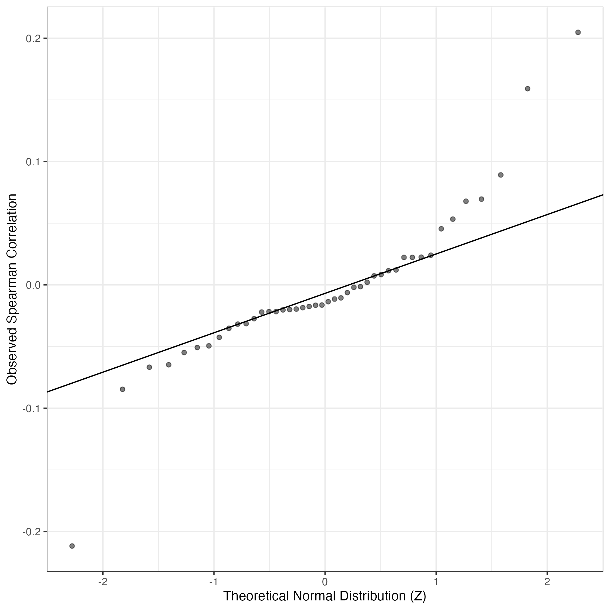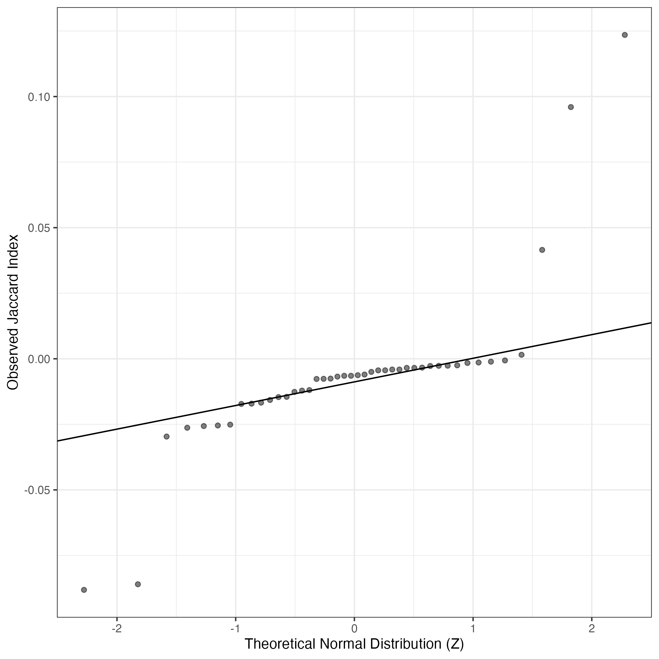 QQ-plot of gene loadings, averaged over both independent splits of the data