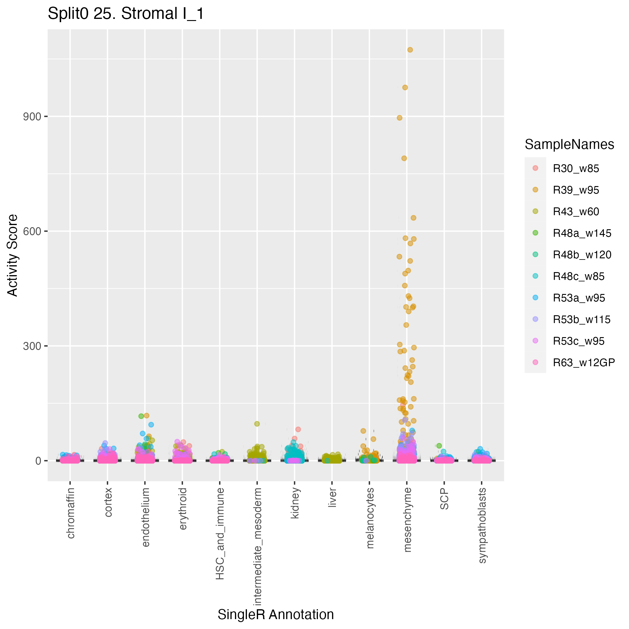 UMAP plots showing activity of gene expression program identified in GEP 25. Stromal I: