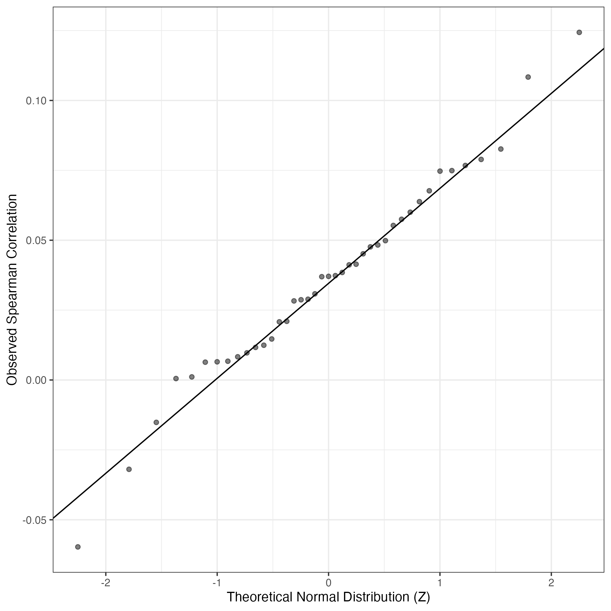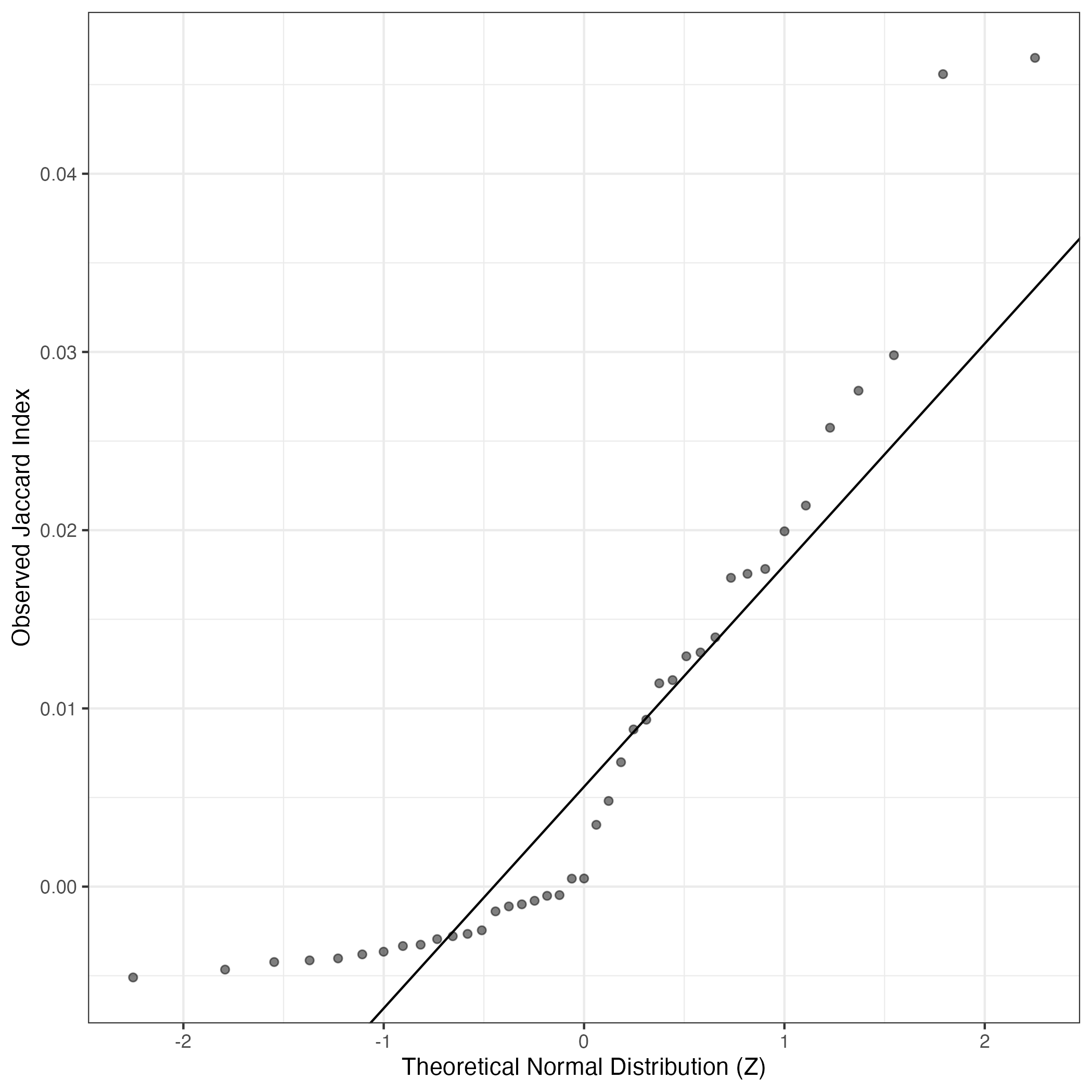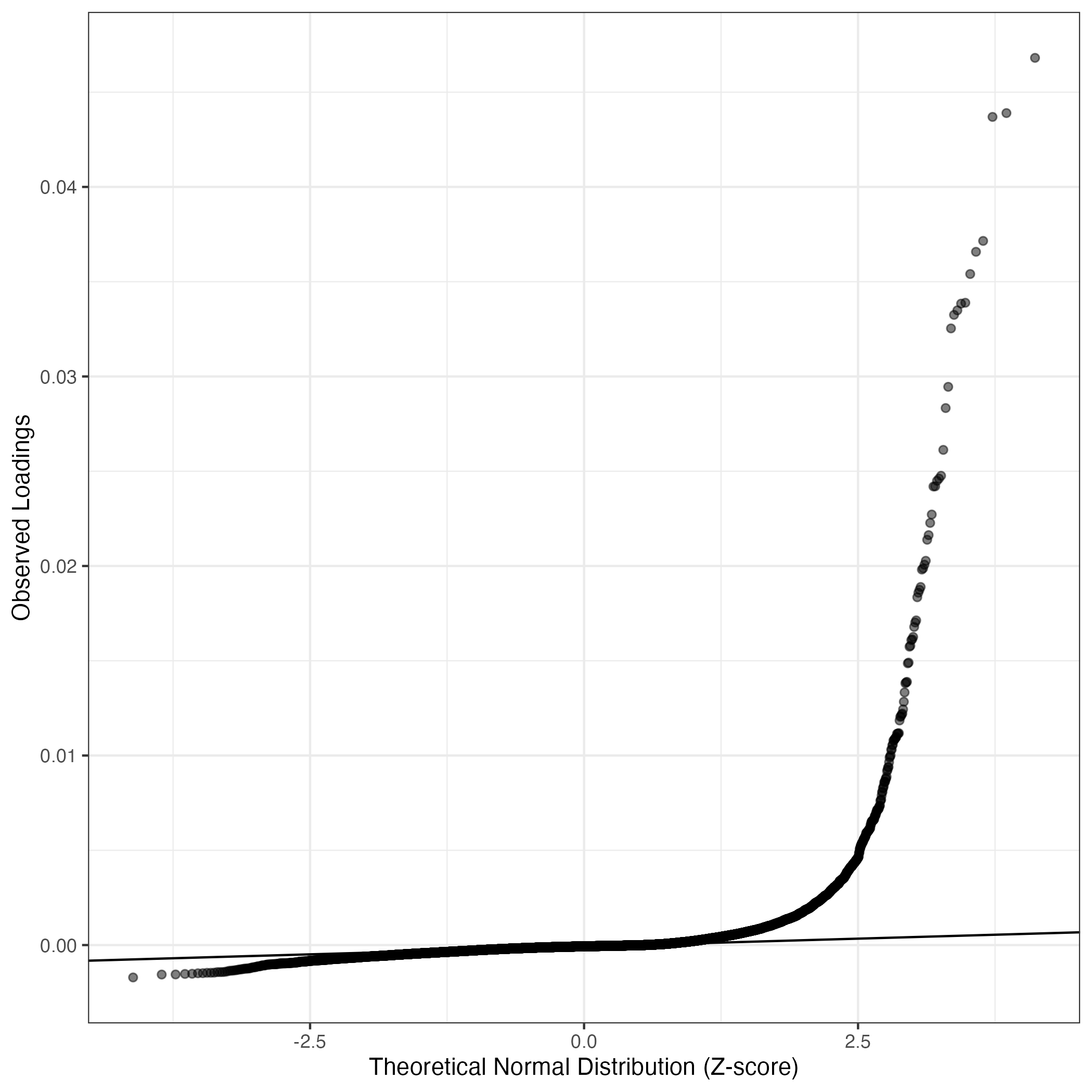 QQ-plot of gene loadings, averaged over both independent splits of the data