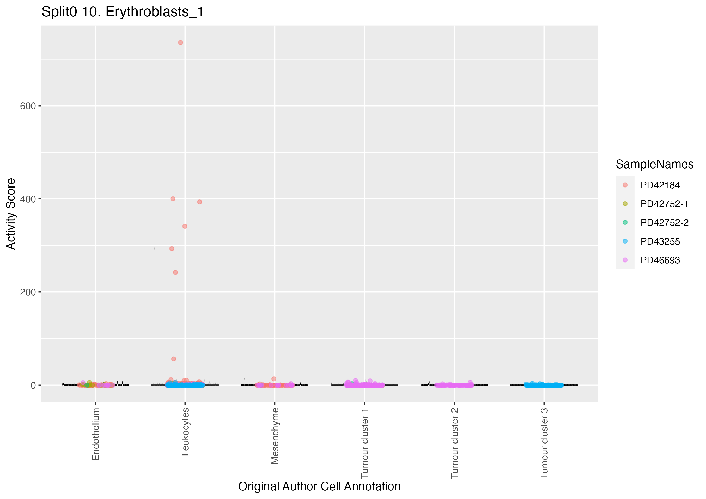 Erythroid: Early erythroid (model markers) early erythroid cells which are committed to erythroid lineage cells: Wilcoxon ranksum test P-value for gene set overrepresentation: 7.96e-01 Mean rank of genes in gene set: 7771 Rank on gene expression program of genes in gene set: