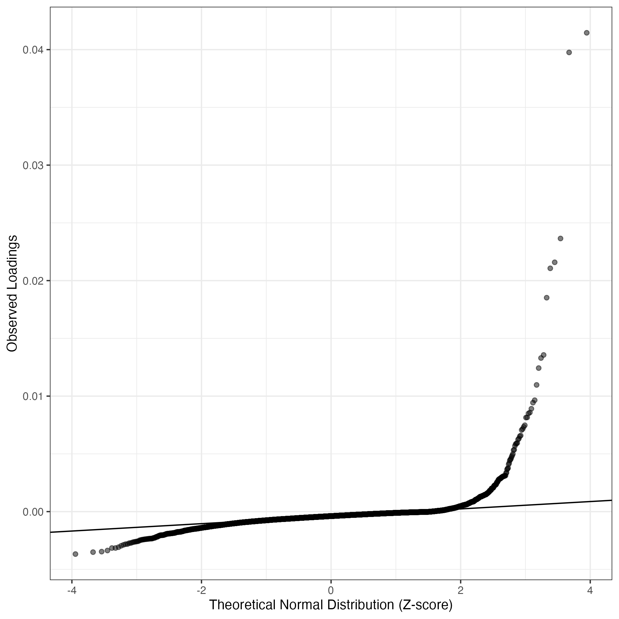 A similar QQ-plot as above, but only for instances where the H value is e.g. > 25, i.e. we are confident that the expression program is active above noise. Agreemenet between these binary vectors is tested using the Jaccard Index, with the P-values calculated by an exact test:
