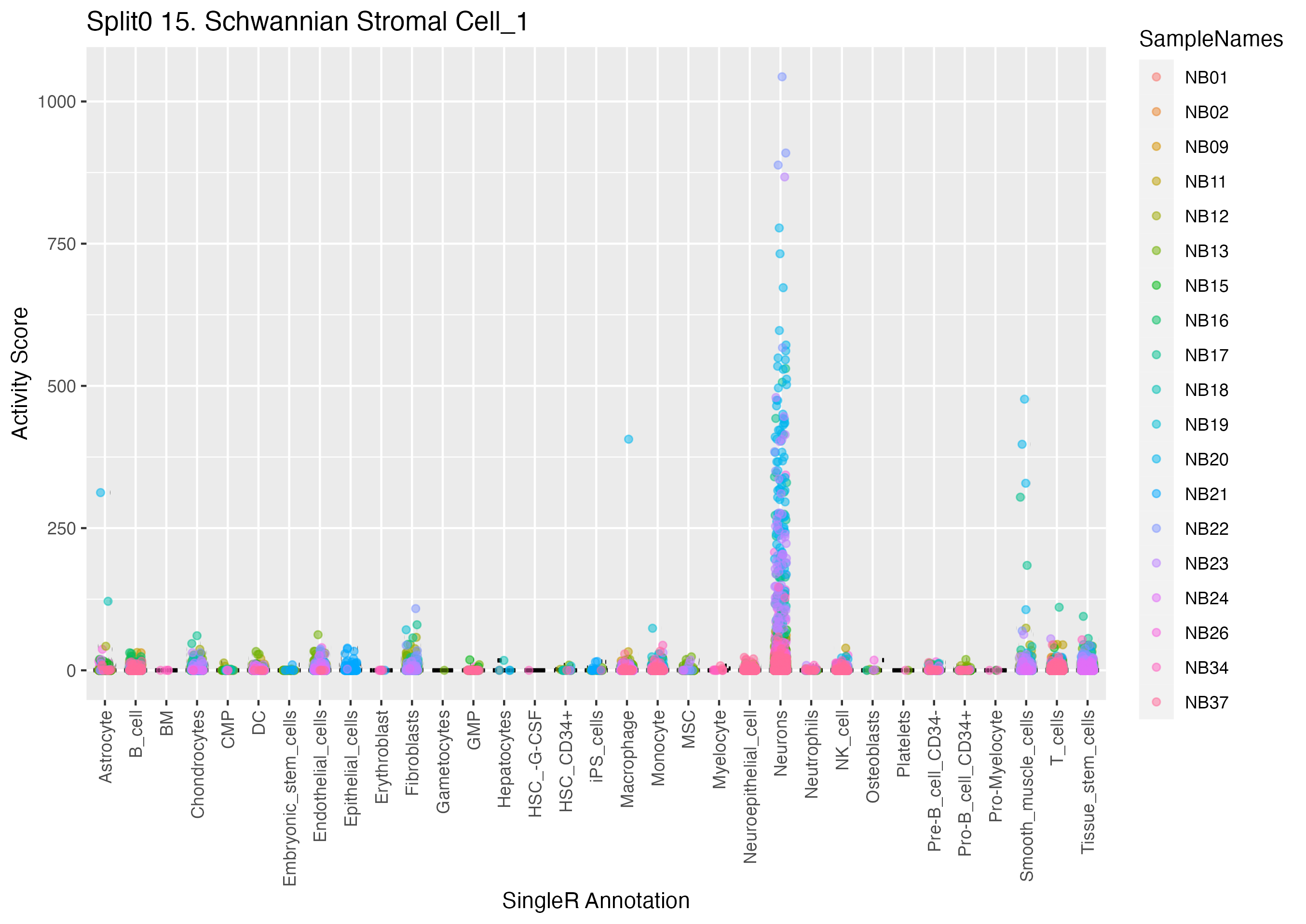 Normal Schwann cell precurors, but not Neuroblastoma Scps (Olsen) Based on their neuroblastoma data and stated on page 6 of the main text of Olsen et al. https://www.biorxiv.org/content/10.1101/2020.05.04.077057v1: Wilcoxon ranksum test P-value for gene set overrepresentation: 9.48e-01 Mean rank of genes in gene set: 23611 Rank on gene expression program of genes in gene set: