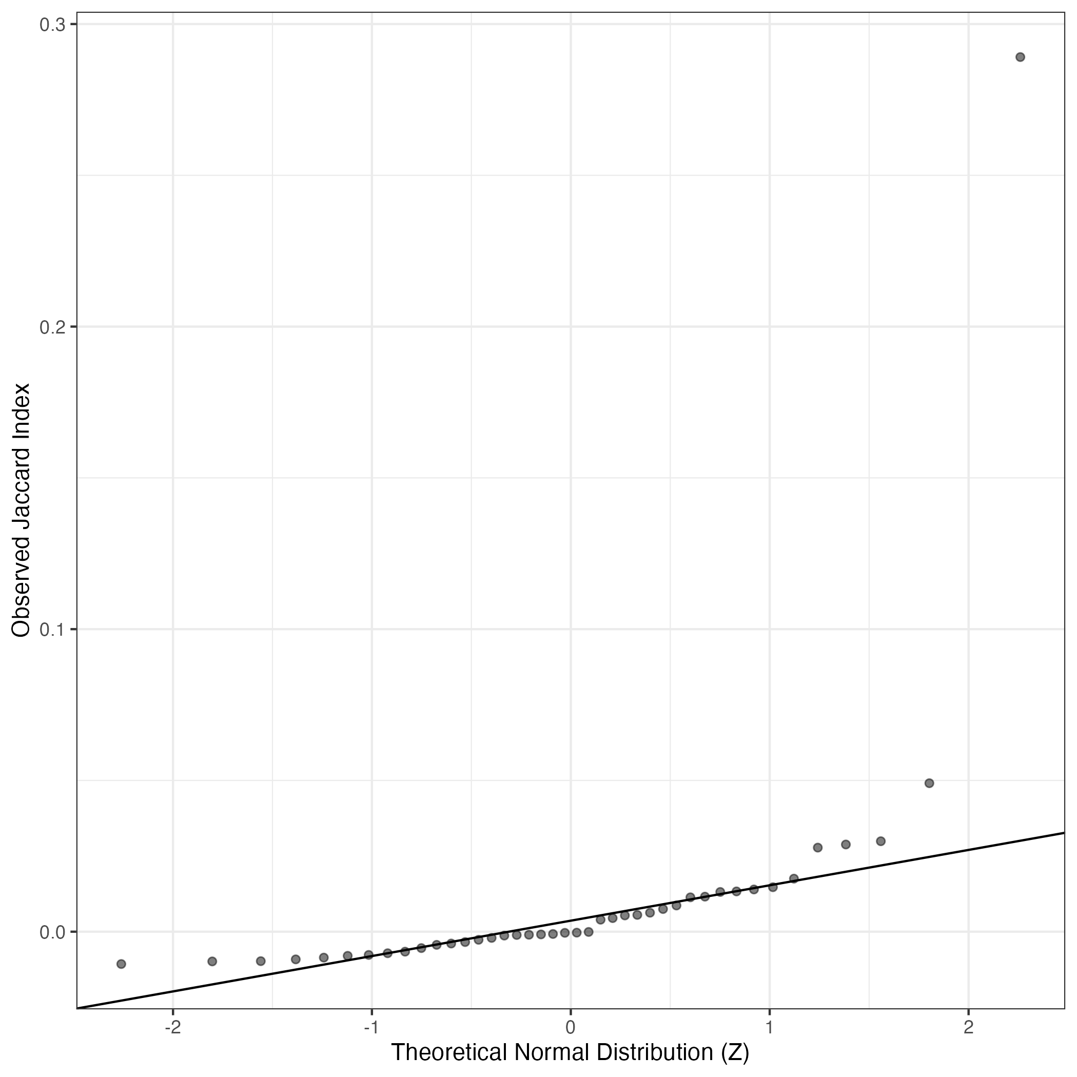A similar QQ-plot as above, but only for instances where the H value is e.g. > 25, i.e. we are confident that the expression program is active above noise. Agreemenet between these binary vectors is tested using the Jaccard Index, with the P-values calculated by an exact test: