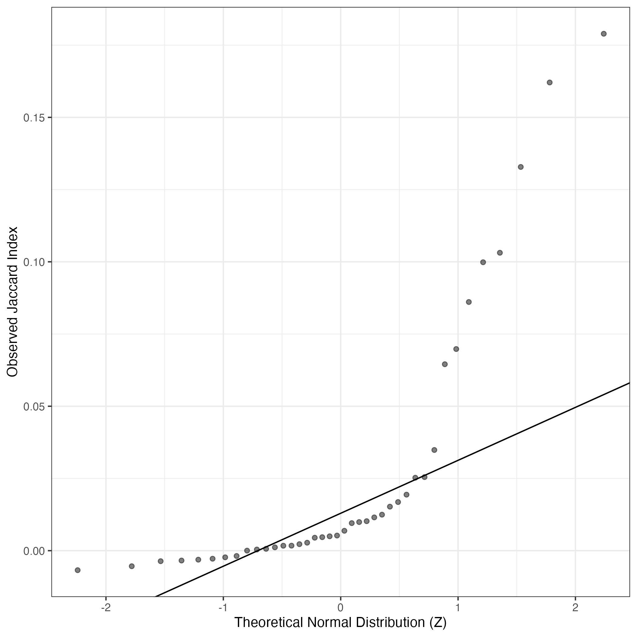 QQ-plot of gene loadings, averaged over both independent splits of the data
