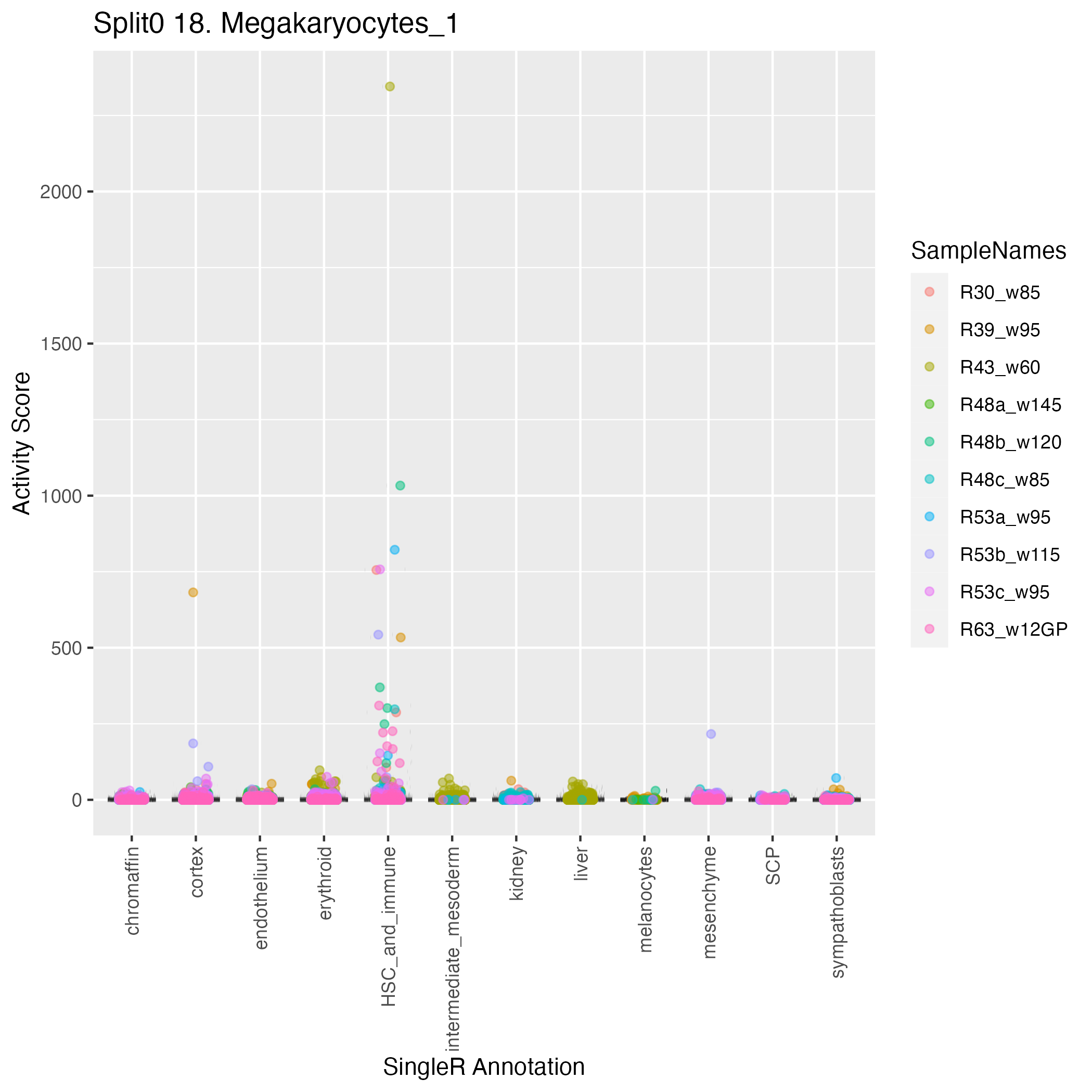 Erythroid: Early erythroid (model markers) early erythroid cells which are committed to erythroid lineage cells: Wilcoxon ranksum test P-value for gene set overrepresentation: 9.91e-01 Mean rank of genes in gene set: 18758.33 Rank on gene expression program of genes in gene set: