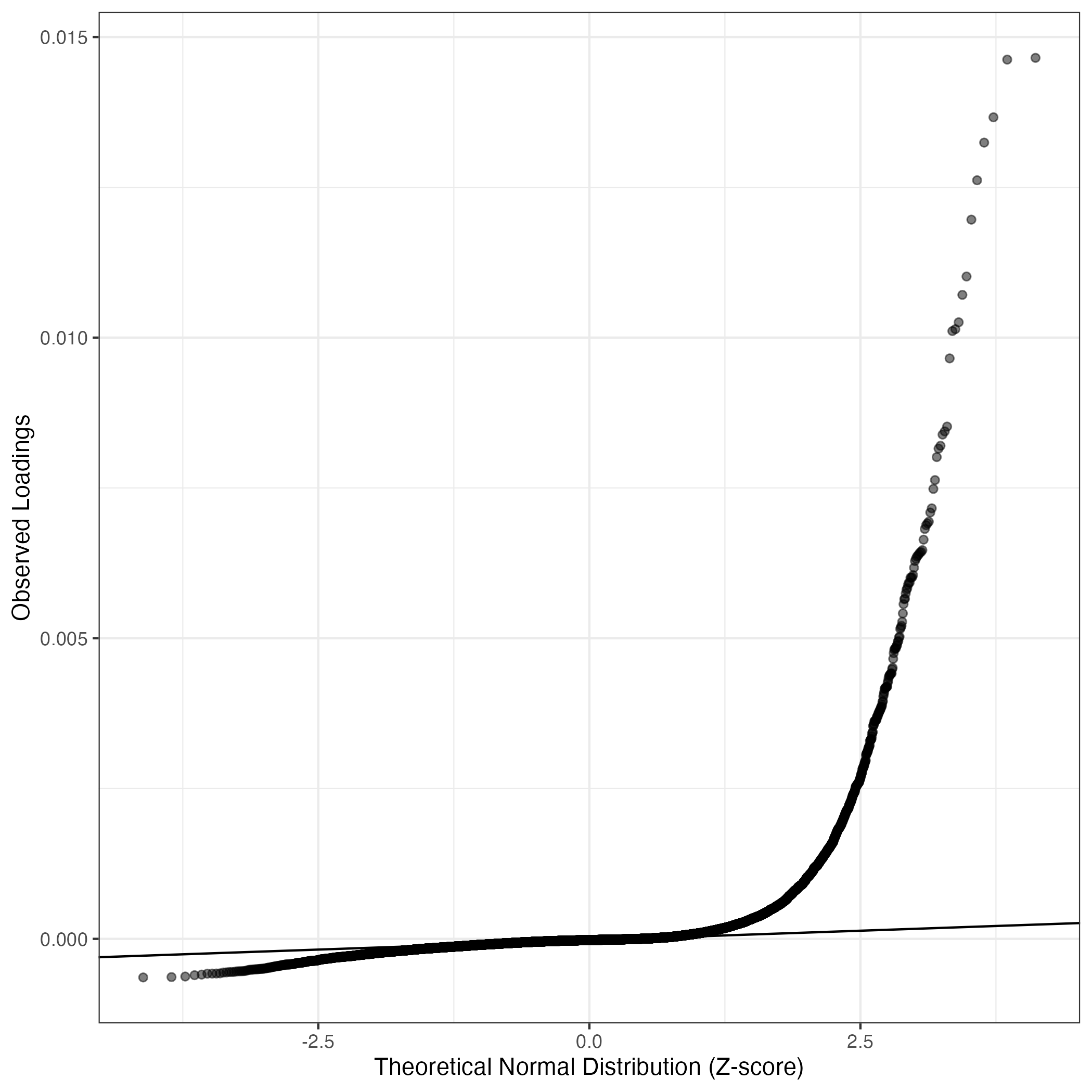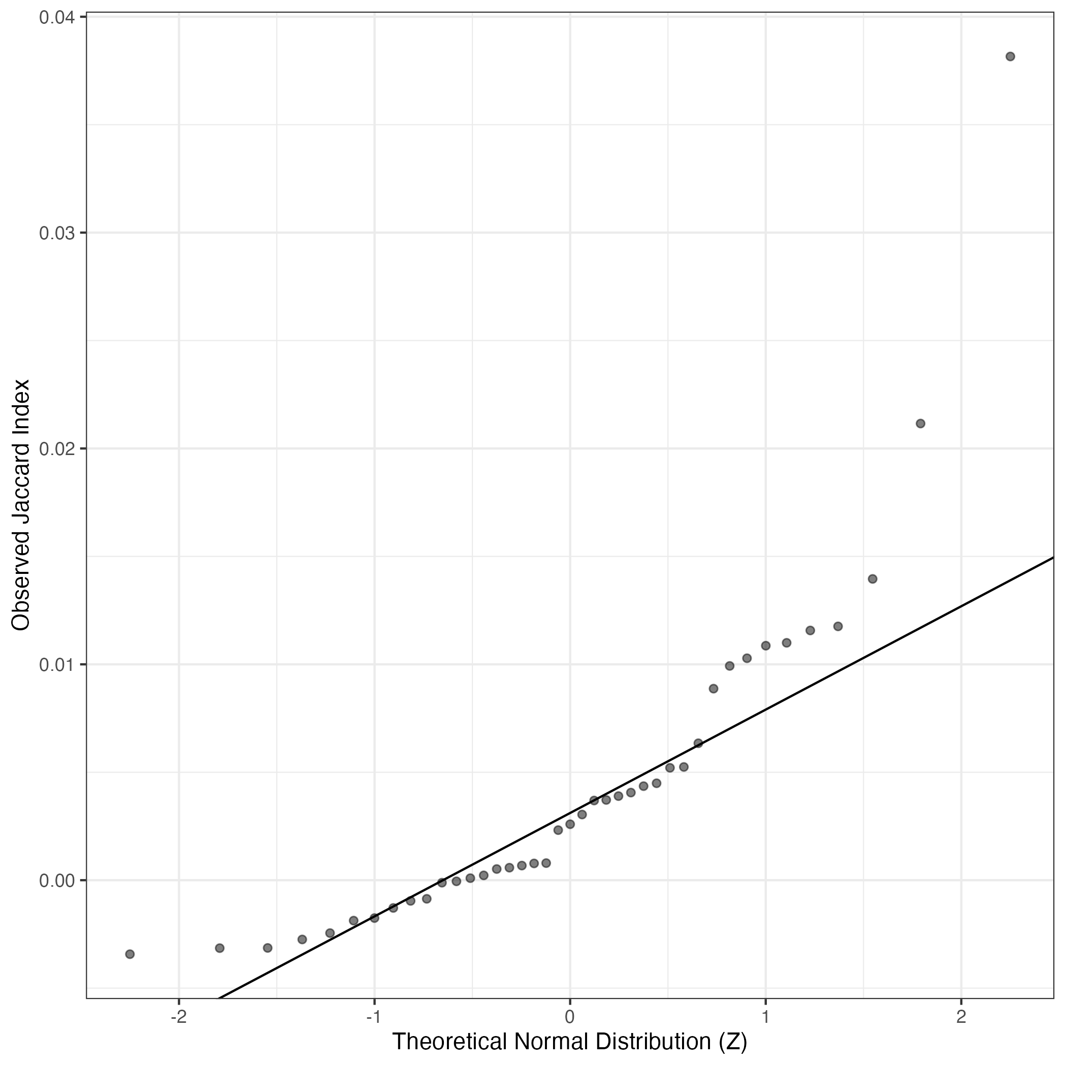 A similar QQ-plot as above, but only for instances where the H value is e.g. > 25, i.e. we are confident that the expression program is active above noise. Agreemenet between these binary vectors is tested using the Jaccard Index, with the P-values calculated by an exact test: