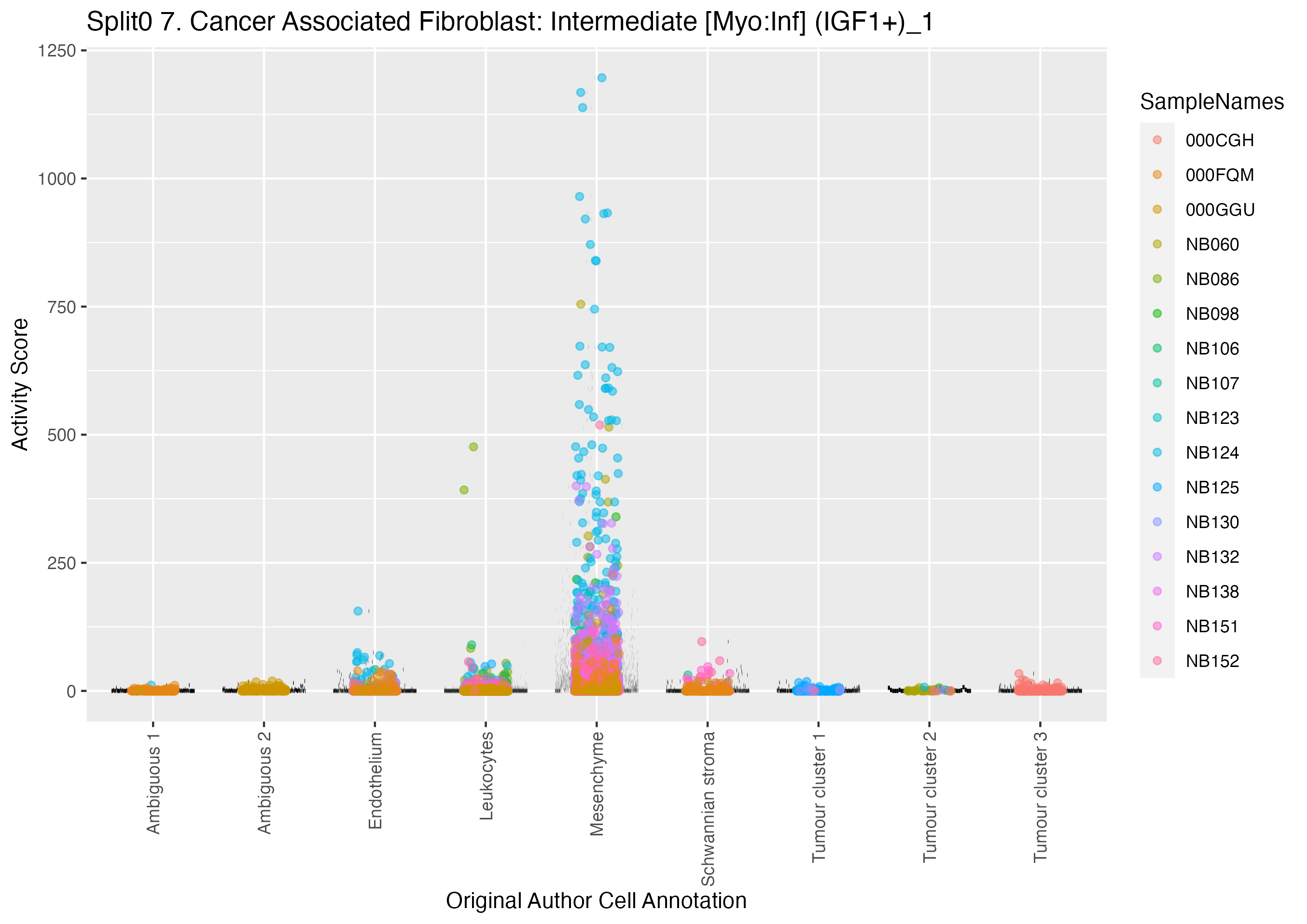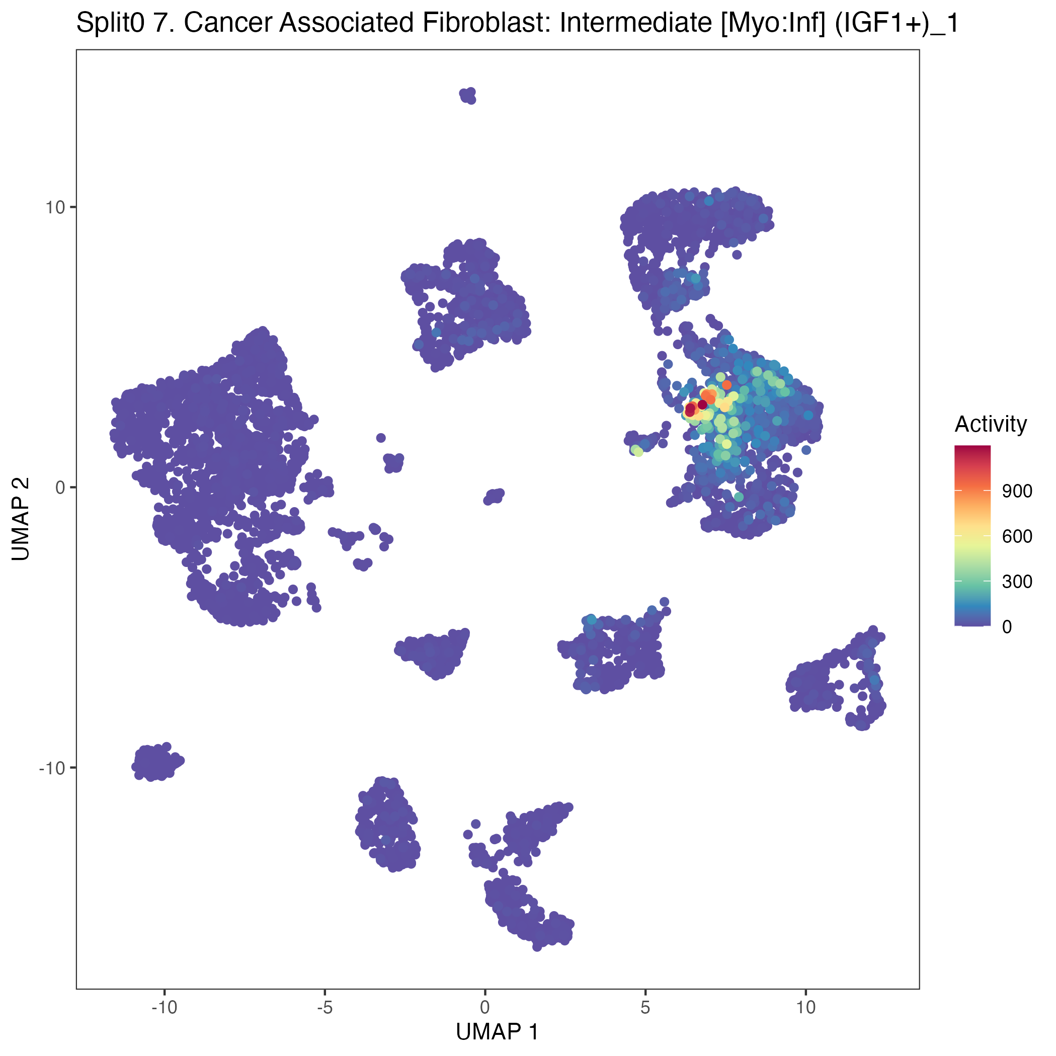 UMAP plots showing activity of gene expression program identified in community:7. Cancer Associated Fibroblast: Intermediate [Myo:Inf] (IGF1+)