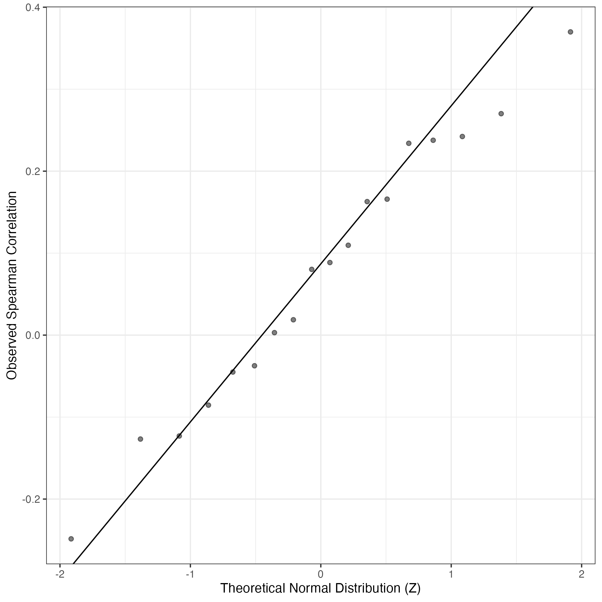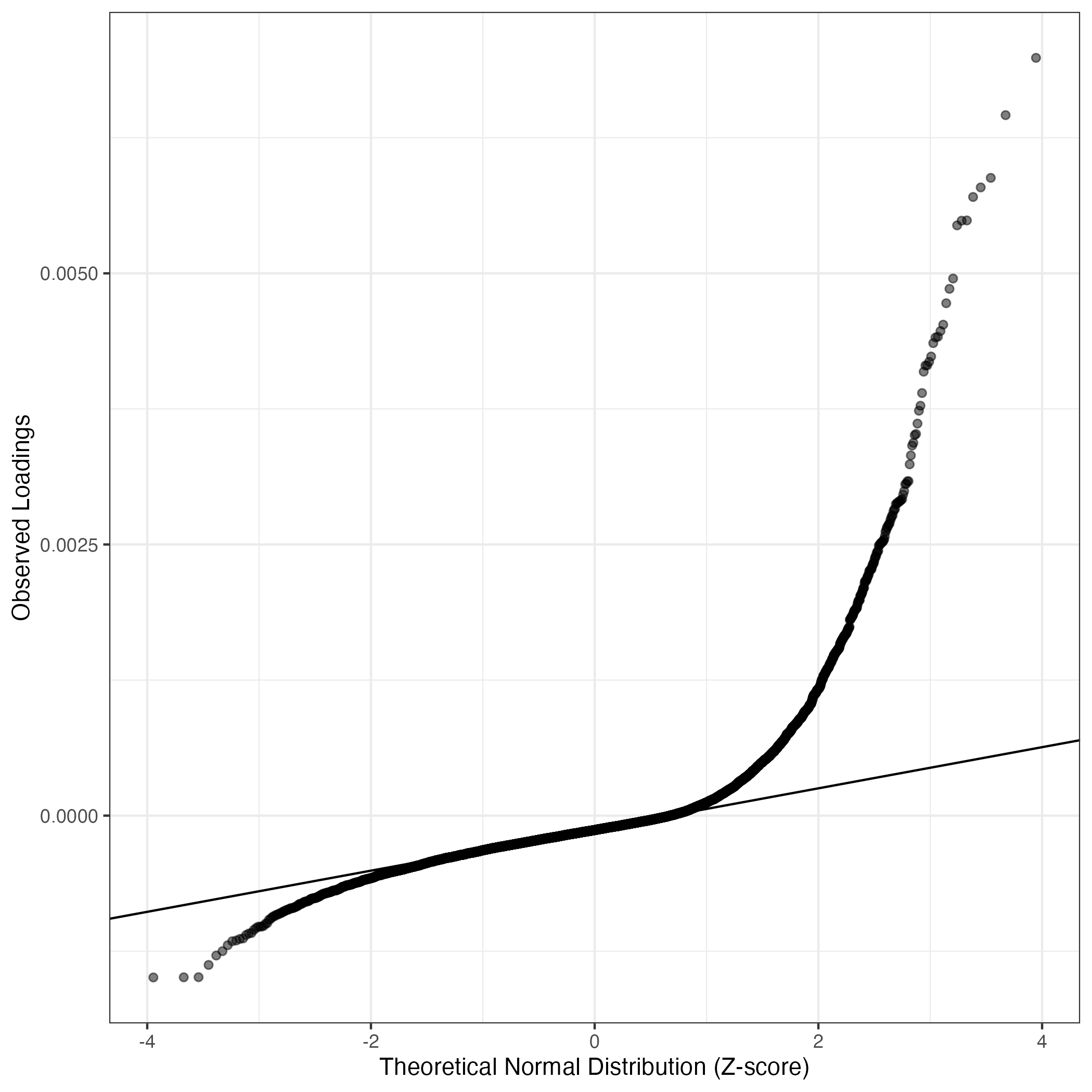 QQ-plot of gene loadings, averaged over both independent splits of the data
