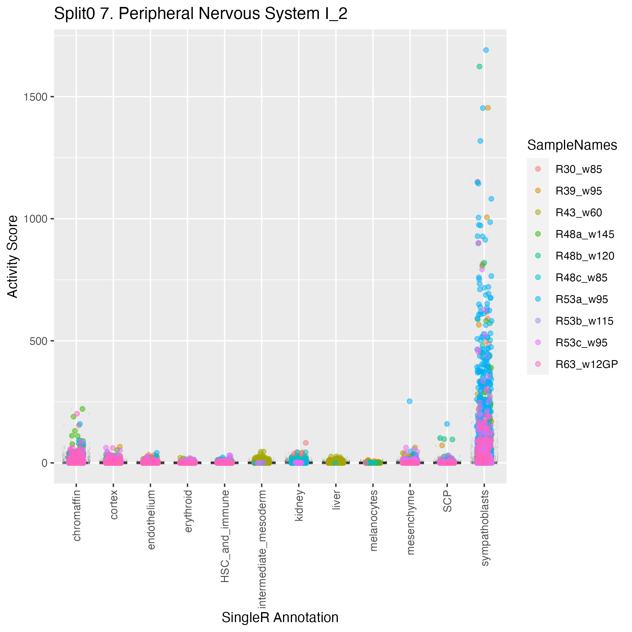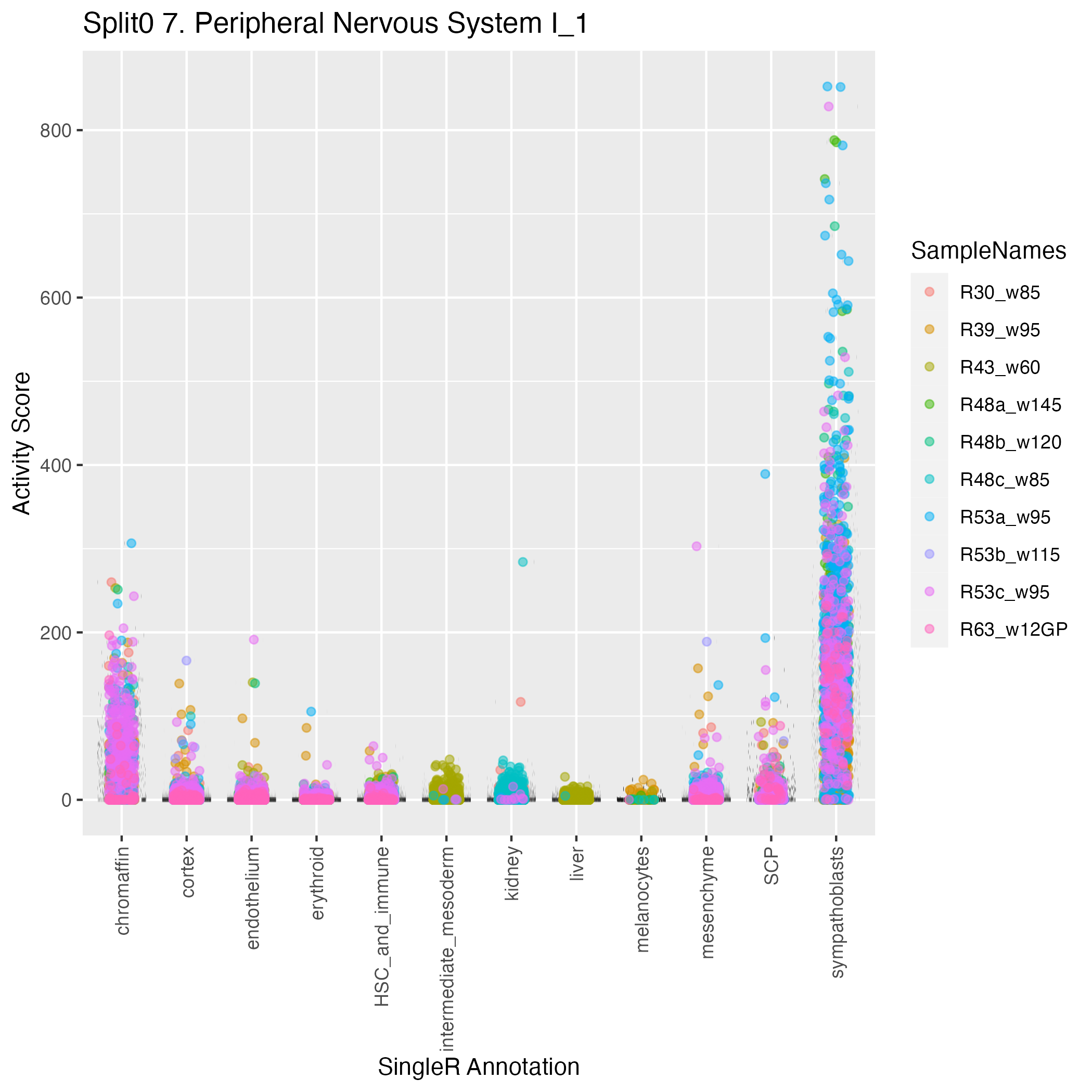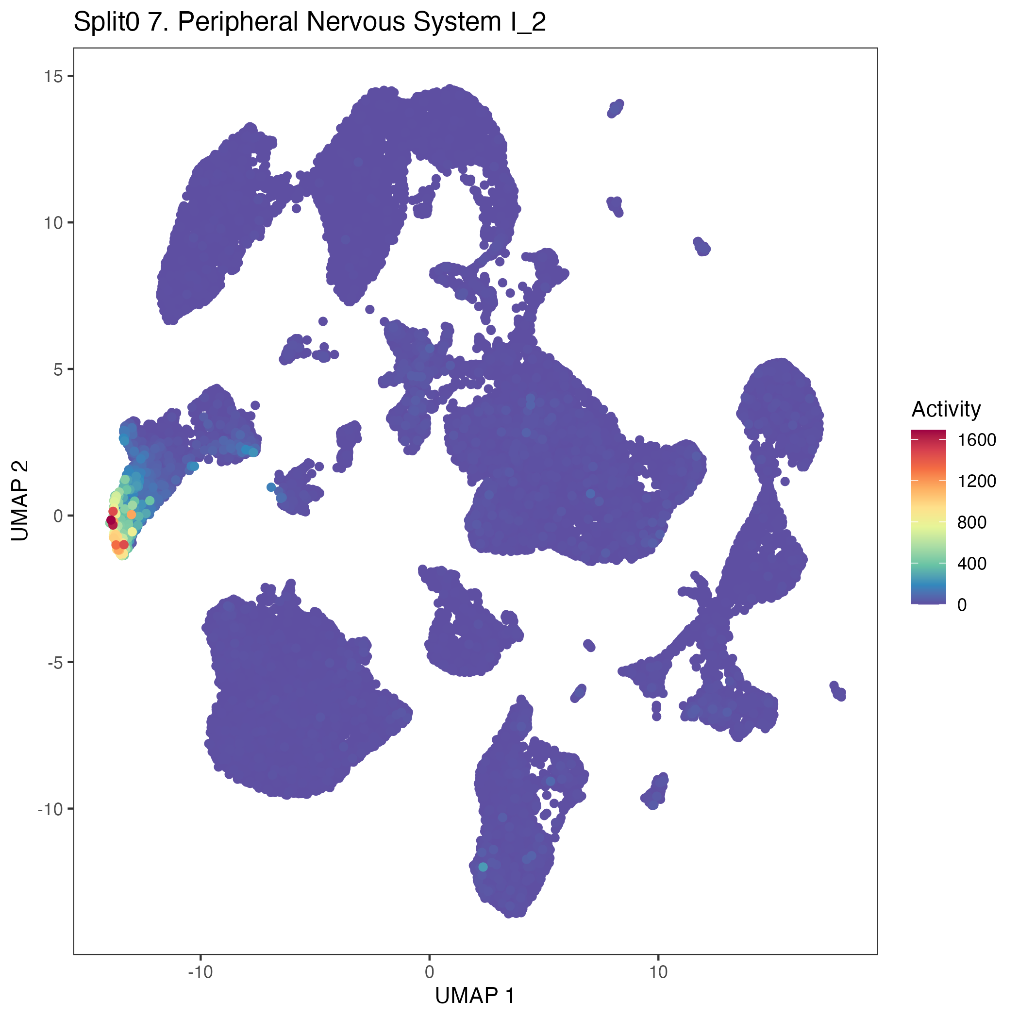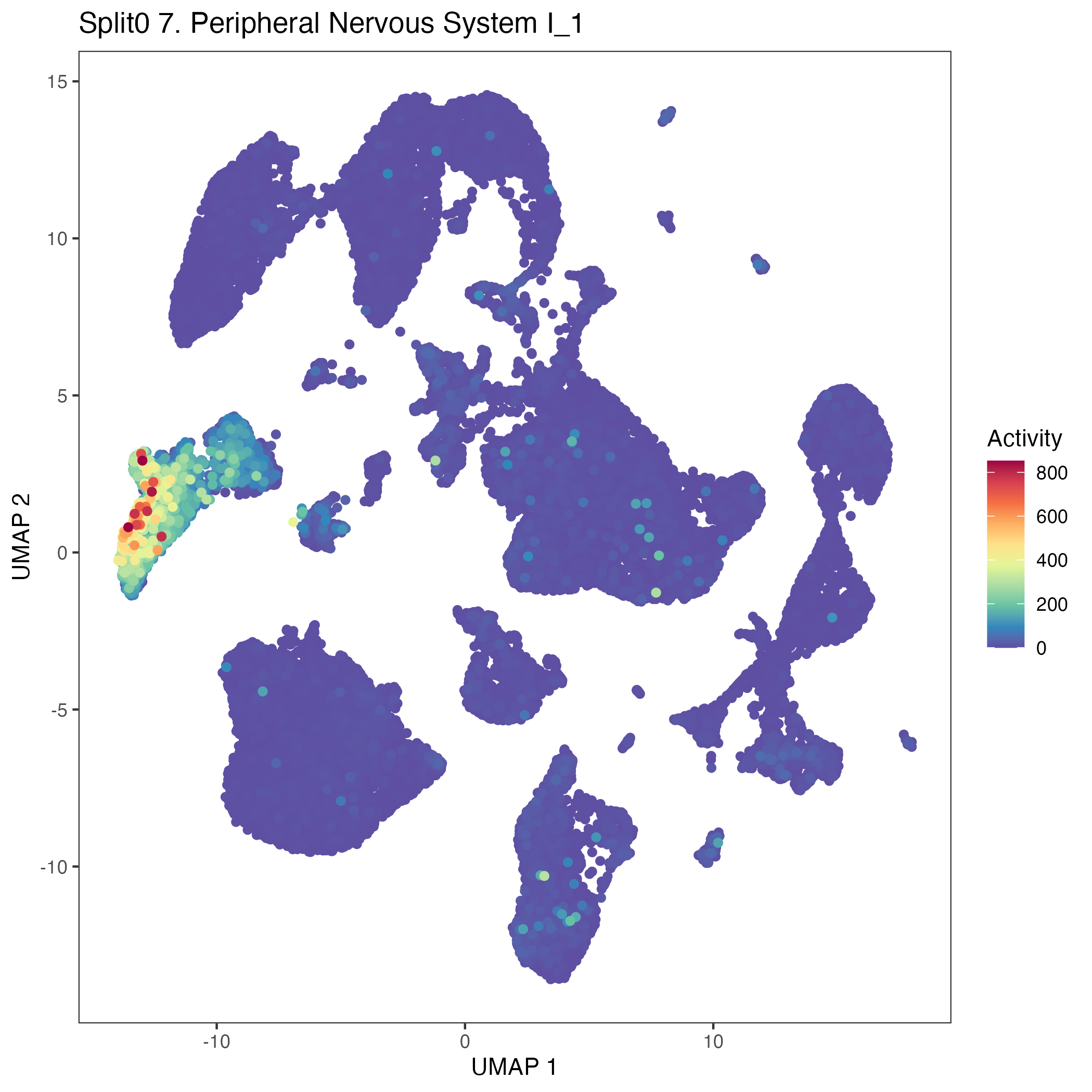 UMAP plots showing activity of gene expression program identified in GEP 7. Peripheral Nervous System I: