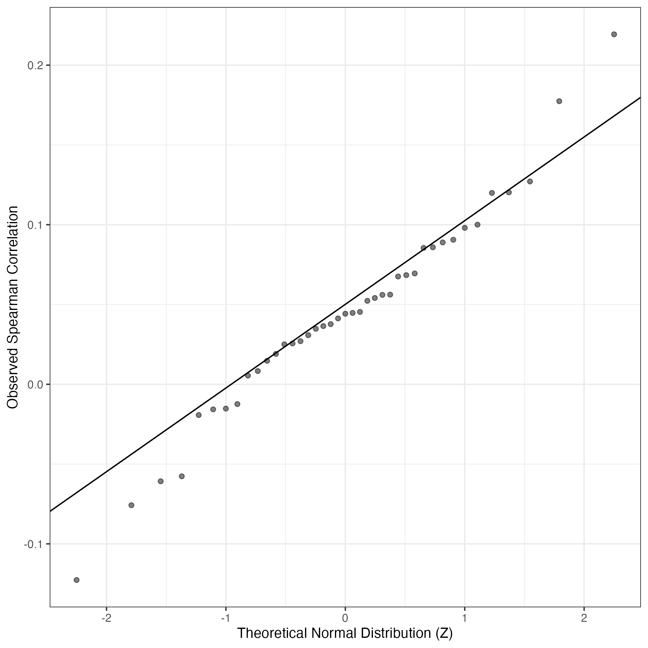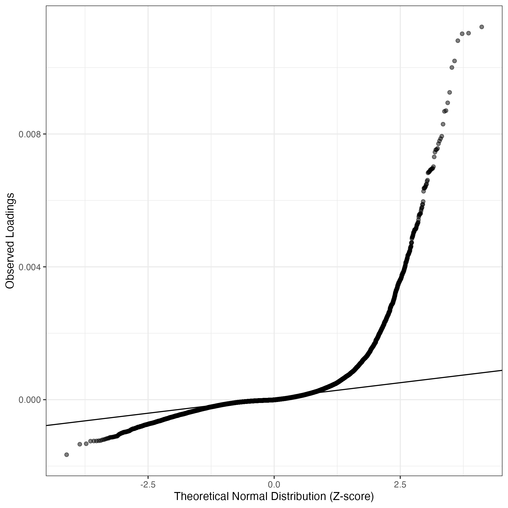 QQ-plot of gene loadings, averaged over both independent splits of the data