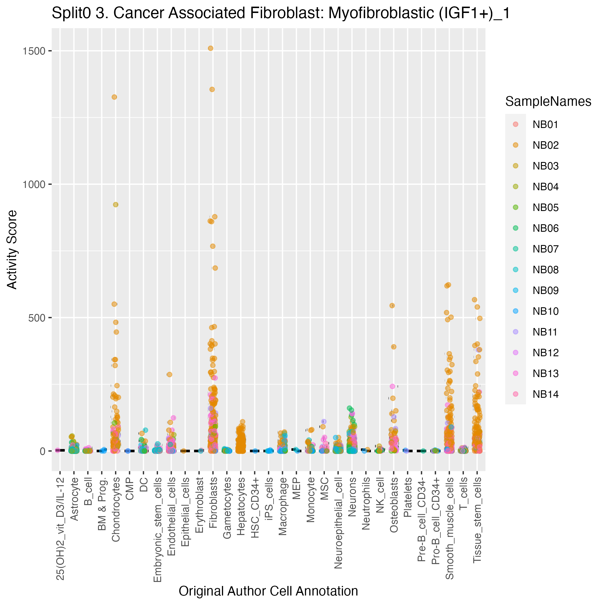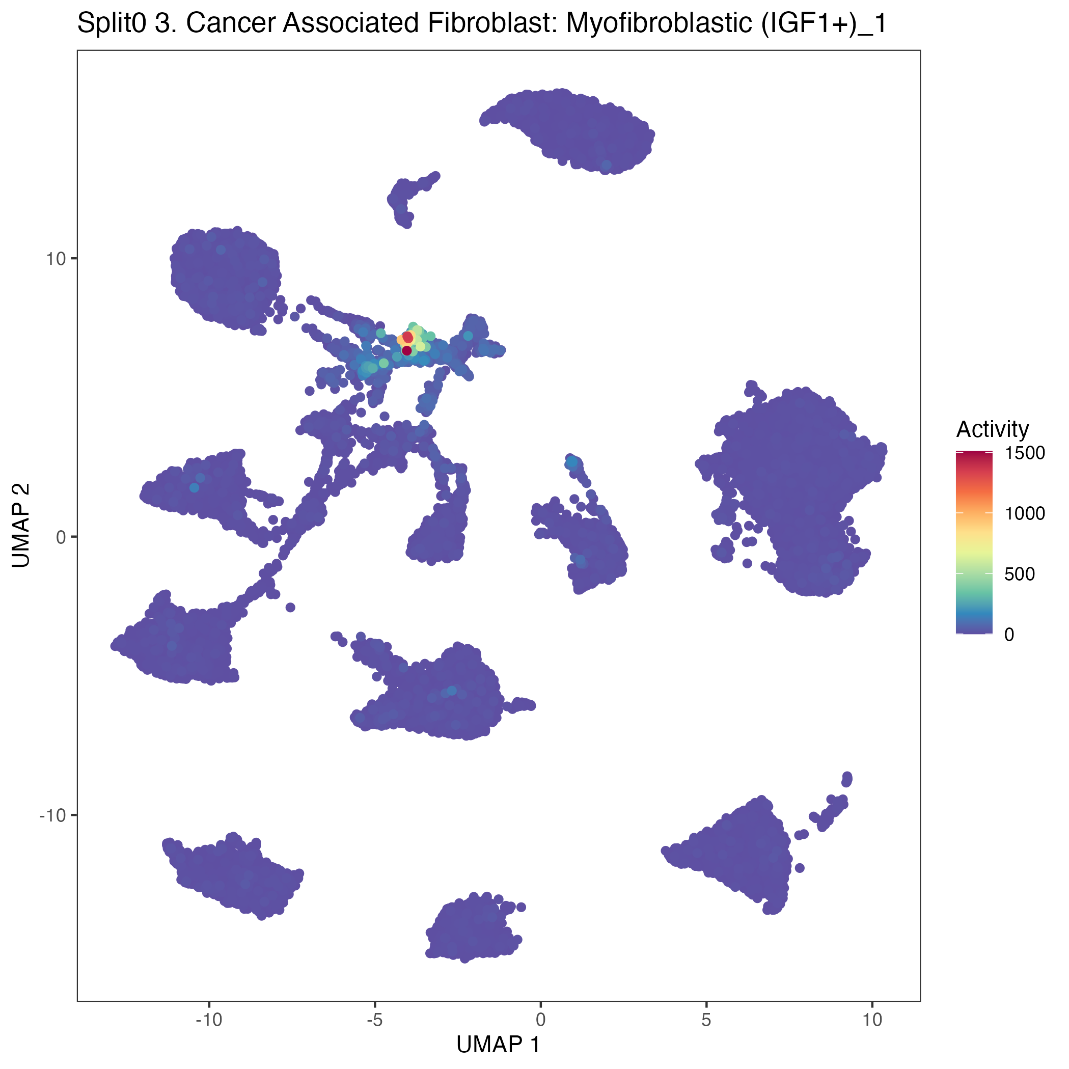 UMAP plots showing activity of gene expression program identified in community:3. Cancer Associated Fibroblast: Myofibroblastic (IGF1+)
