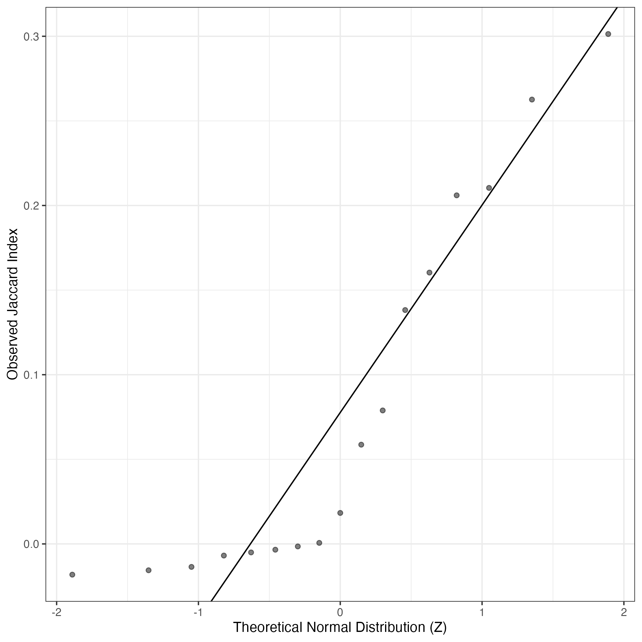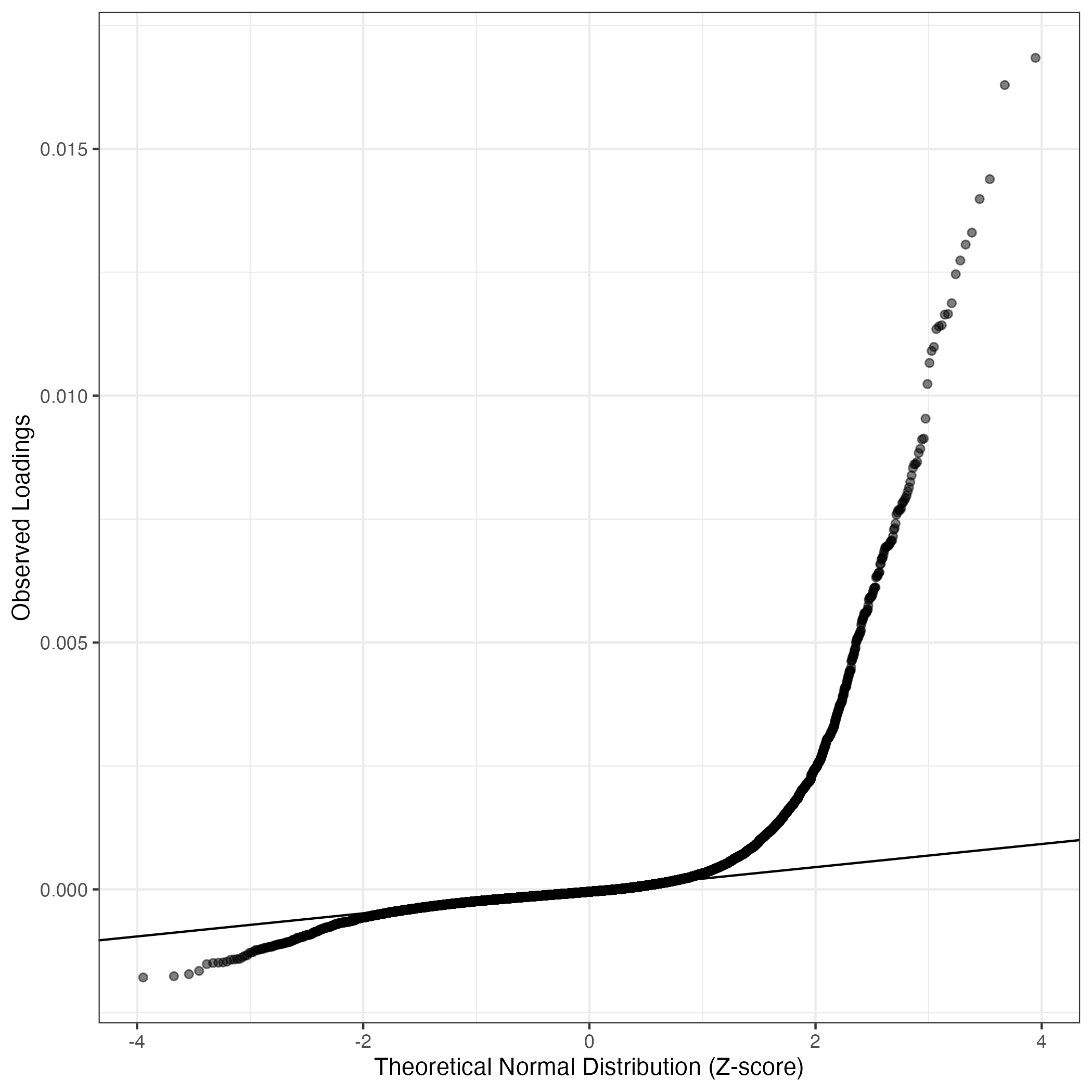 QQ-plot of gene loadings, averaged over both independent splits of the data
