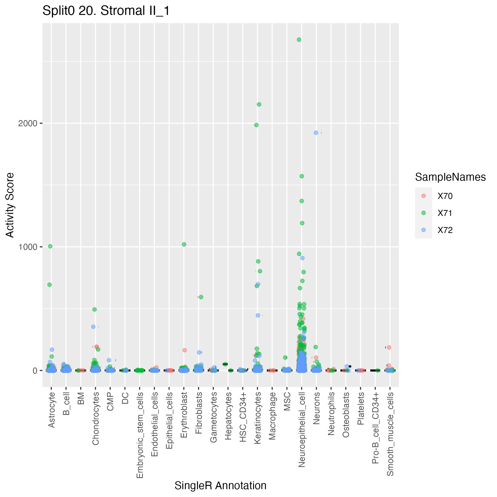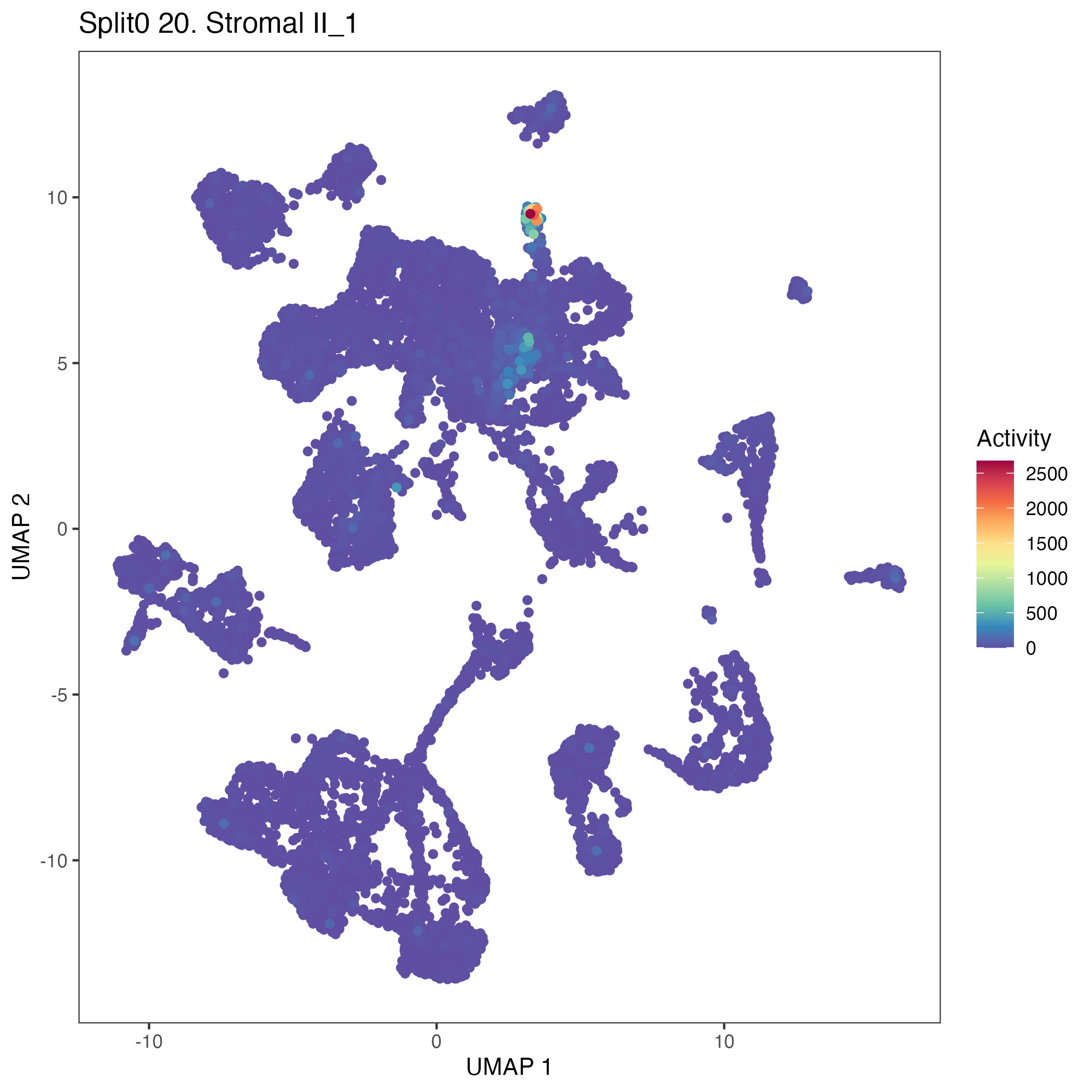 UMAP plots showing activity of gene expression program identified in GEP 20. Stromal II: