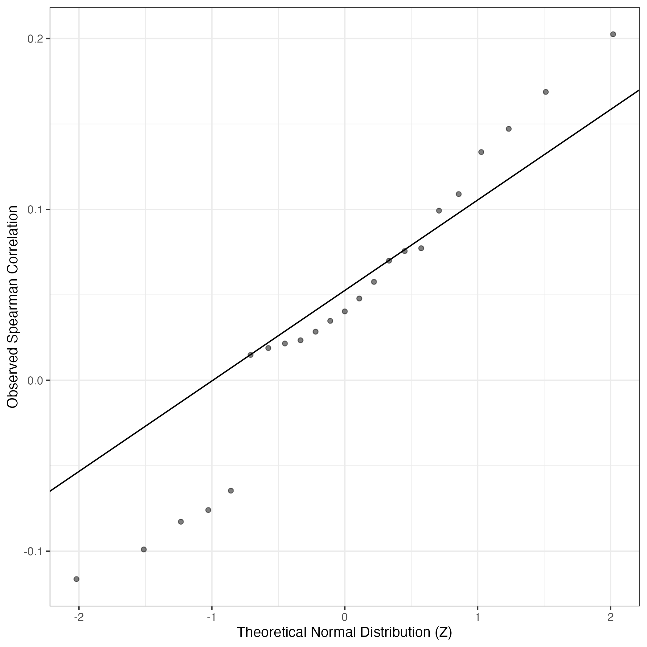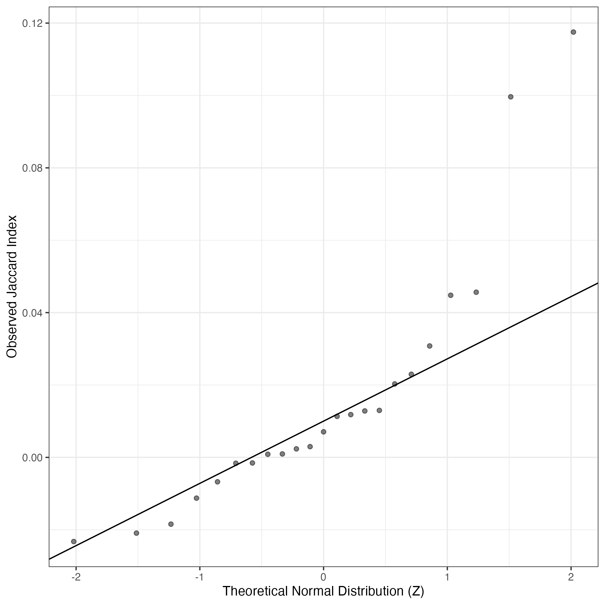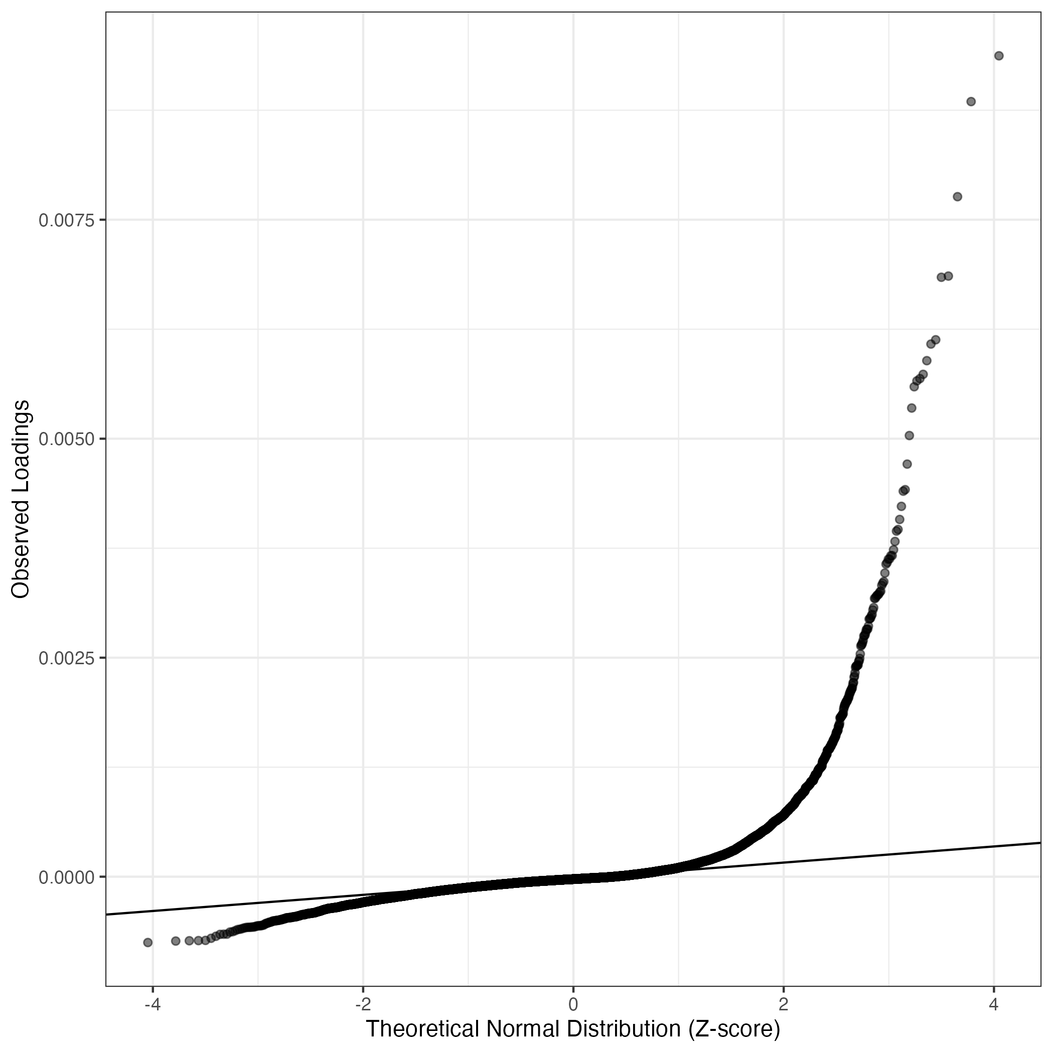 QQ-plot of gene loadings, averaged over both independent splits of the data