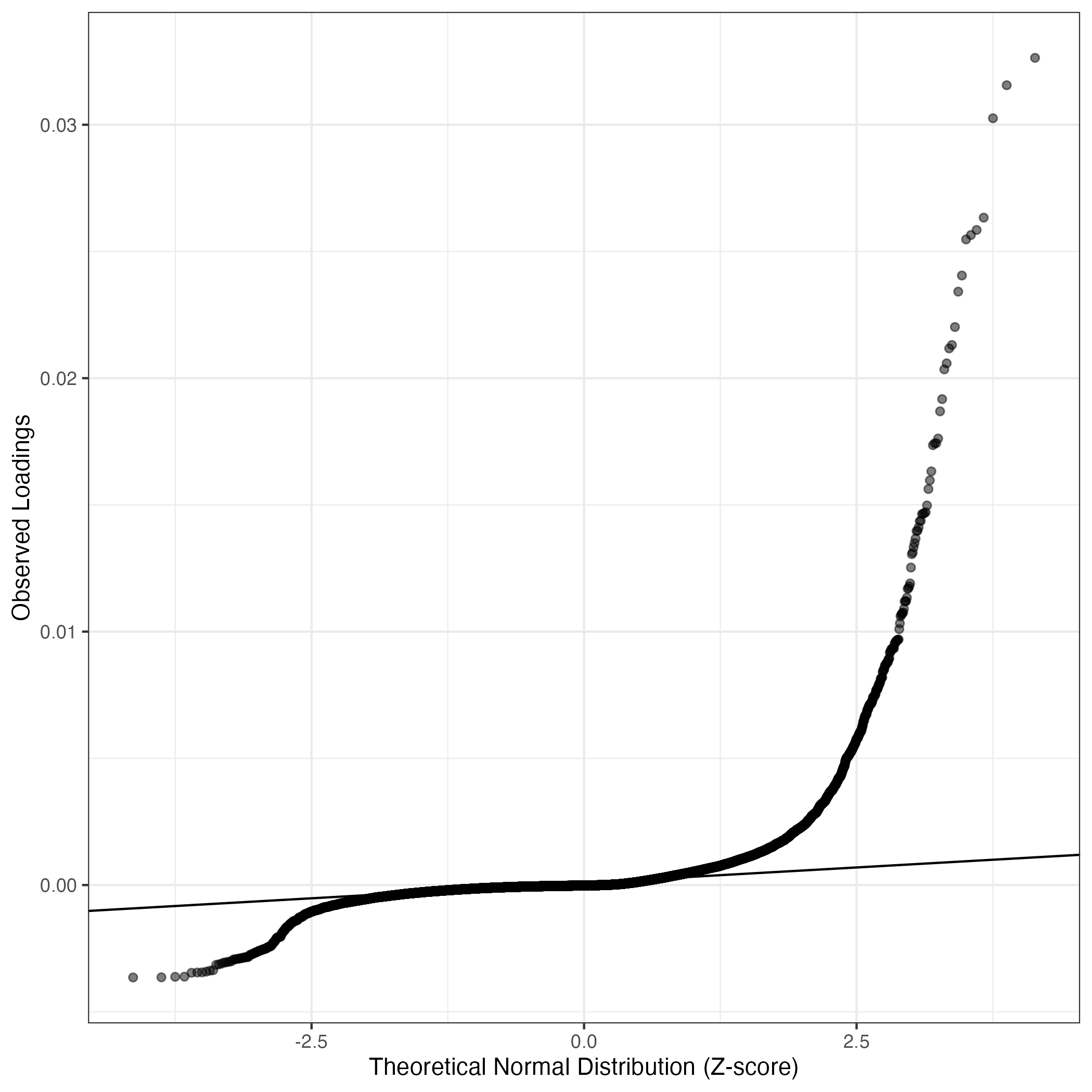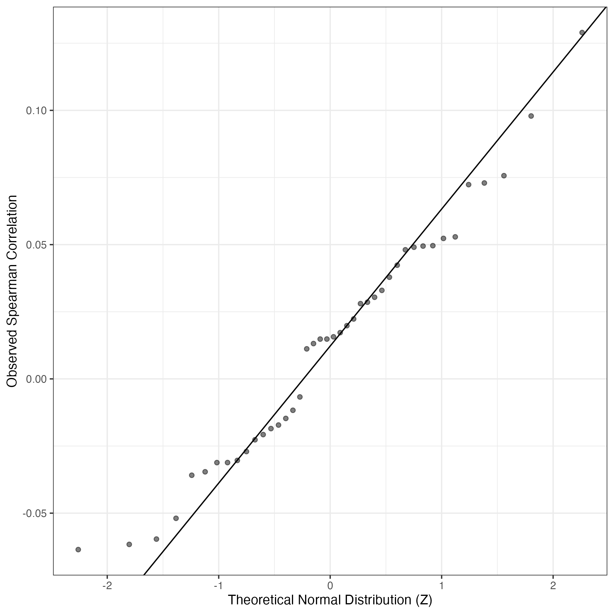 A similar QQ-plot as above, but only for instances where the H value is e.g. > 25, i.e. we are confident that the expression program is active above noise. Agreemenet between these binary vectors is tested using the Jaccard Index, with the P-values calculated by an exact test: