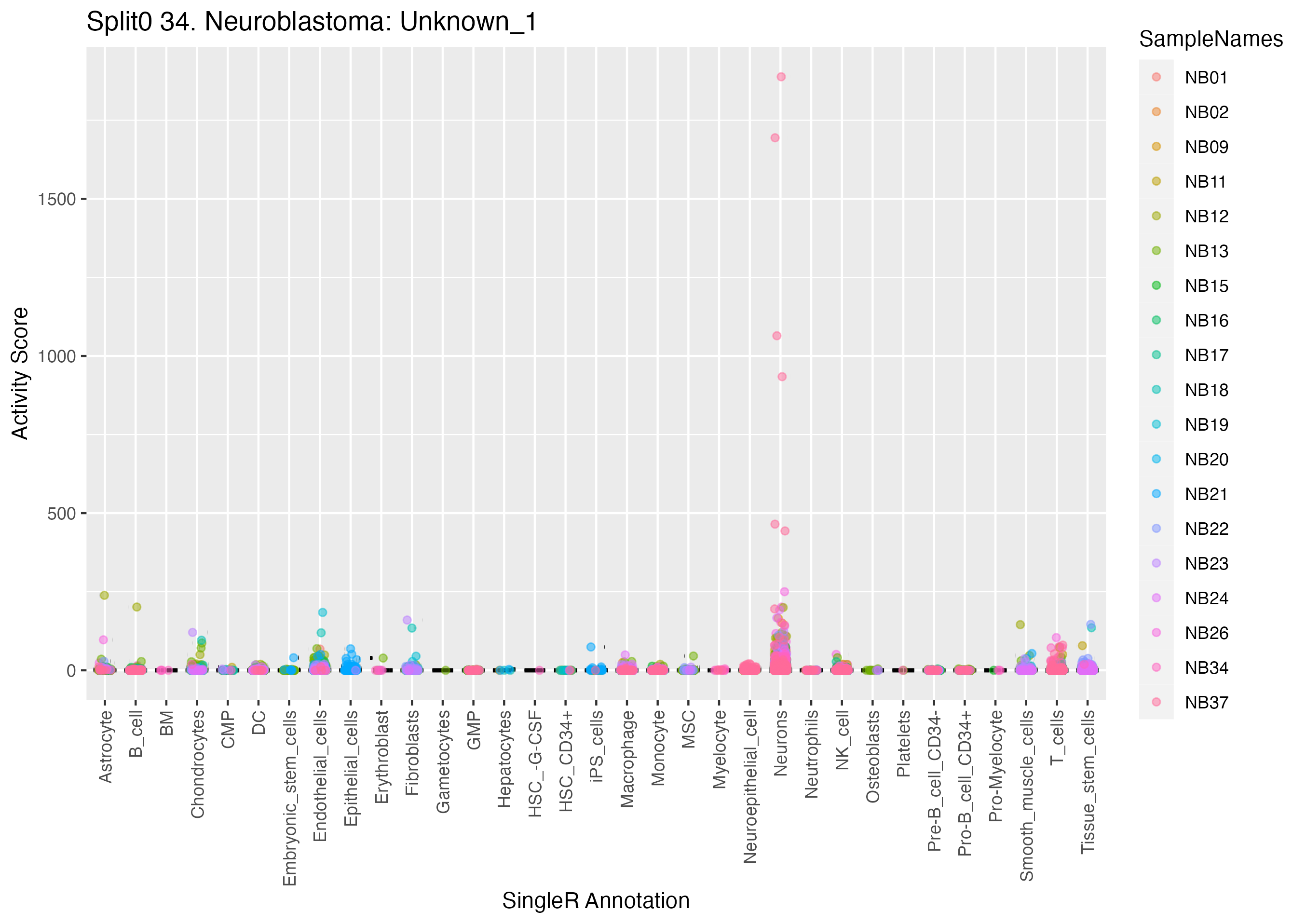 Late Neuroblasts (Jansky Fig1E) Heatmap in Fig. 1E, marker genes derived from Jansks scRNA-seq data for adrenal medulla cell types. Note: the Jansky Late Neuroblast signature is the same as the earlier Neuroblast signature, but NEFM and ALK are now absent (meaning lower expressed at later stages of differentiation): Wilcoxon ranksum test P-value for gene set overrepresentation: 7.96e-01 Mean rank of genes in gene set: 17240.6 Rank on gene expression program of genes in gene set: