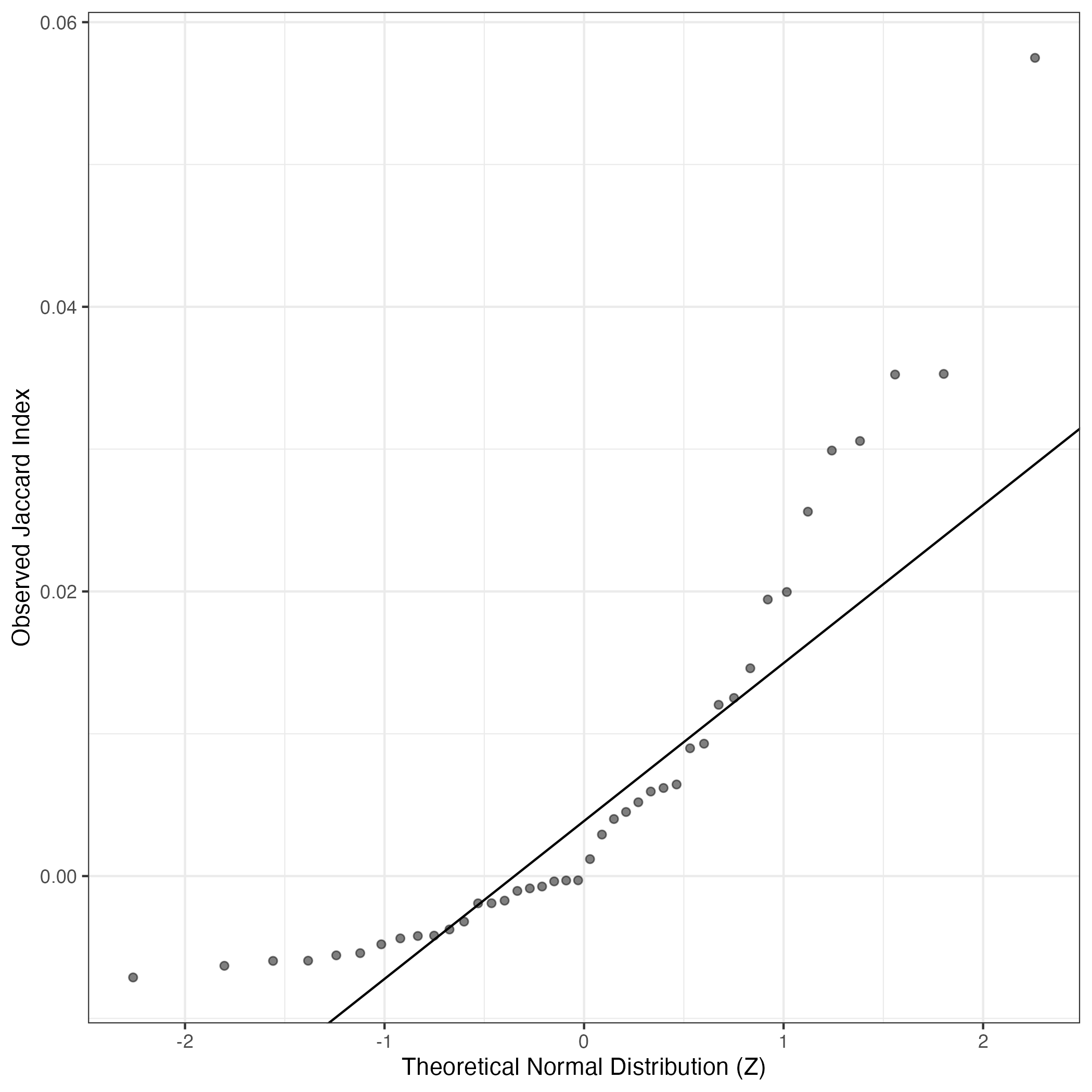 A similar QQ-plot as above, but only for instances where the H value is e.g. > 25, i.e. we are confident that the expression program is active above noise. Agreemenet between these binary vectors is tested using the Jaccard Index, with the P-values calculated by an exact test: