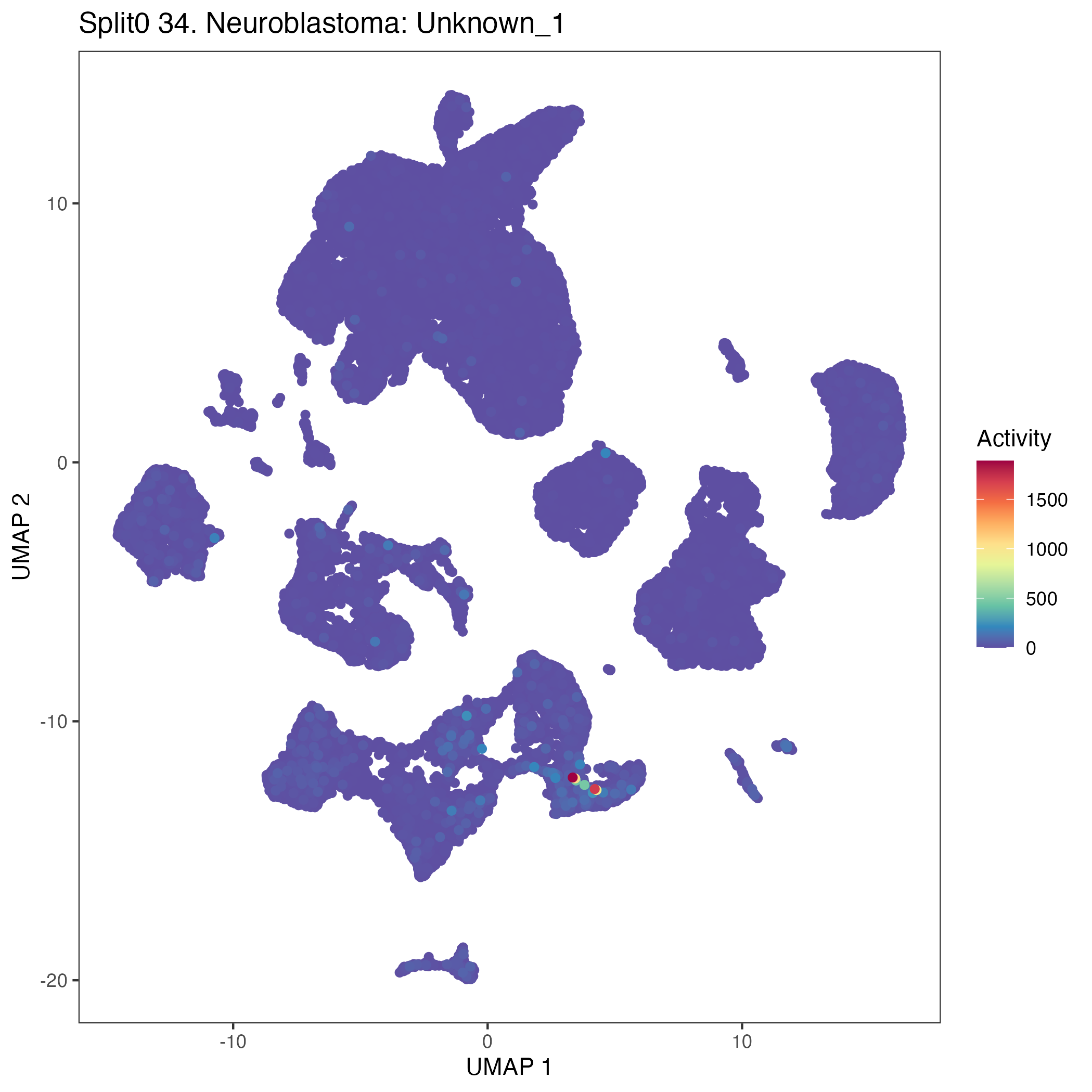 SCPs neuroblastoma unique (Olsen) Similar to above, but for genes unique to neuroblastoma SCP-like cells. Note FN1 is often used as a mesenchymal marker gene.: Wilcoxon ranksum test P-value for gene set overrepresentation: 3.49e-01 Mean rank of genes in gene set: 13006.29 Rank on gene expression program of genes in gene set: