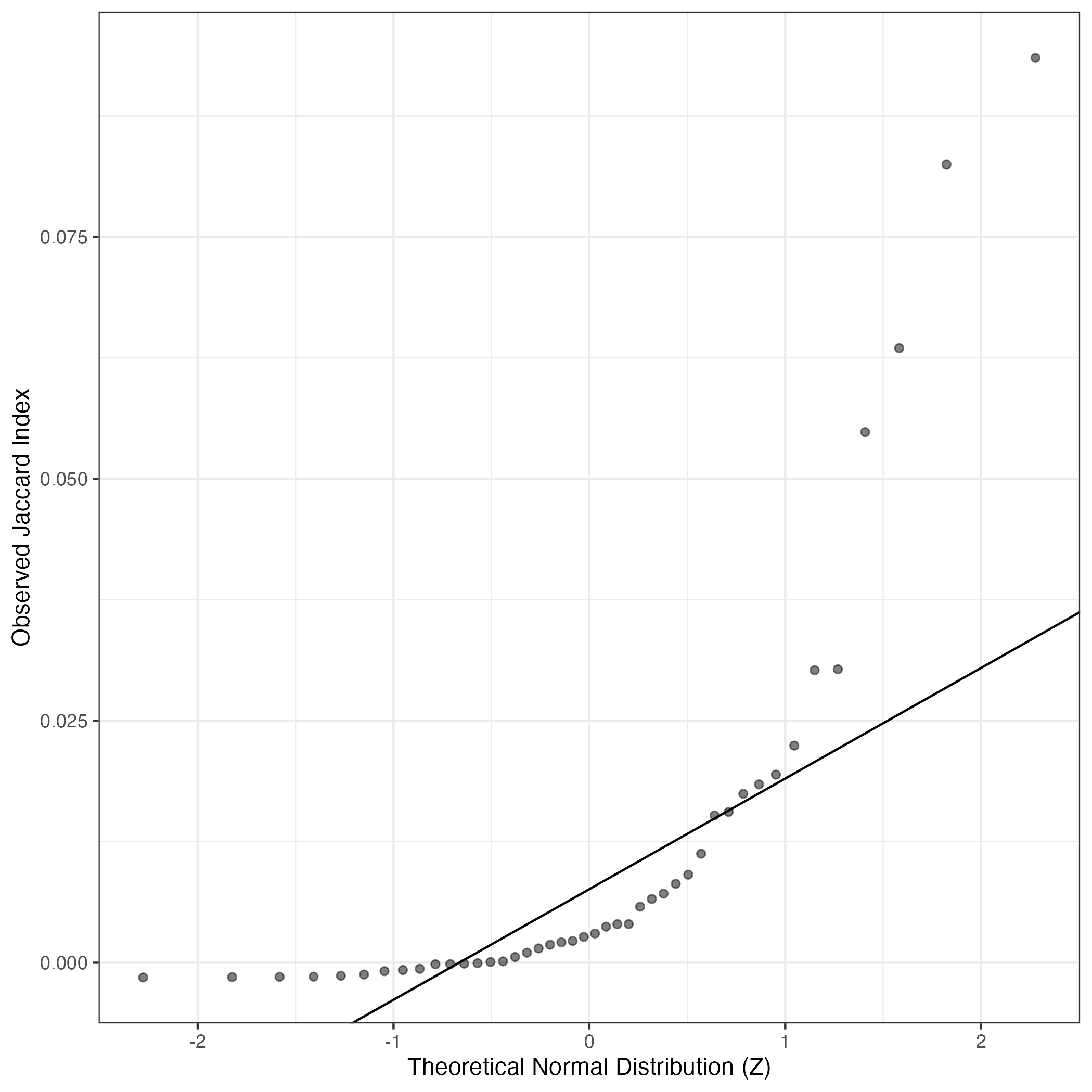 A similar QQ-plot as above, but only for instances where the H value is e.g. > 25, i.e. we are confident that the expression program is active above noise. Agreemenet between these binary vectors is tested using the Jaccard Index, with the P-values calculated by an exact test: