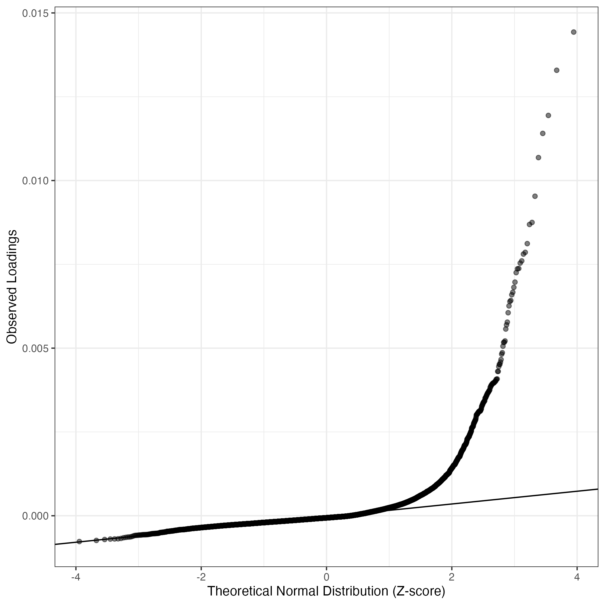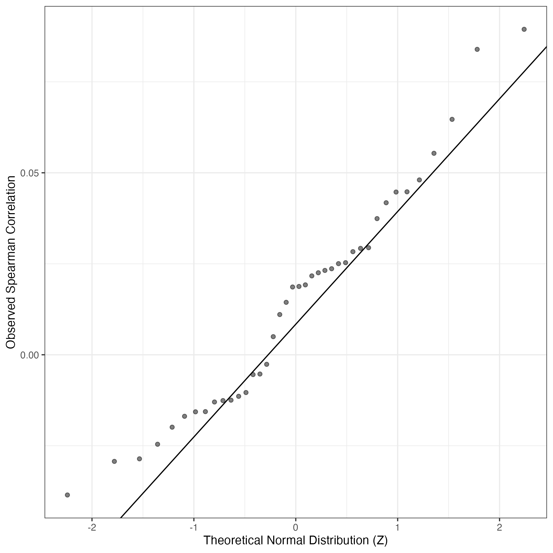 A similar QQ-plot as above, but only for instances where the H value is e.g. > 25, i.e. we are confident that the expression program is active above noise. Agreemenet between these binary vectors is tested using the Jaccard Index, with the P-values calculated by an exact test: