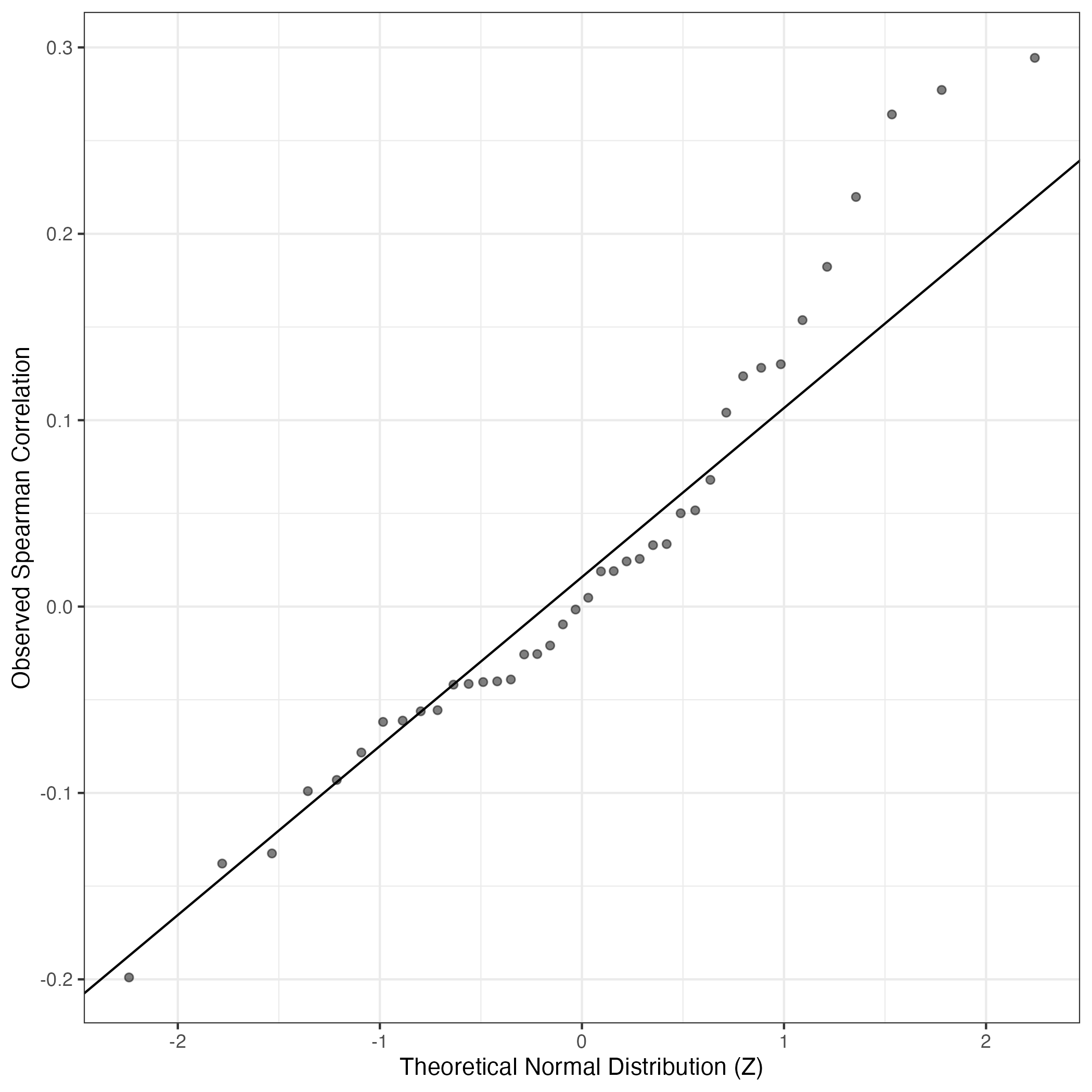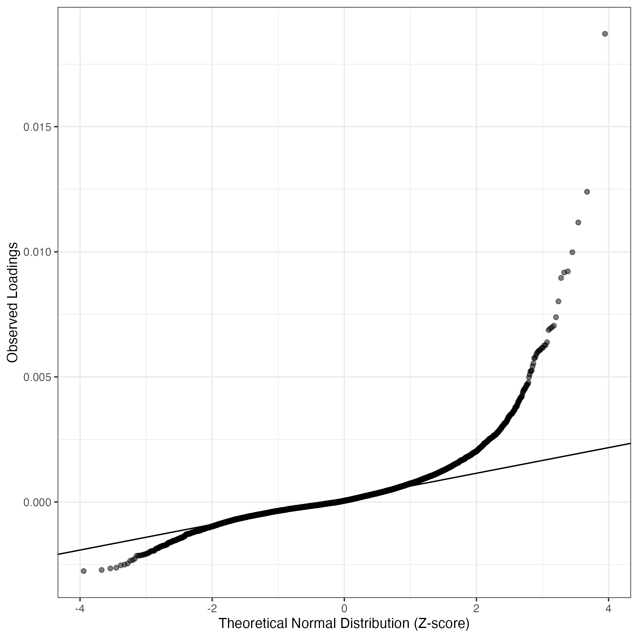 QQ-plot of gene loadings, averaged over both independent splits of the data