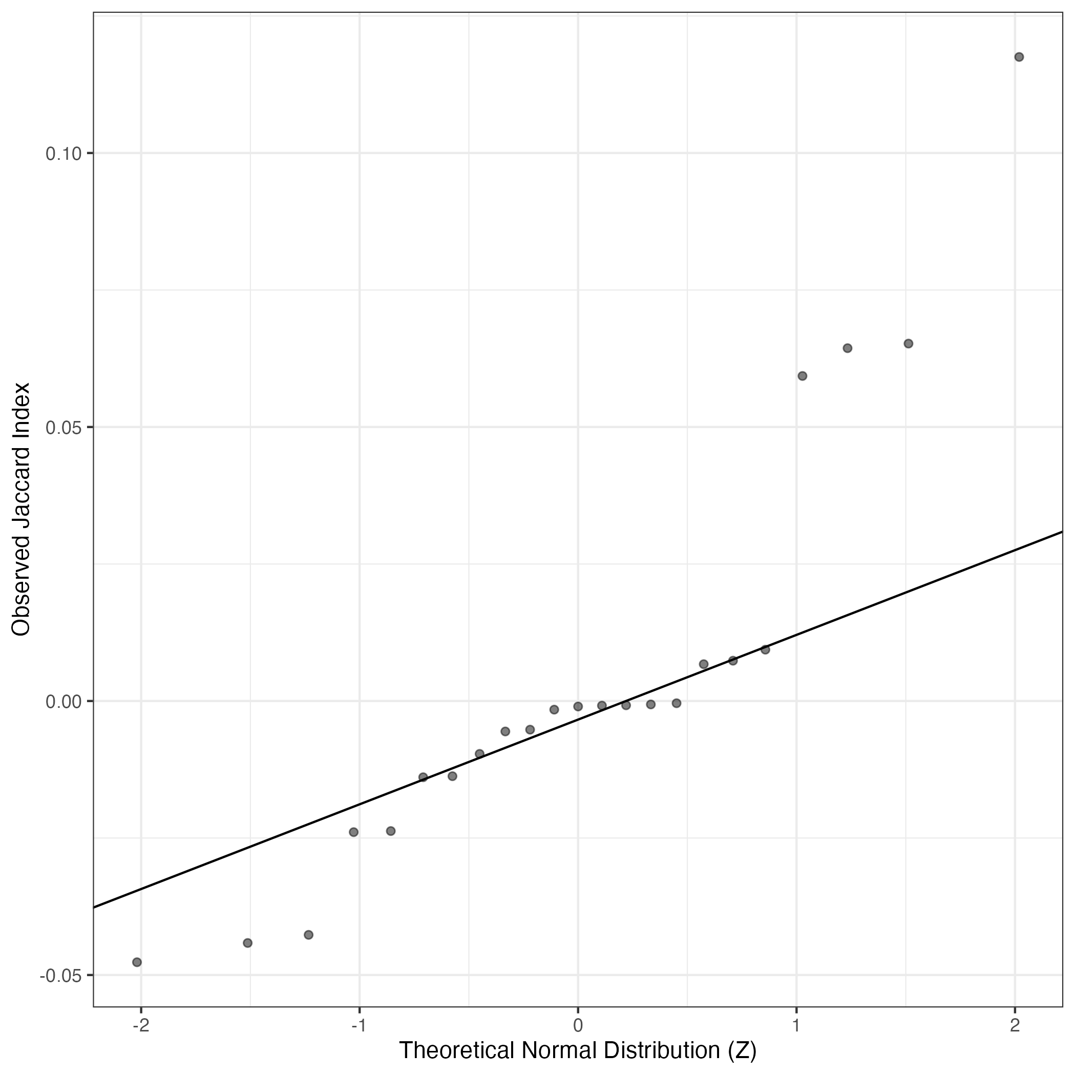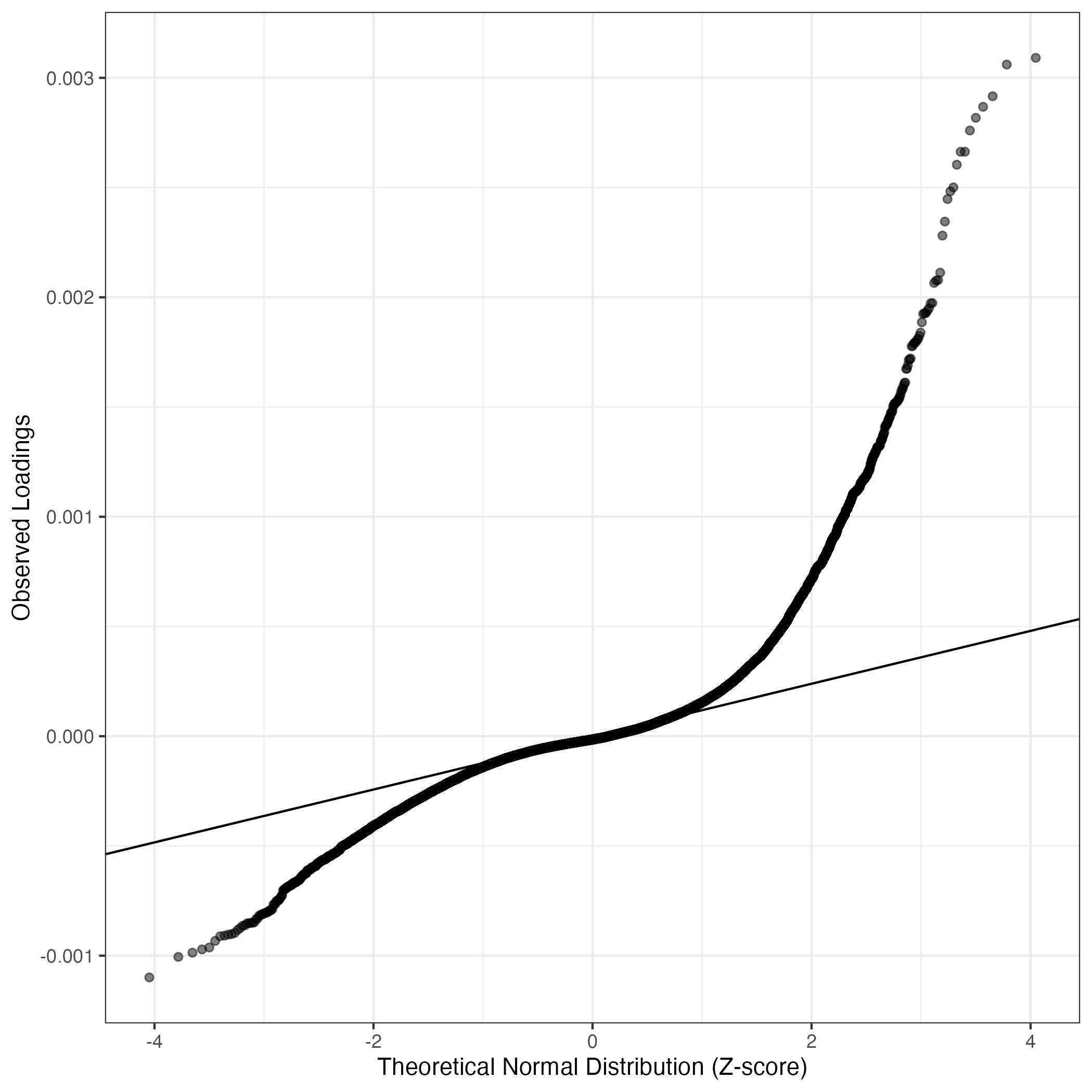 QQ-plot of gene loadings, averaged over both independent splits of the data