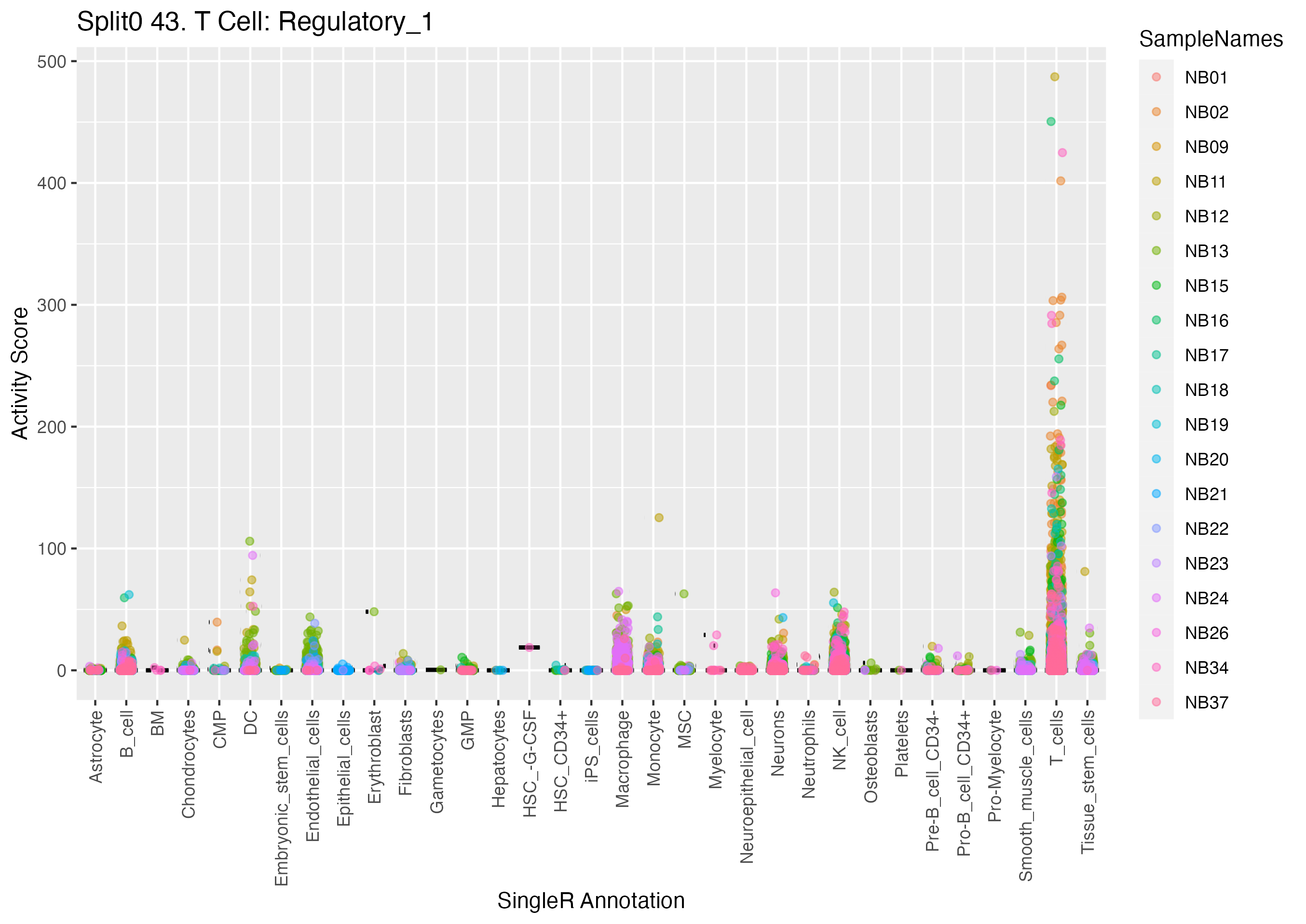 T cells: NKT cells (curated markers) distinct T lymphocyte subpopulation that expresses both alpha/beta T-cell receptors and surface receptors of natural killer cells: Wilcoxon ranksum test P-value for gene set overrepresentation: 9.98e-01 Mean rank of genes in gene set: 28119.67 Rank on gene expression program of genes in gene set: