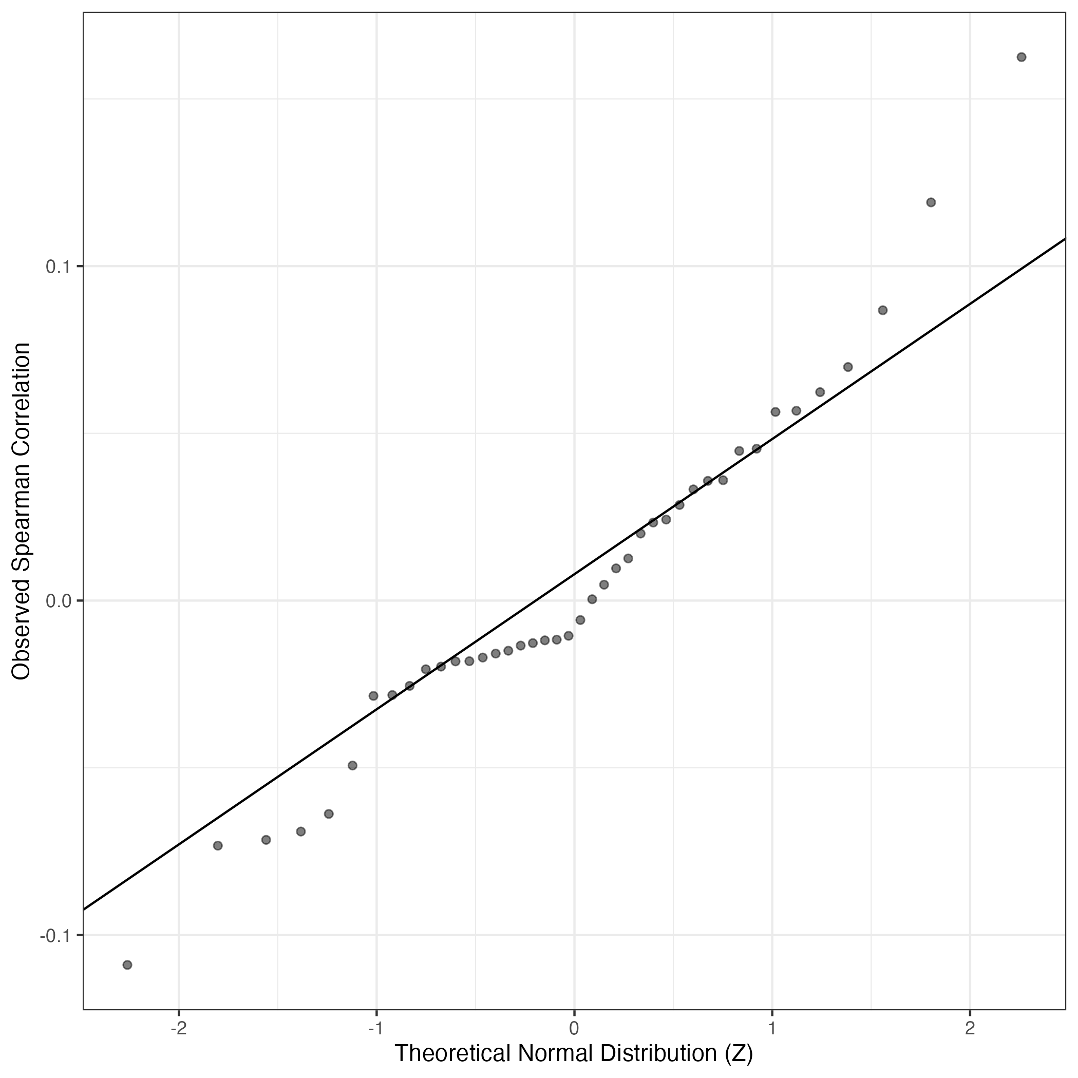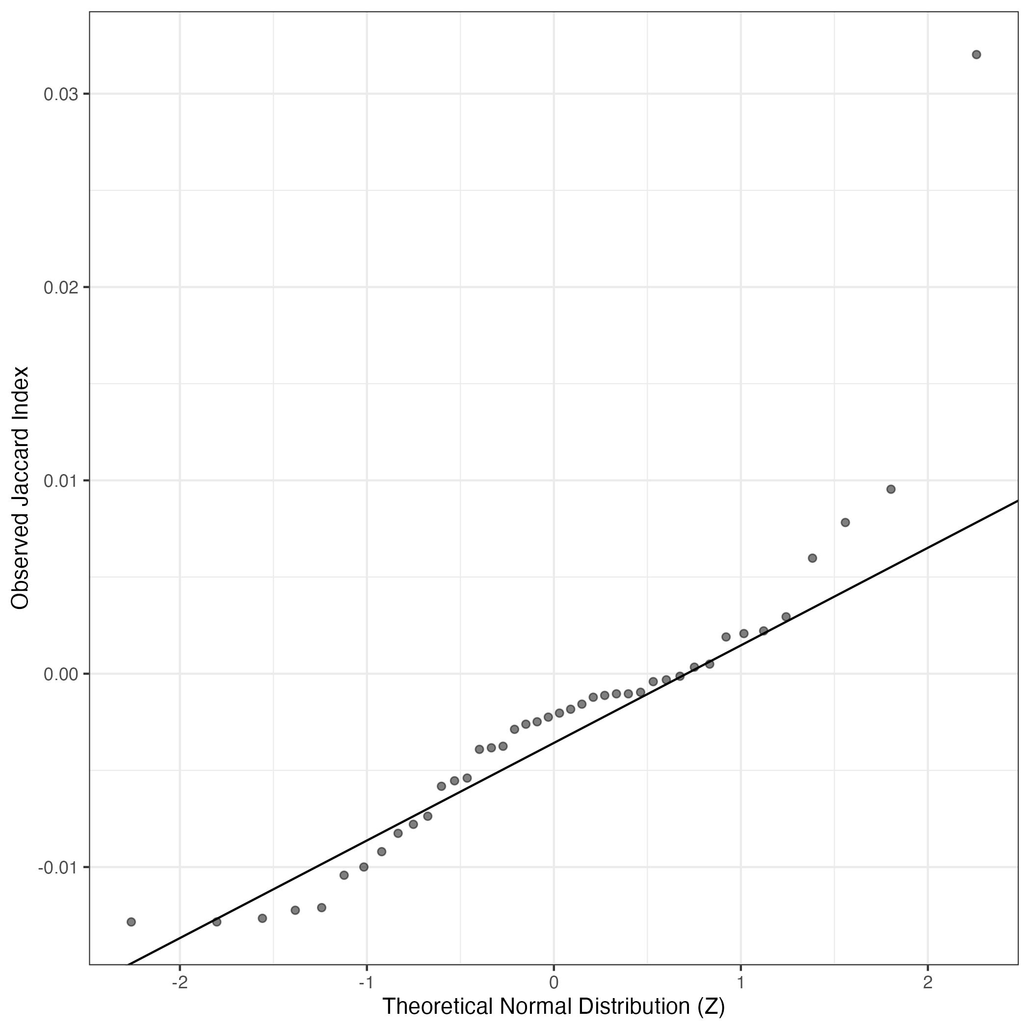 A similar QQ-plot as above, but only for instances where the H value is e.g. > 25, i.e. we are confident that the expression program is active above noise. Agreemenet between these binary vectors is tested using the Jaccard Index, with the P-values calculated by an exact test: