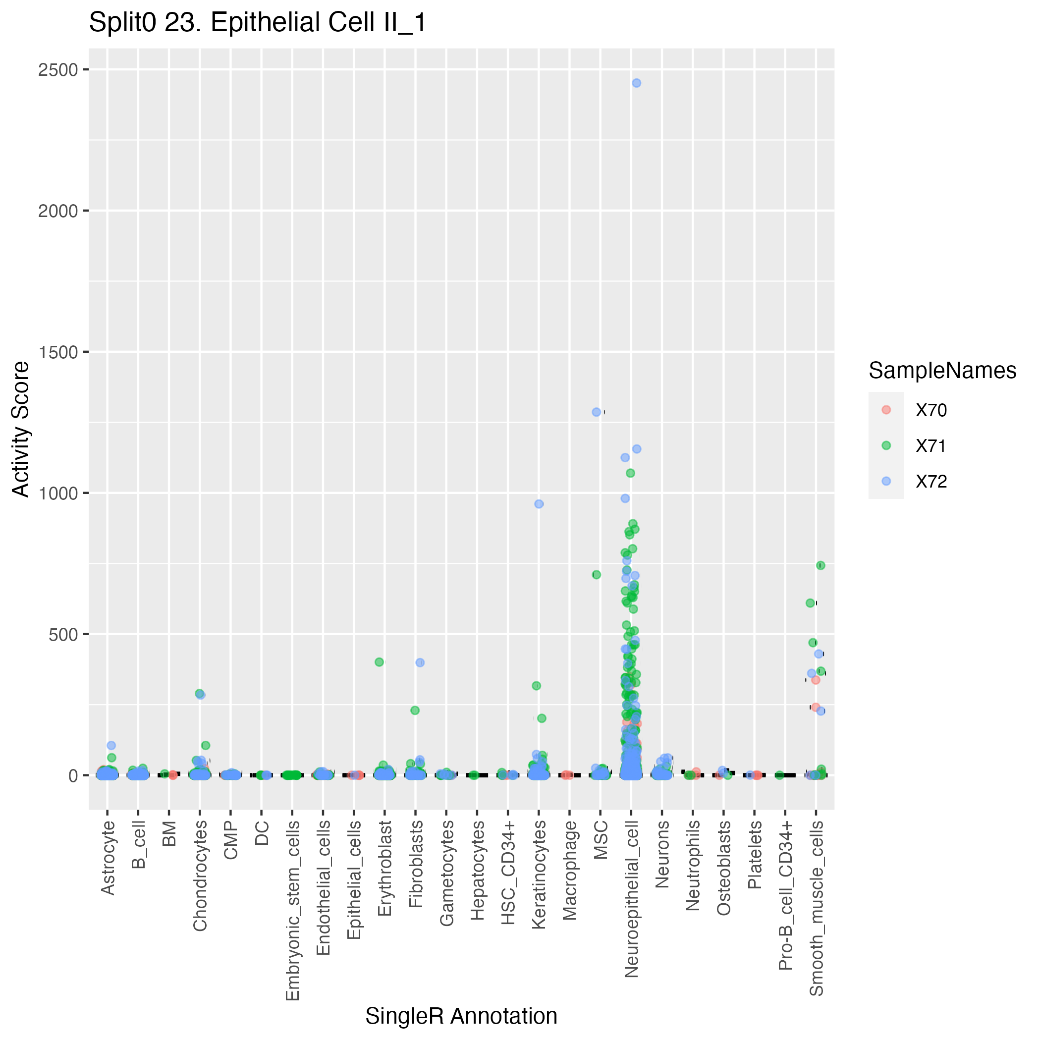 Epithelial cells: Epithelial cells (model markers) highly specialised cells which are located in the outer layer of stroma and form the cellular components of the epithelium: Wilcoxon ranksum test P-value for gene set overrepresentation: 7.87e-01 Mean rank of genes in gene set: 11070.3 Rank on gene expression program of genes in gene set: