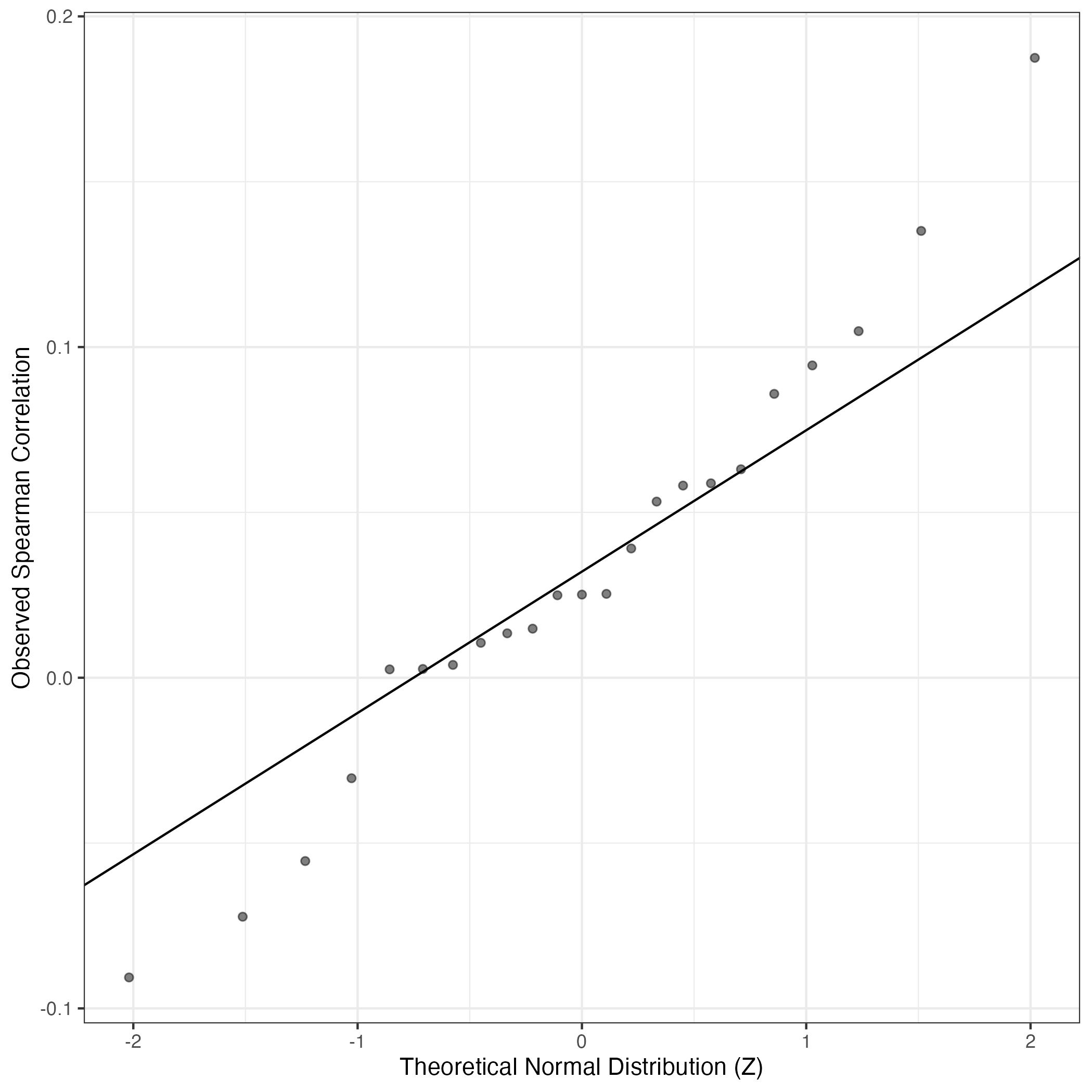 A similar QQ-plot as above, but only for instances where the H value is e.g. > 25, i.e. we are confident that the expression program is active above noise. Agreemenet between these binary vectors is tested using the Jaccard Index, with the P-values calculated by an exact test: