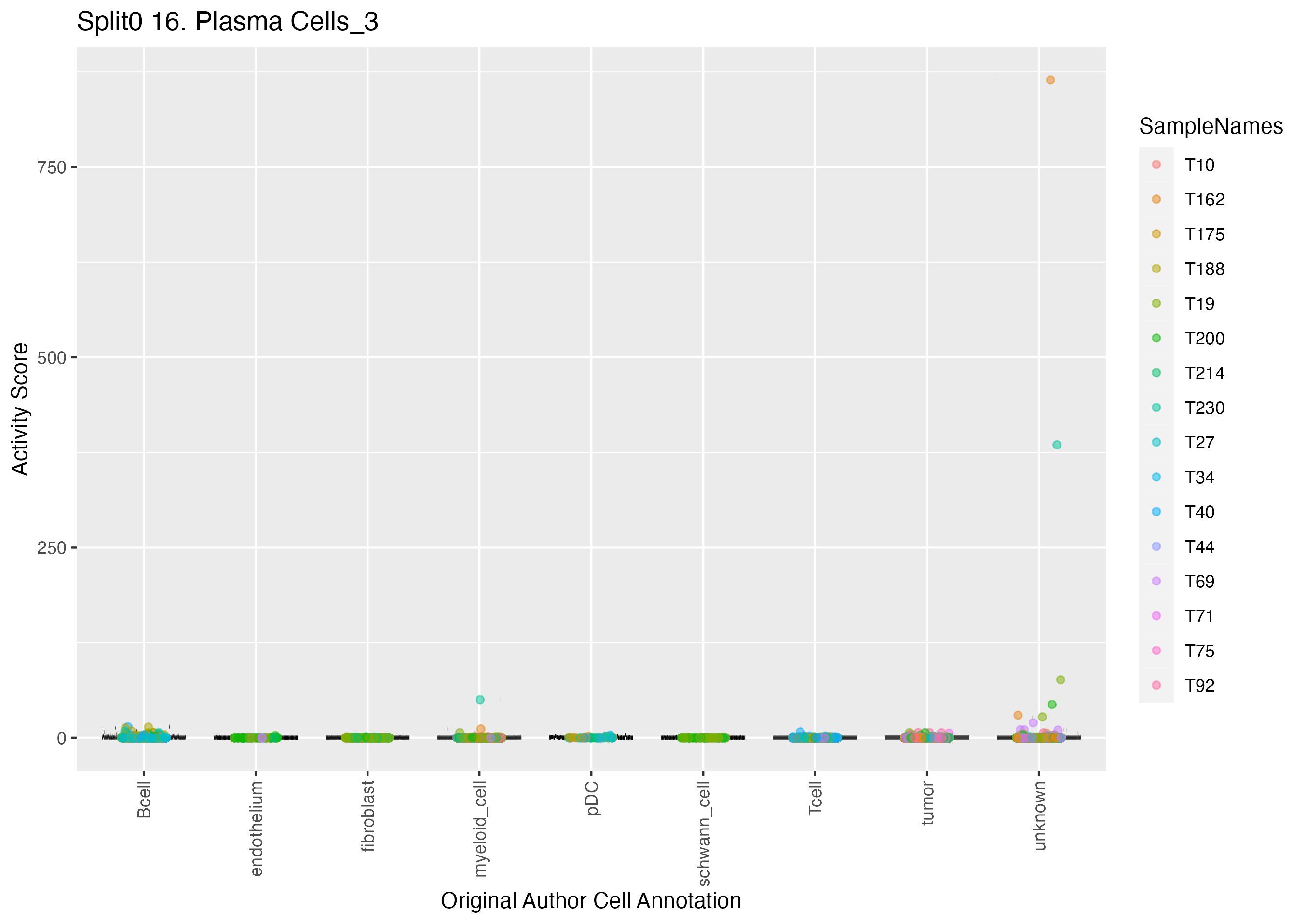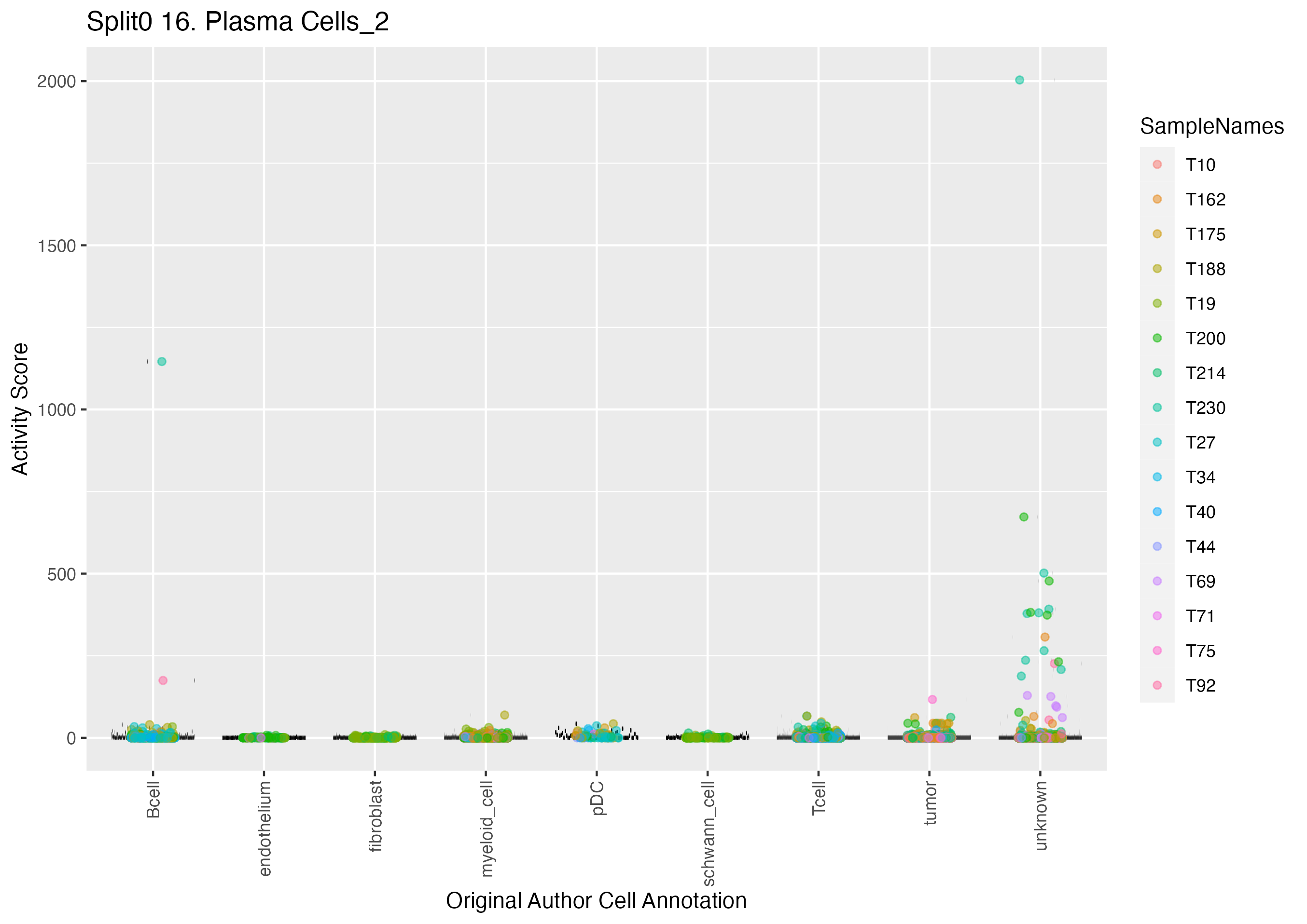B cells: B cells (model markers) B lymphocytes with diverse cell surface immunoglobulin receptors recognising specific antigenic epitopes and mediating humoral immunity: Wilcoxon ranksum test P-value for gene set overrepresentation: 7.33e-01 Mean rank of genes in gene set: 7573 Rank on gene expression program of genes in gene set: