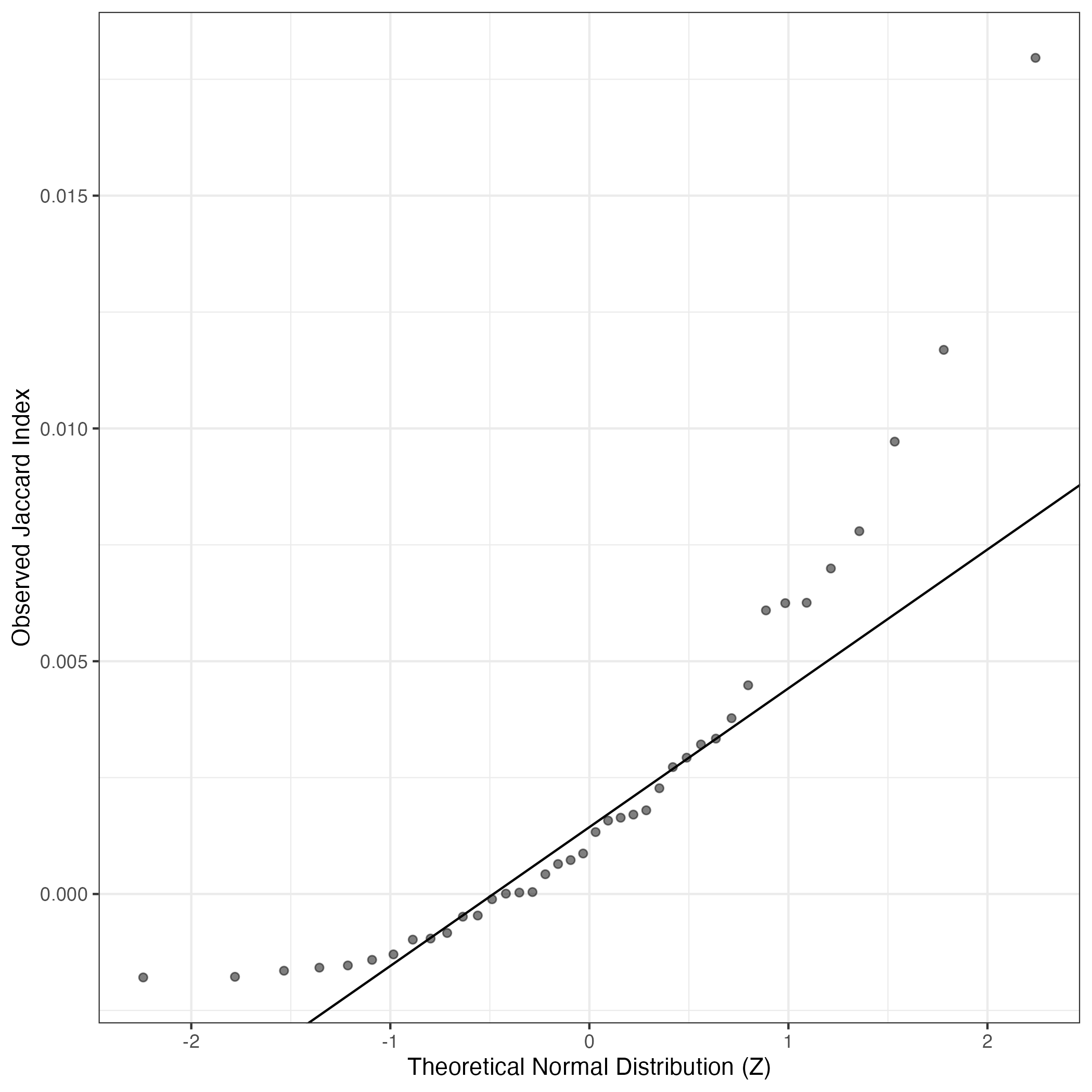 A similar QQ-plot as above, but only for instances where the H value is e.g. > 25, i.e. we are confident that the expression program is active above noise. Agreemenet between these binary vectors is tested using the Jaccard Index, with the P-values calculated by an exact test: