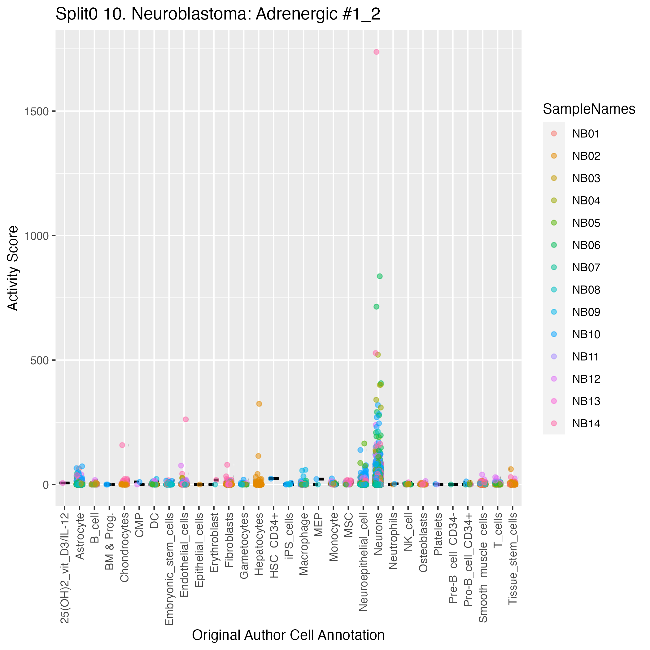 UMAP plots showing activity of gene expression program identified in community:10. Neuroblastoma: Adrenergic #1