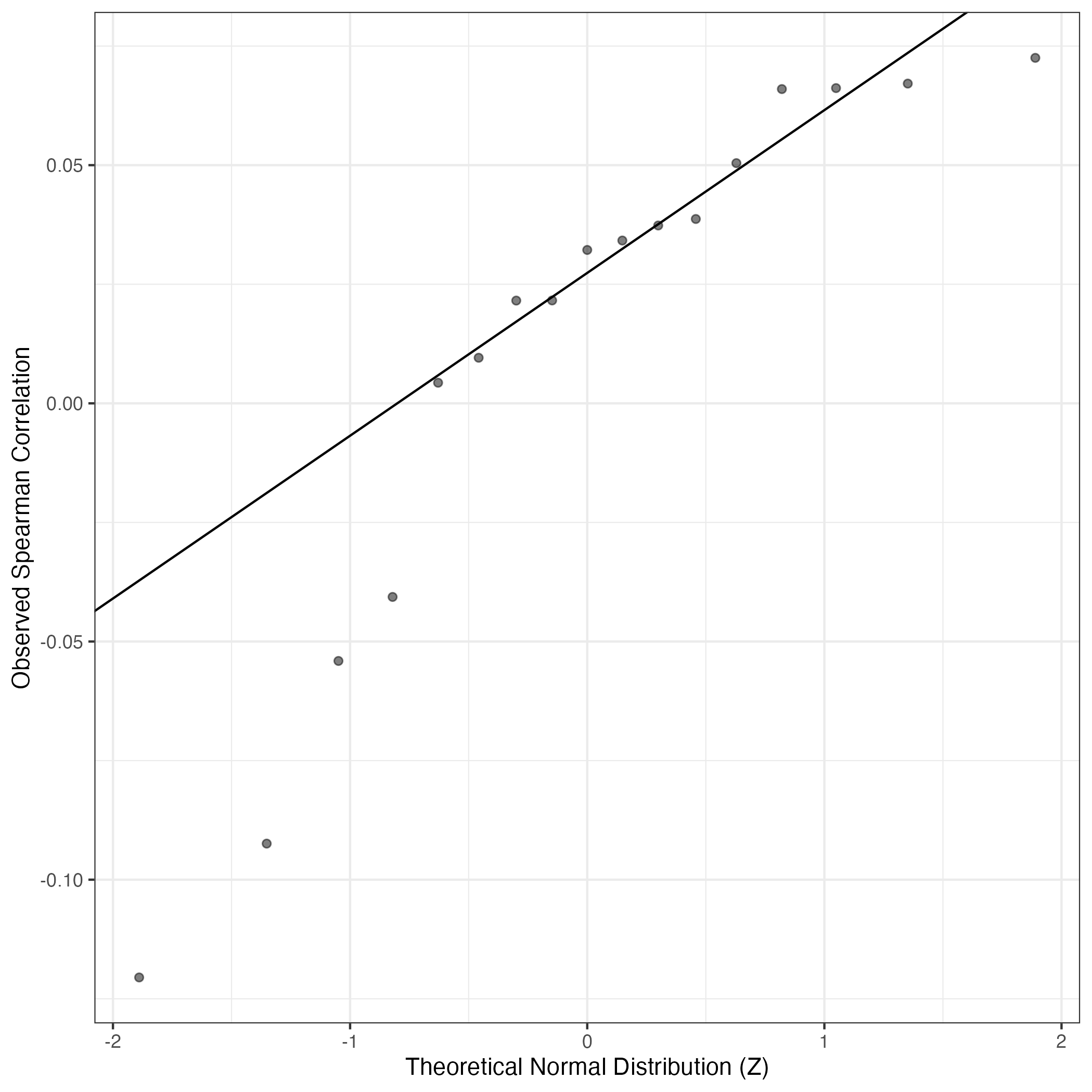 QQ-plot of gene loadings, averaged over both independent splits of the data