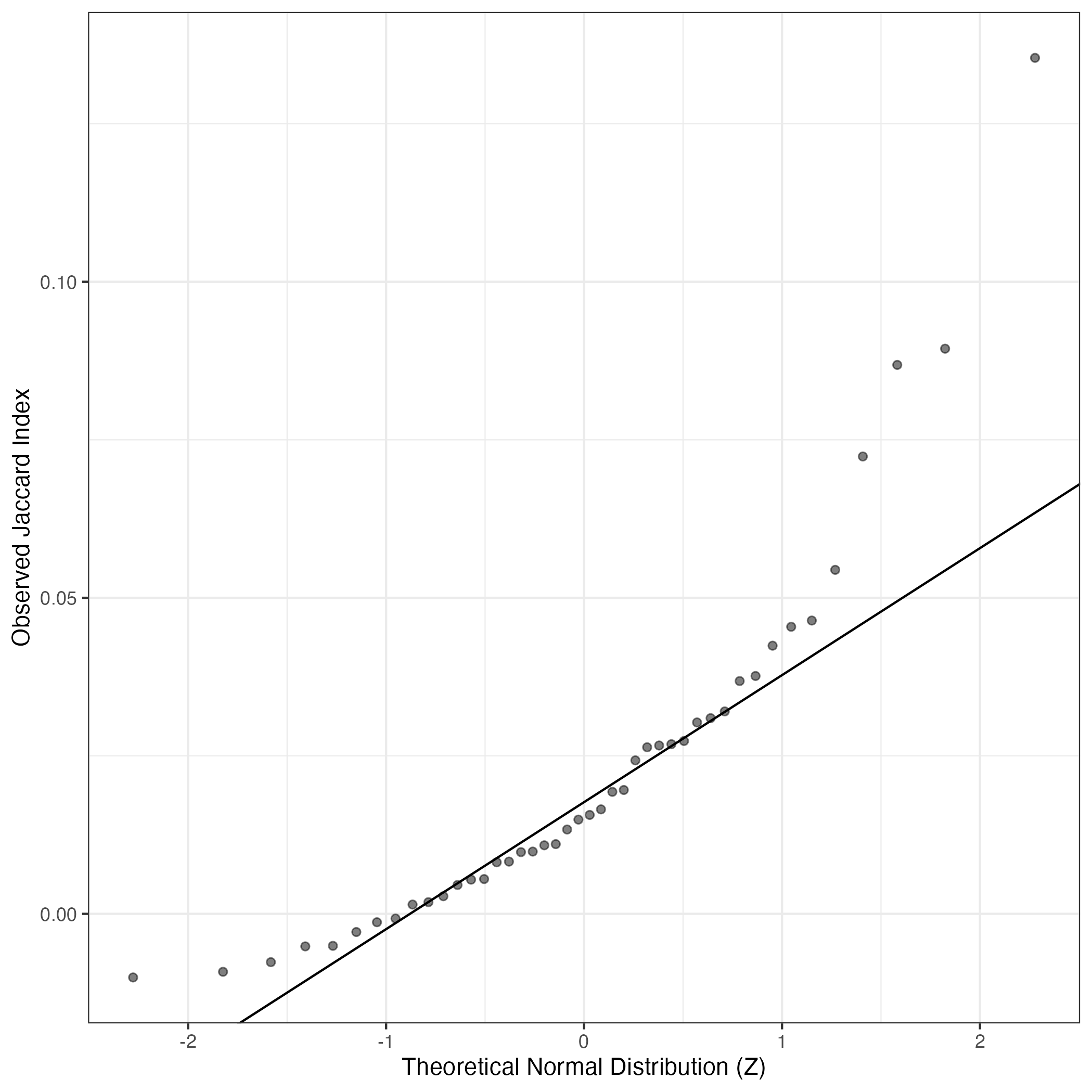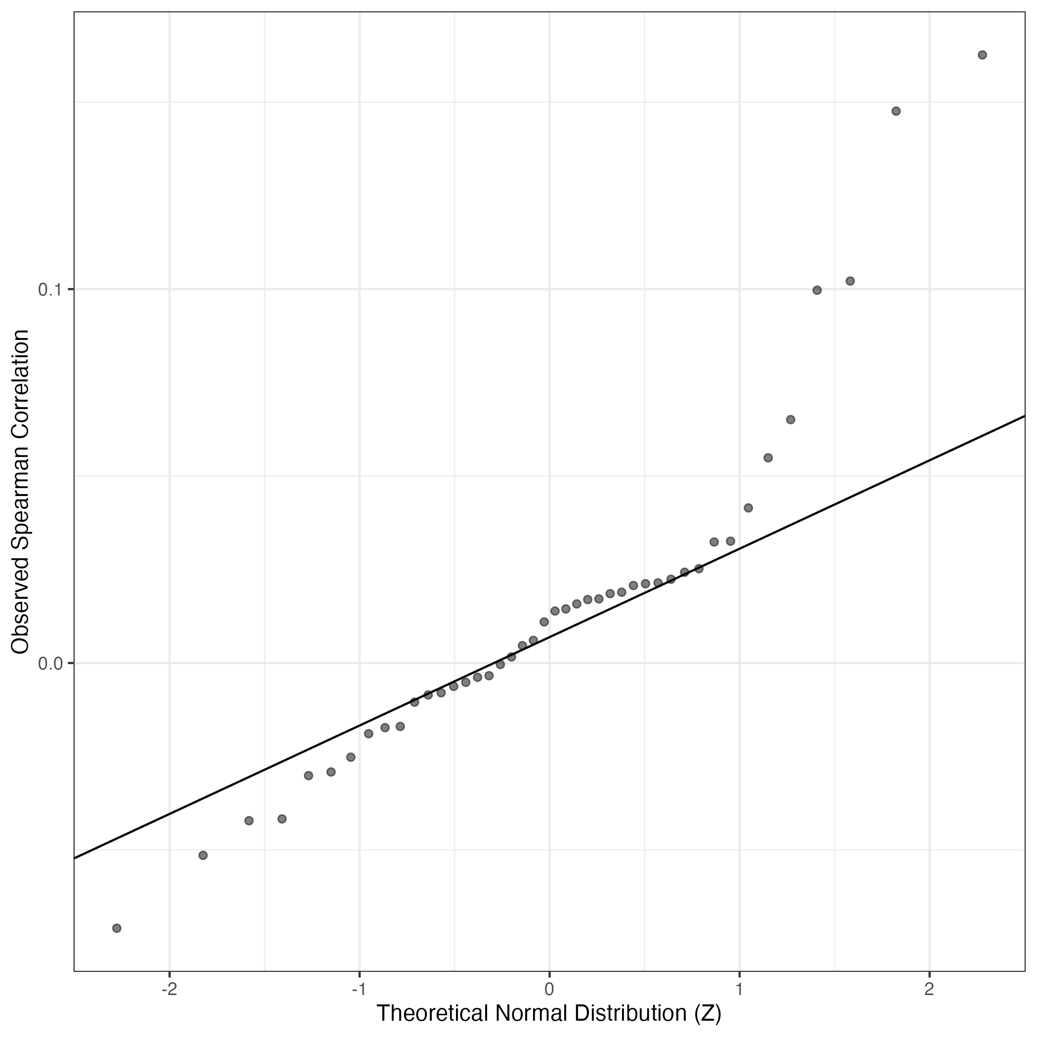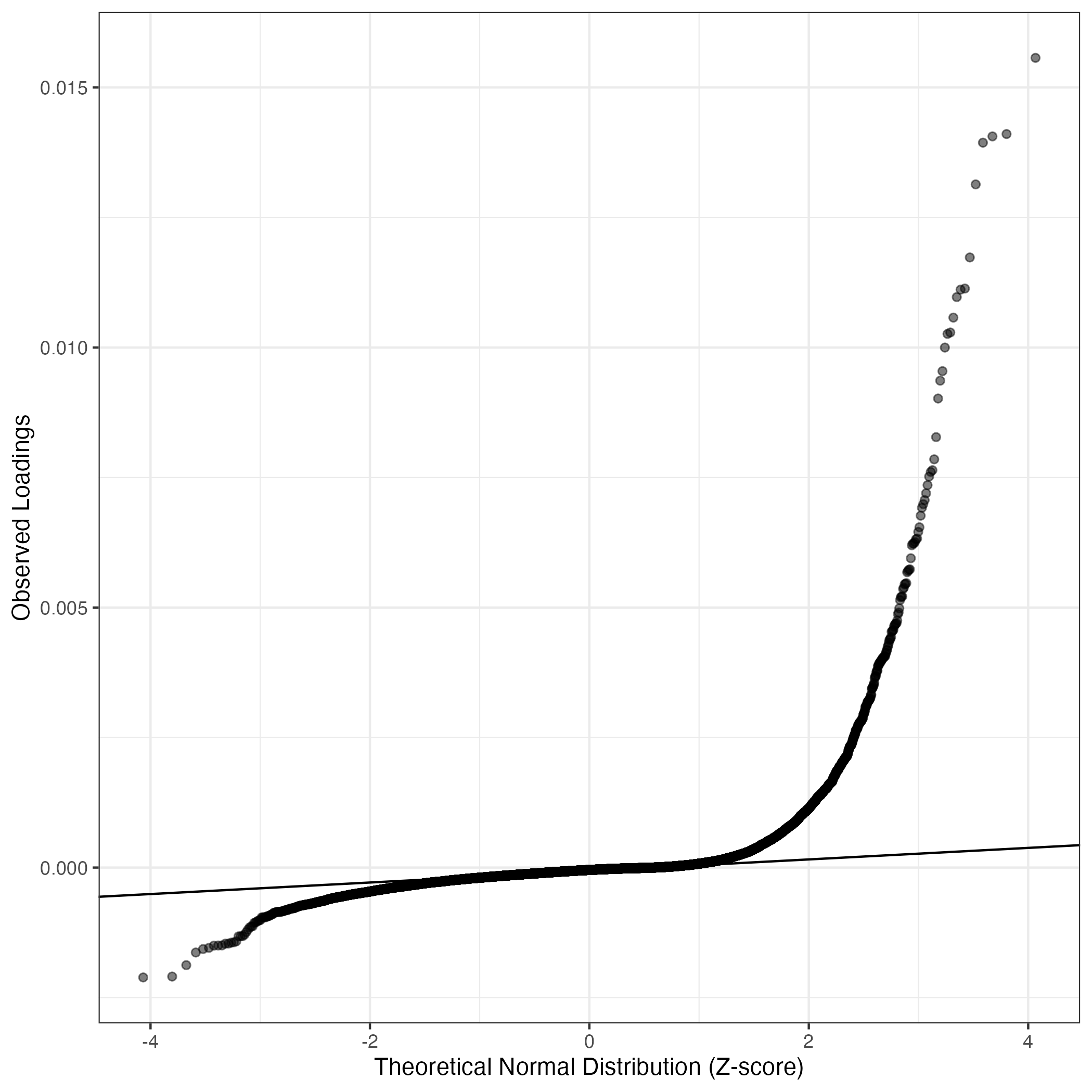 QQ-plot of gene loadings, averaged over both independent splits of the data