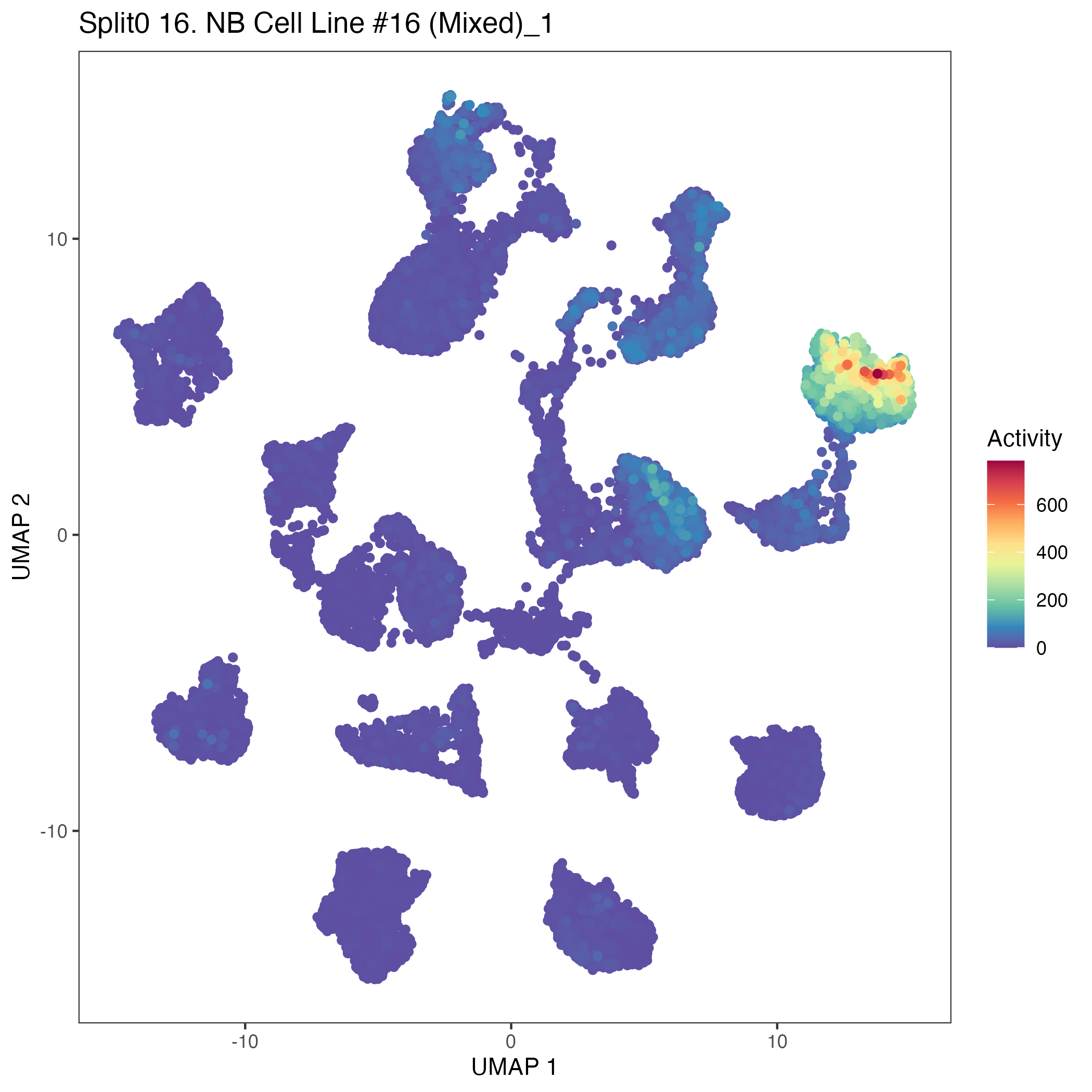 UMAP plots showing activity of gene expression program identified in community:16. NB Cell Line #16 (Mixed)