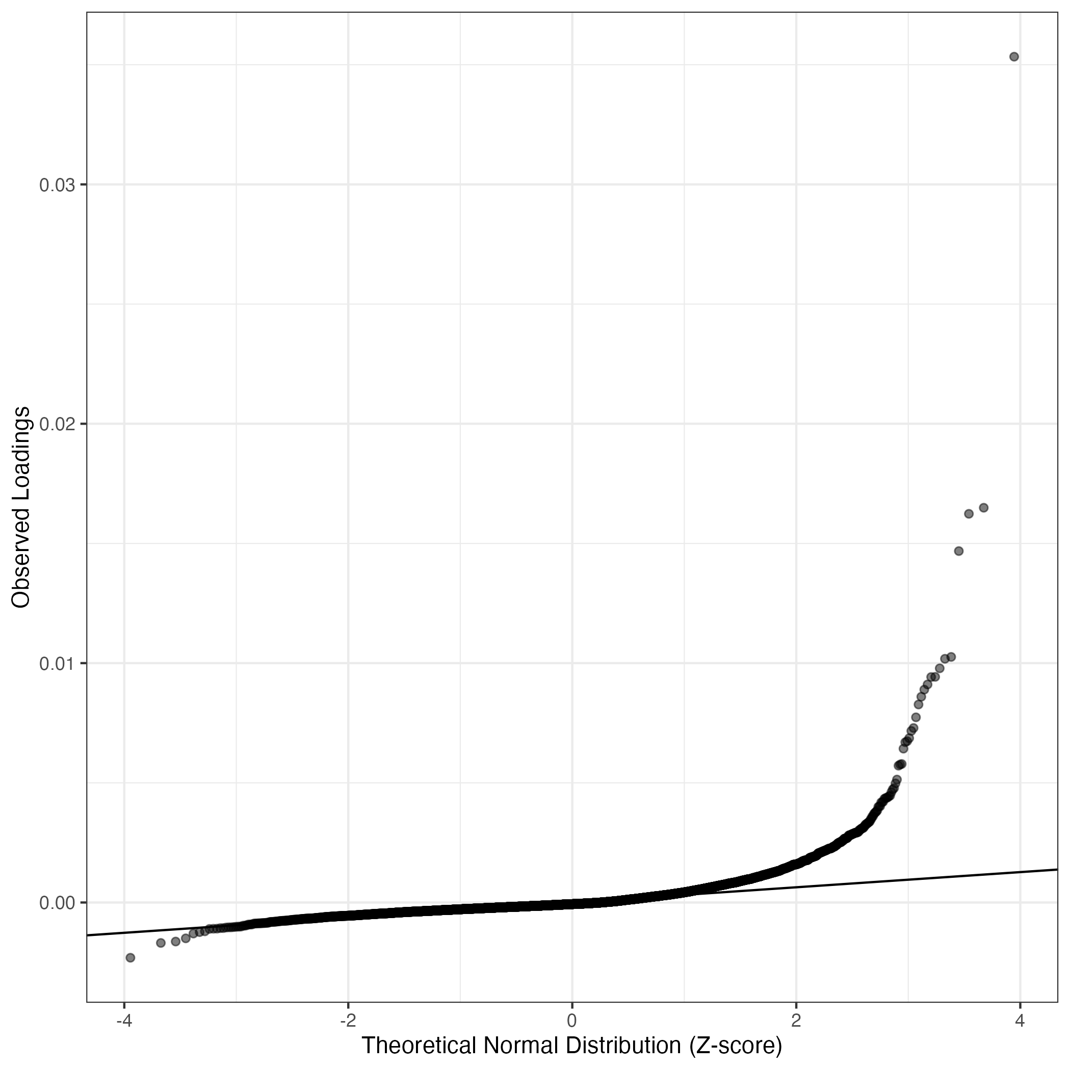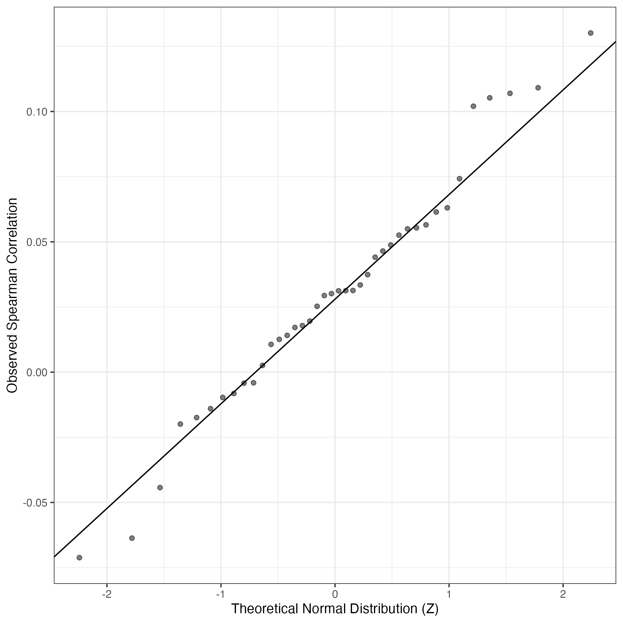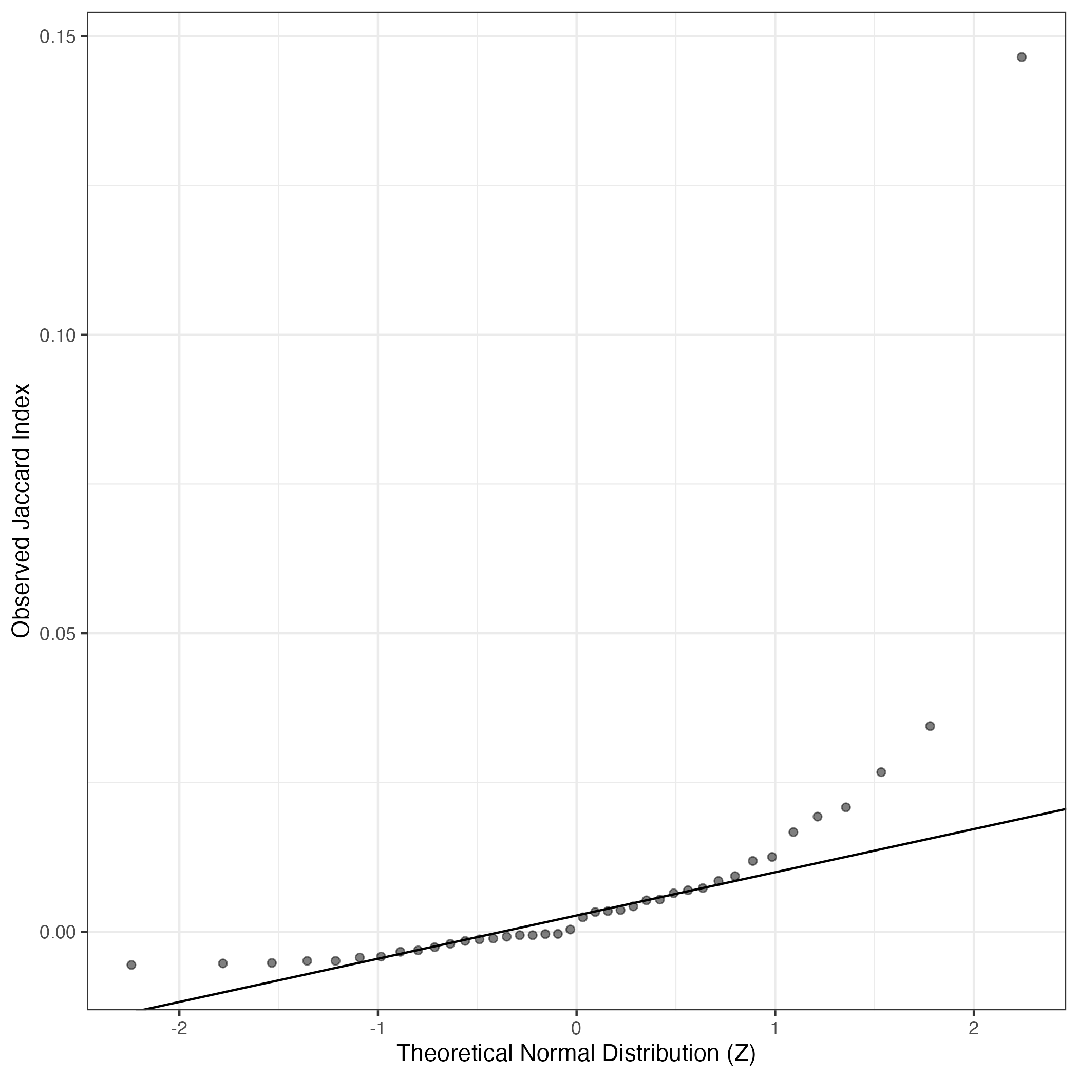 A similar QQ-plot as above, but only for instances where the H value is e.g. > 25, i.e. we are confident that the expression program is active above noise. Agreemenet between these binary vectors is tested using the Jaccard Index, with the P-values calculated by an exact test: