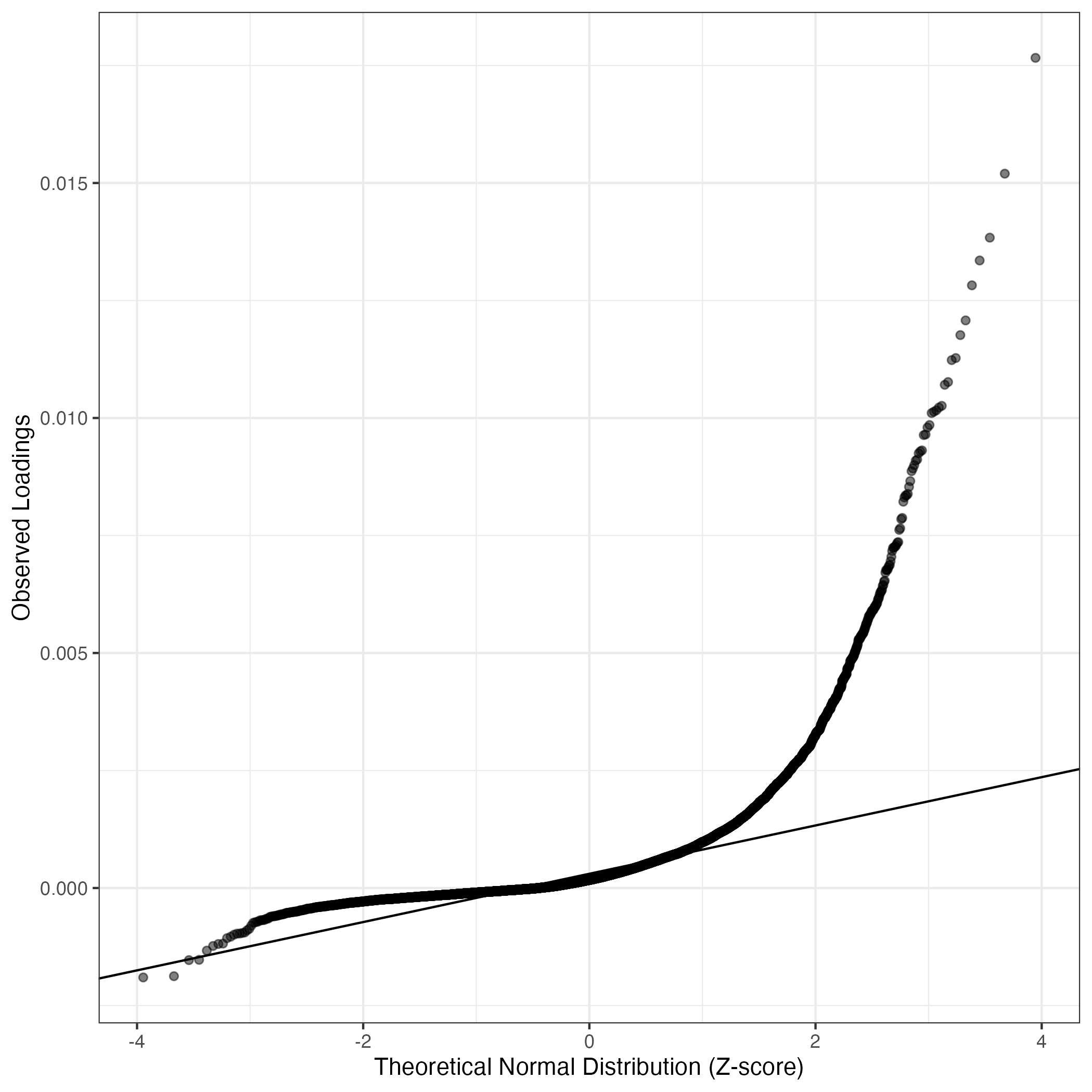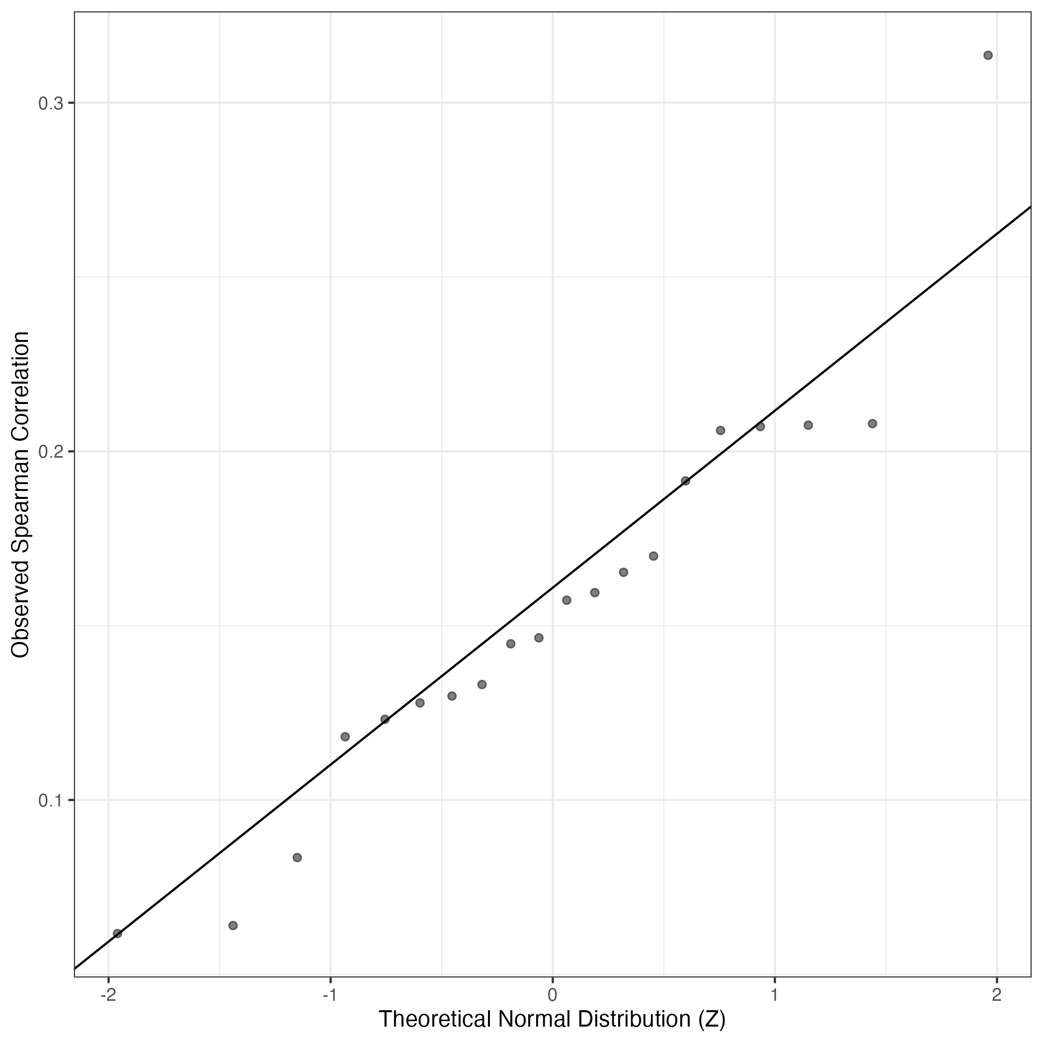 A similar QQ-plot as above, but only for instances where the H value is e.g. > 25, i.e. we are confident that the expression program is active above noise. Agreemenet between these binary vectors is tested using the Jaccard Index, with the P-values calculated by an exact test: