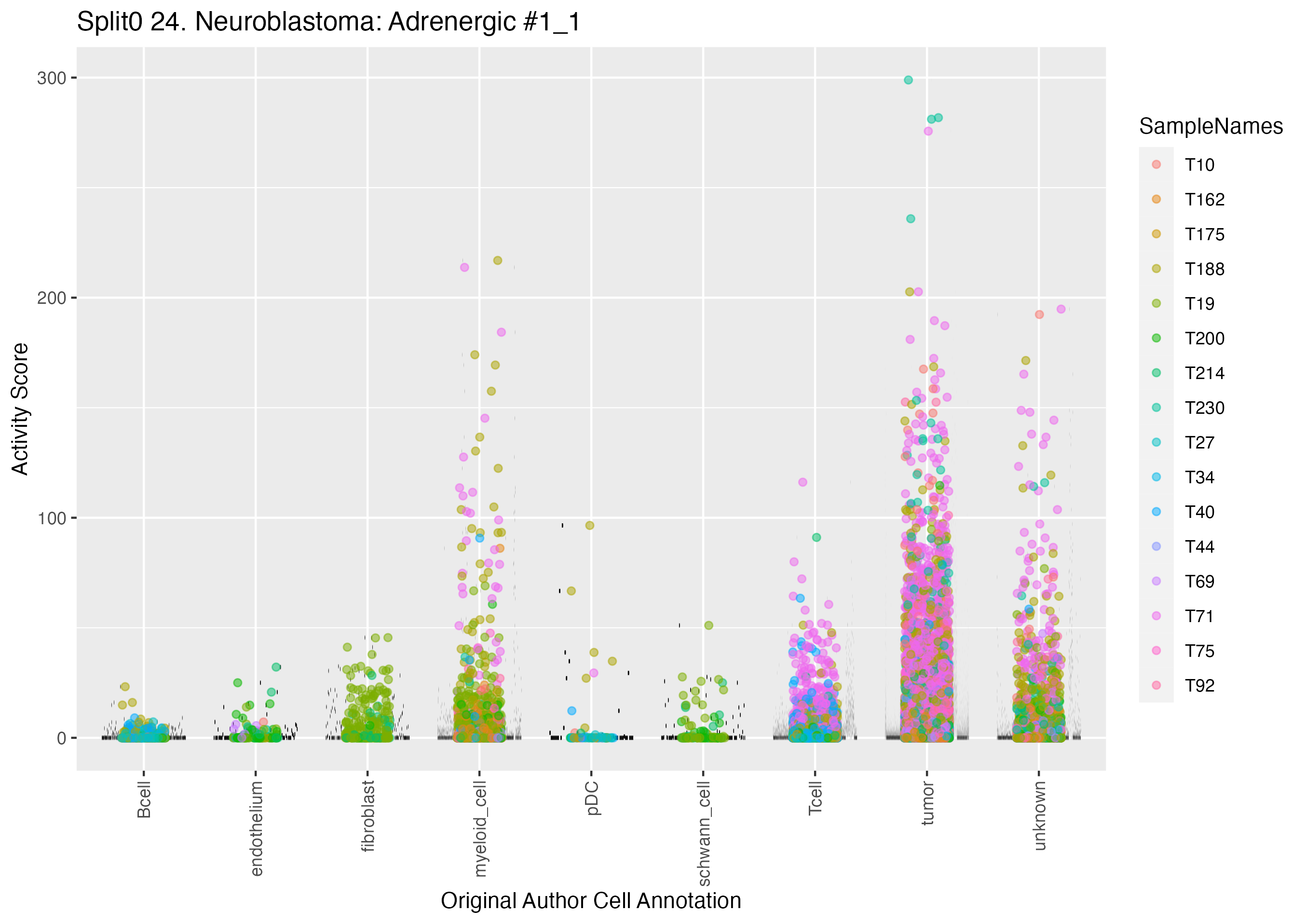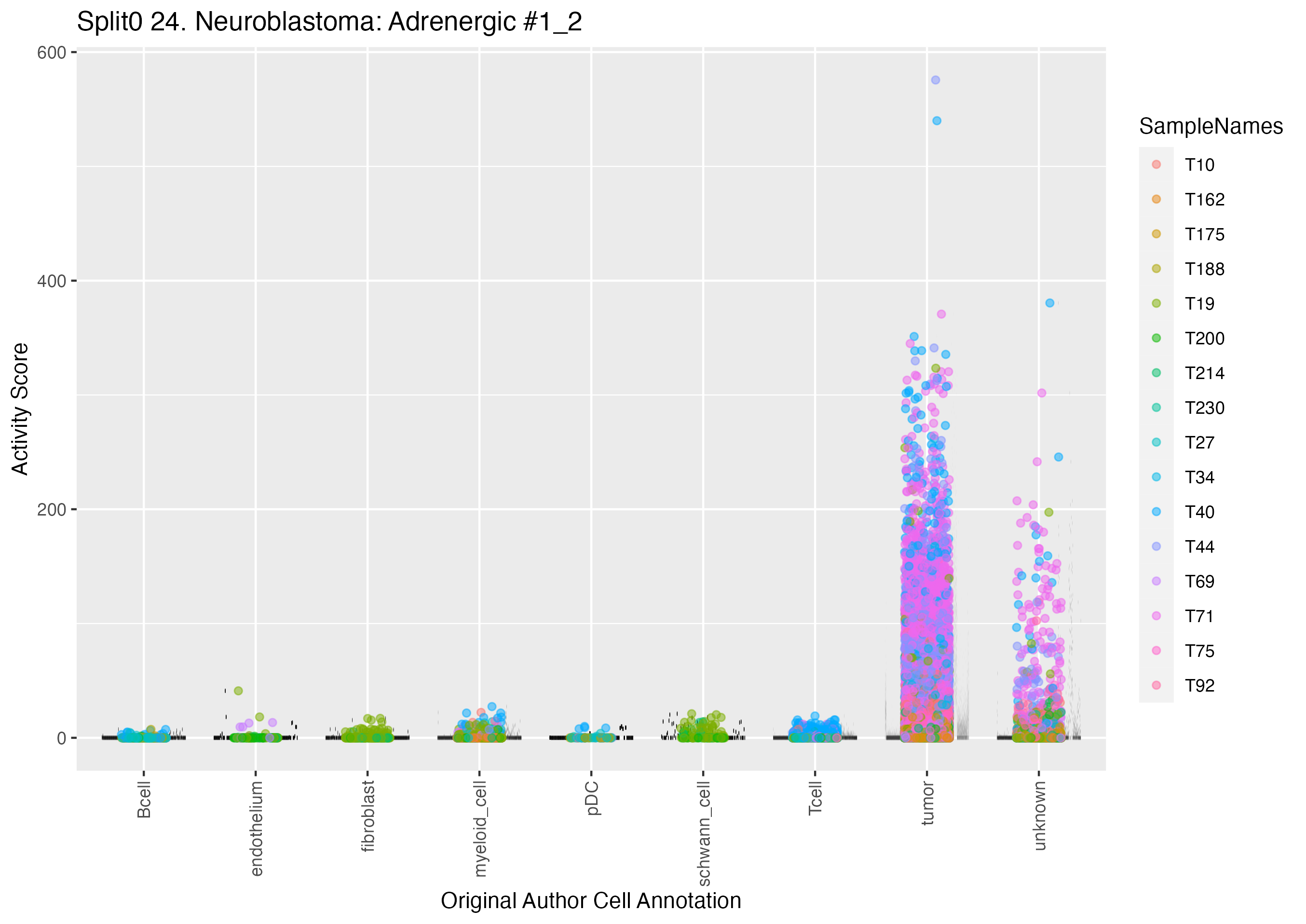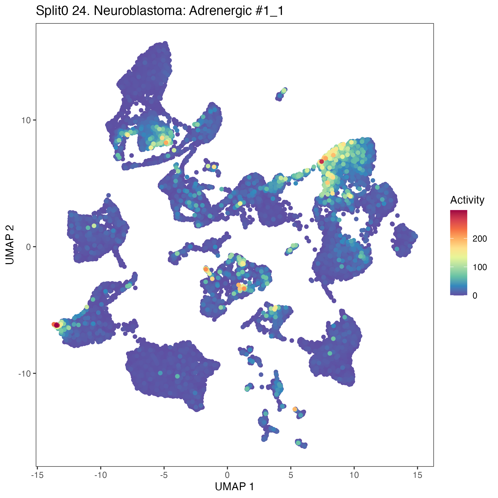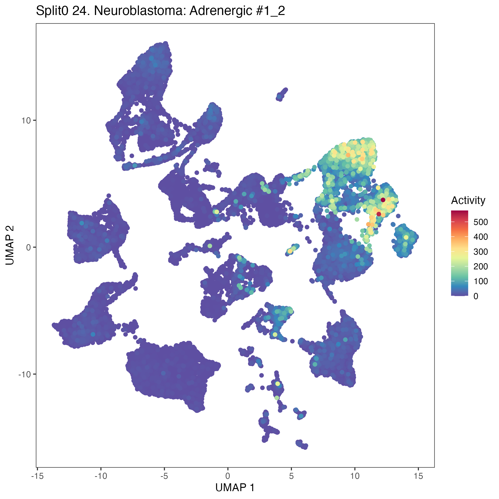 UMAP plots showing activity of gene expression program identified in GEP 24. Neuroblastoma: Adrenergic #1: